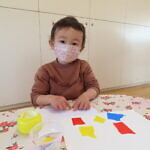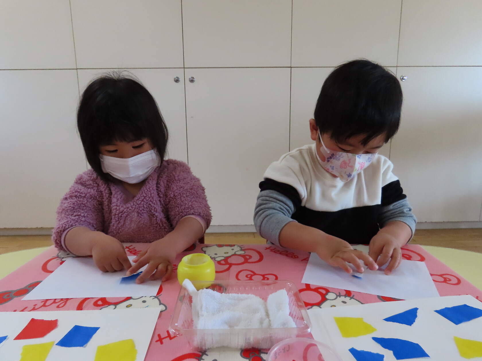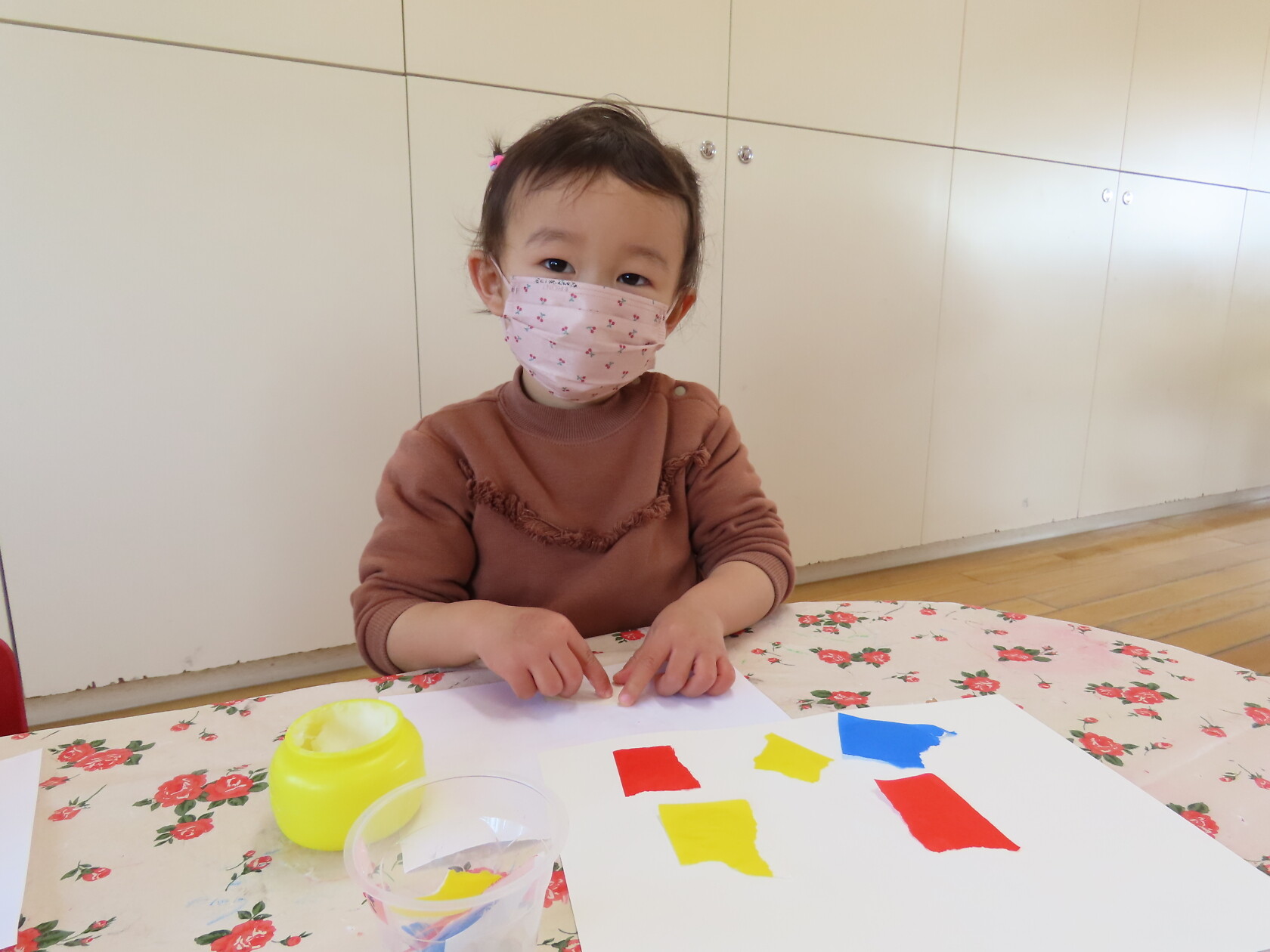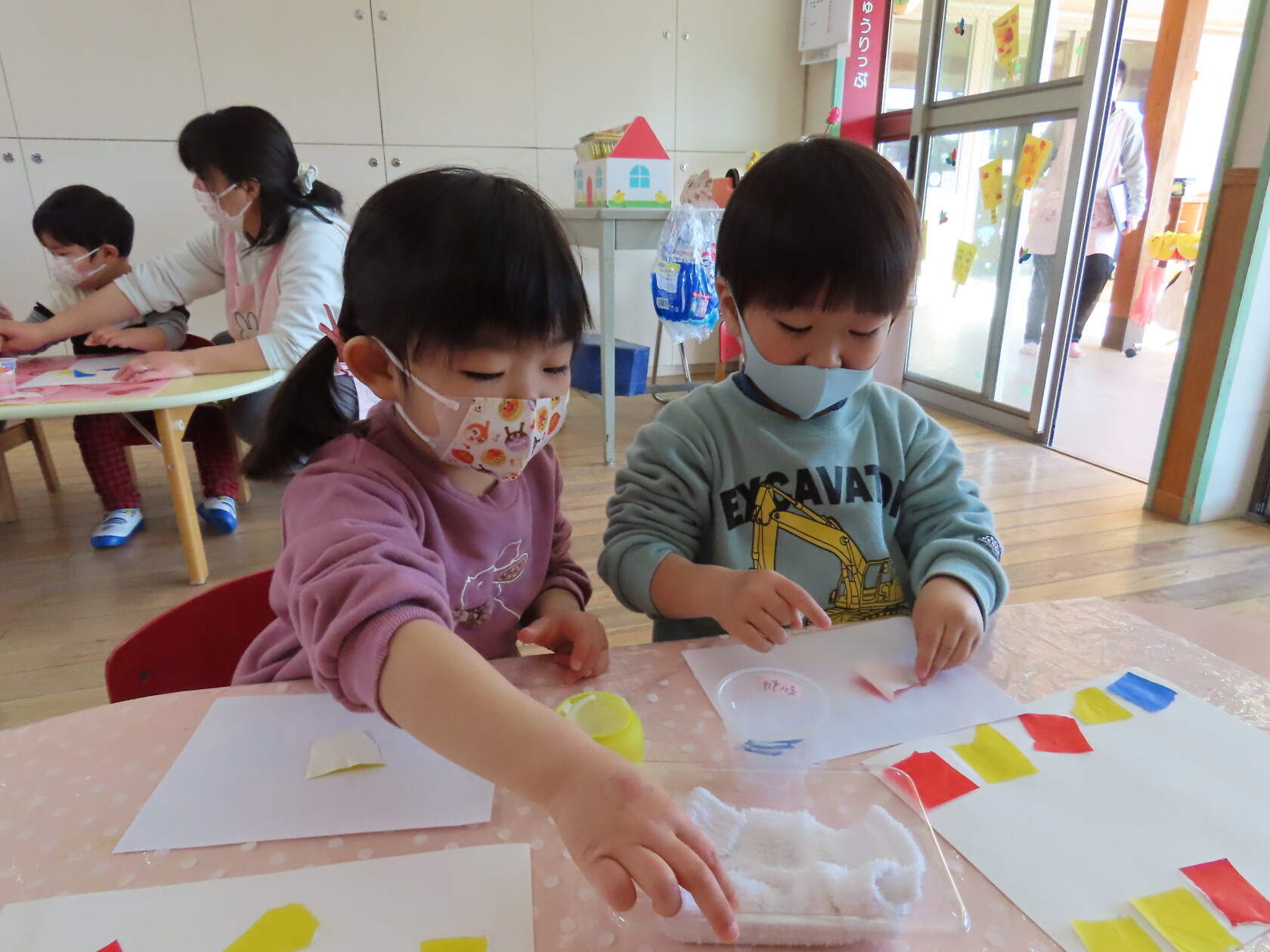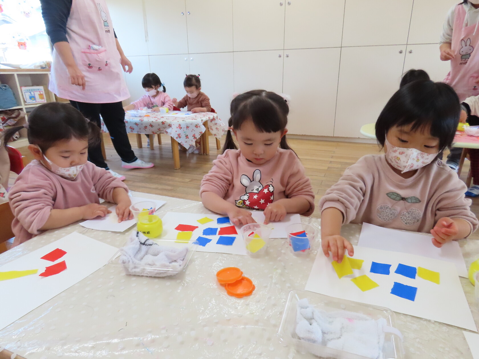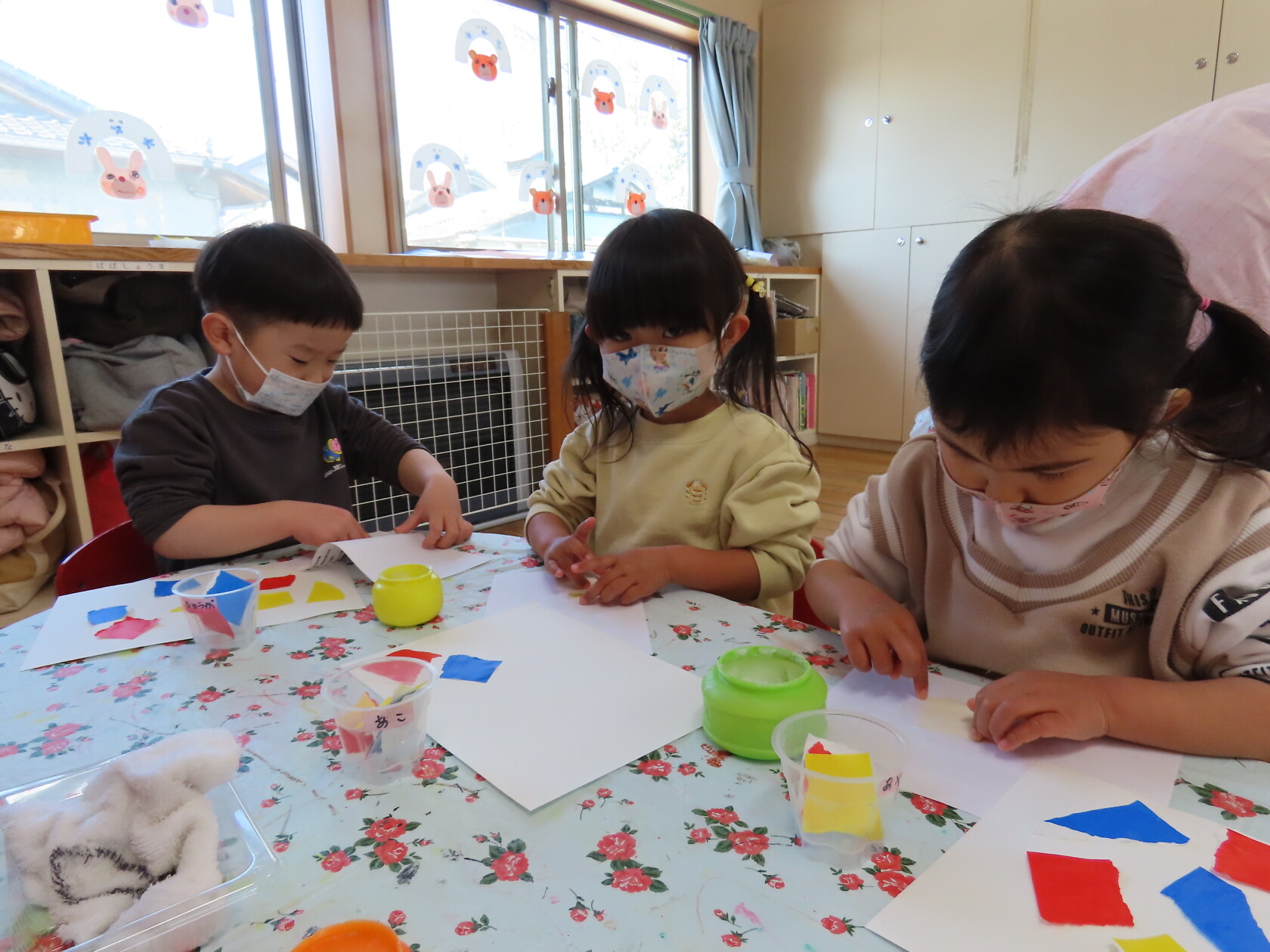 最初にお母さん指を出して、のりの入った入れ物にどのくらいつけたら良いか、ちぎった折り紙のどこにのりをつけるか、つけた折り紙をどう貼るか、の説明を聞いて、その後自分の好きなようにベタベタとつけて貼りだし、すばらしい貼り絵ができました‼😊