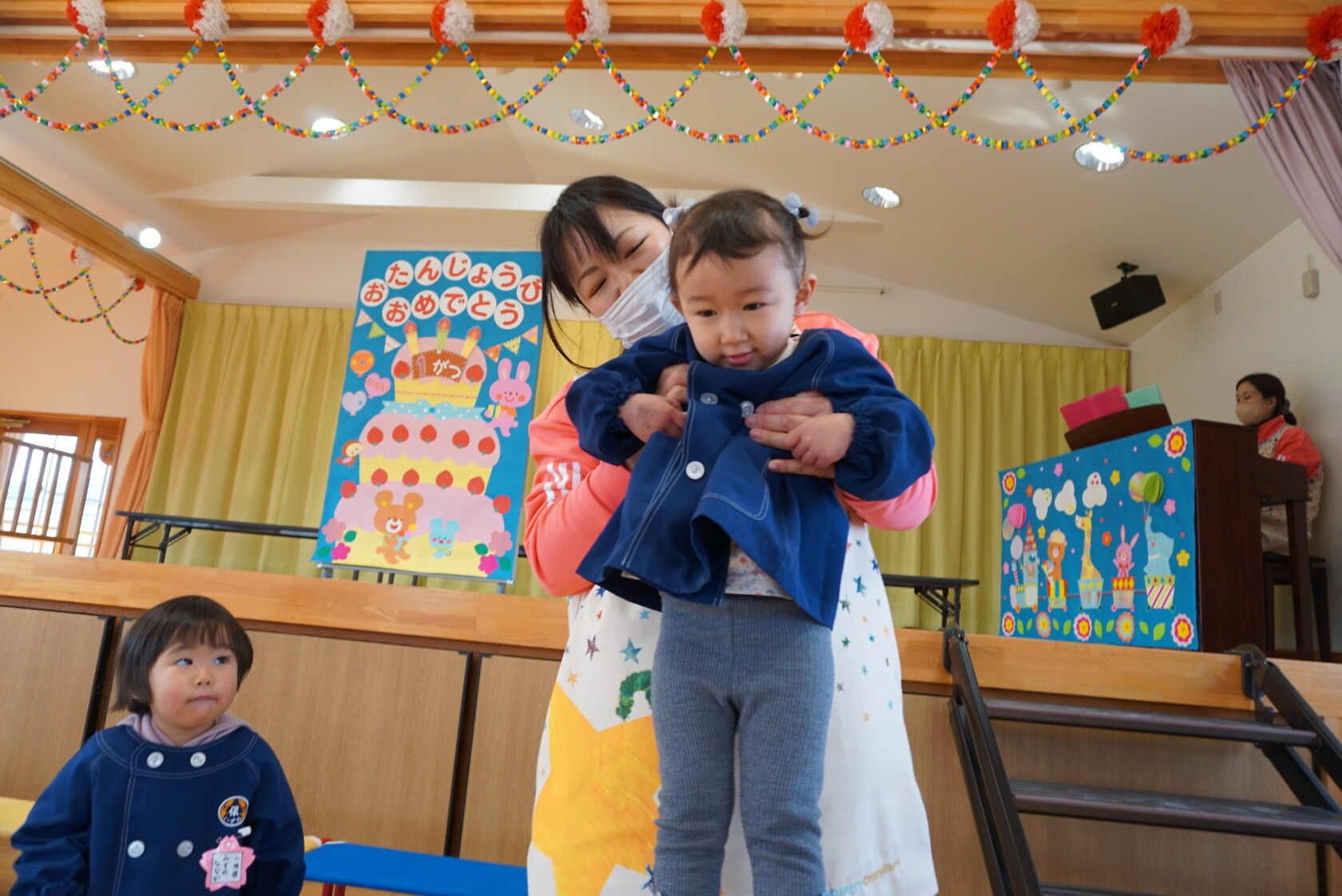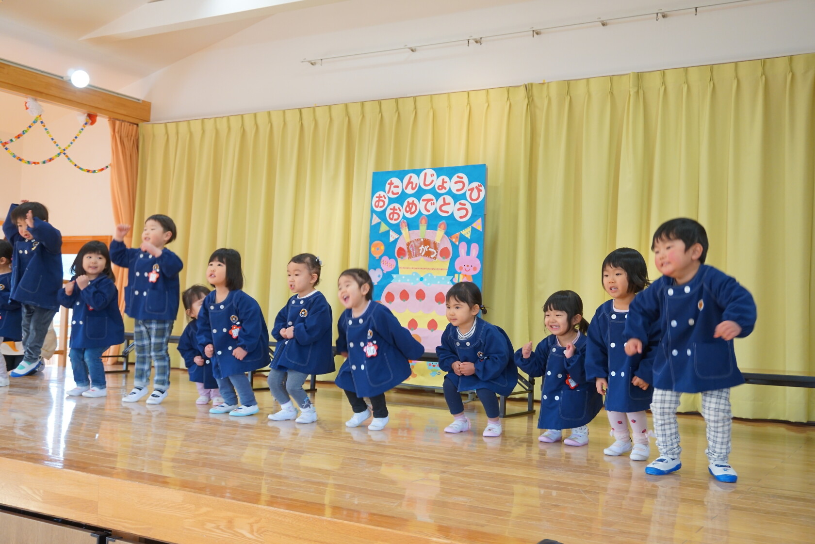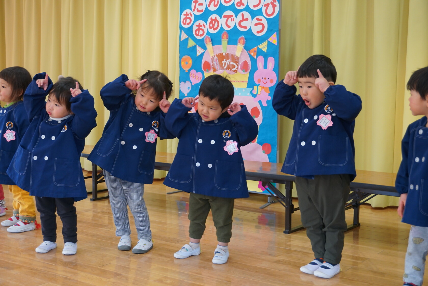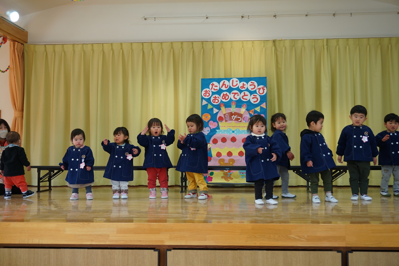 お誕生会(未満児) 公開済み: 2023年1月25日更新: 2023年1月25日 今日は、1月生まれのお友達のお誕生会がありました✨ 今月は、6名のお友達をお祝いしました😆お名前を呼ばれ恥ずかしそうに前へ出ますが、沢山のお友達に「おめでとう‼👏」とお祝いされ、とても嬉しそうでした😌 各クラスからの歌のプレゼントは、 小規模さくら「豆まき」、「雪だるまのチャチャチャ」 さくら「豆まき」、「ゆきのこぼうず」 ちゅうりっぷ、小規模ちゅうりっぷ「雪」、「げんきなうんちたいそう」を歌いました🎵 どのクラスも大きな声で歌い、堂々と踊りながら、とっても可愛らしい発表でした✨ 1月生まれのお友達、お誕生日おめでとうございます❣❣