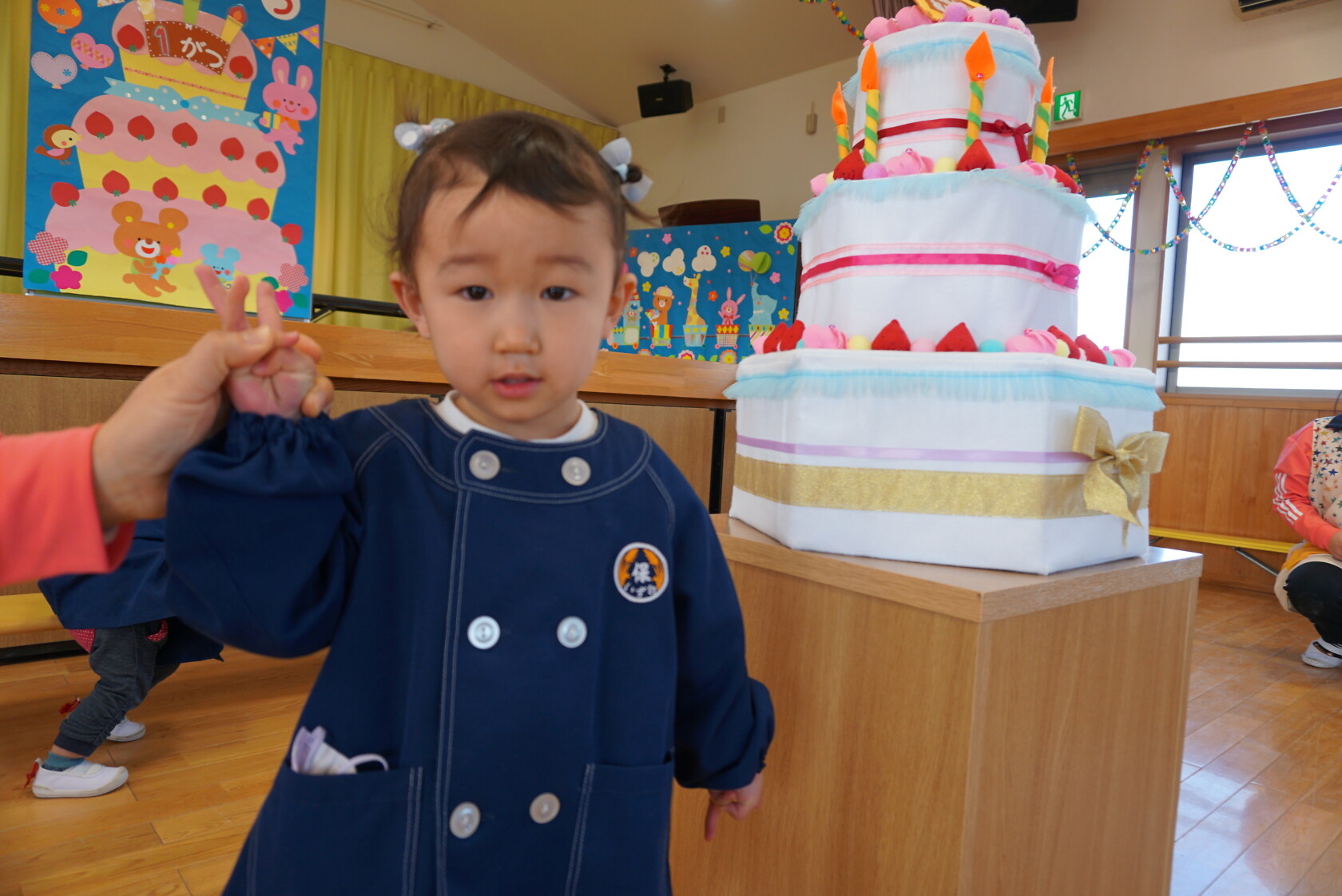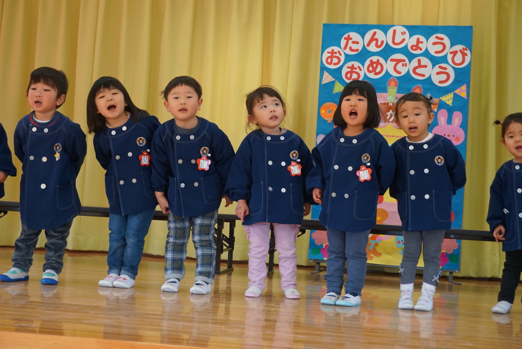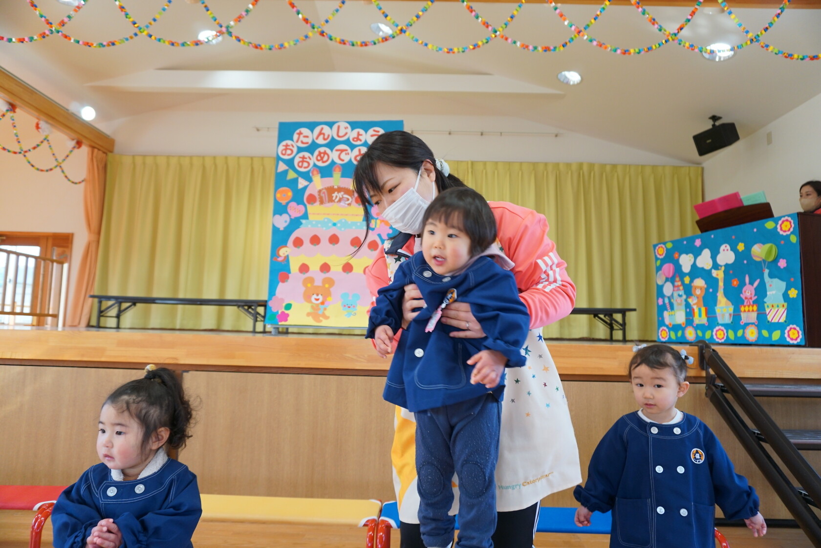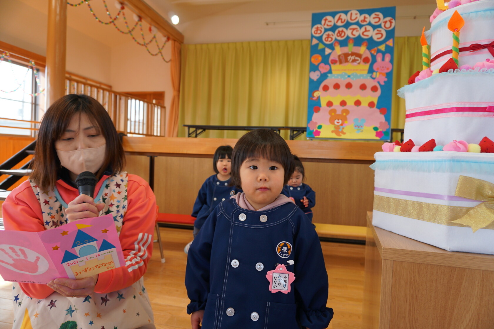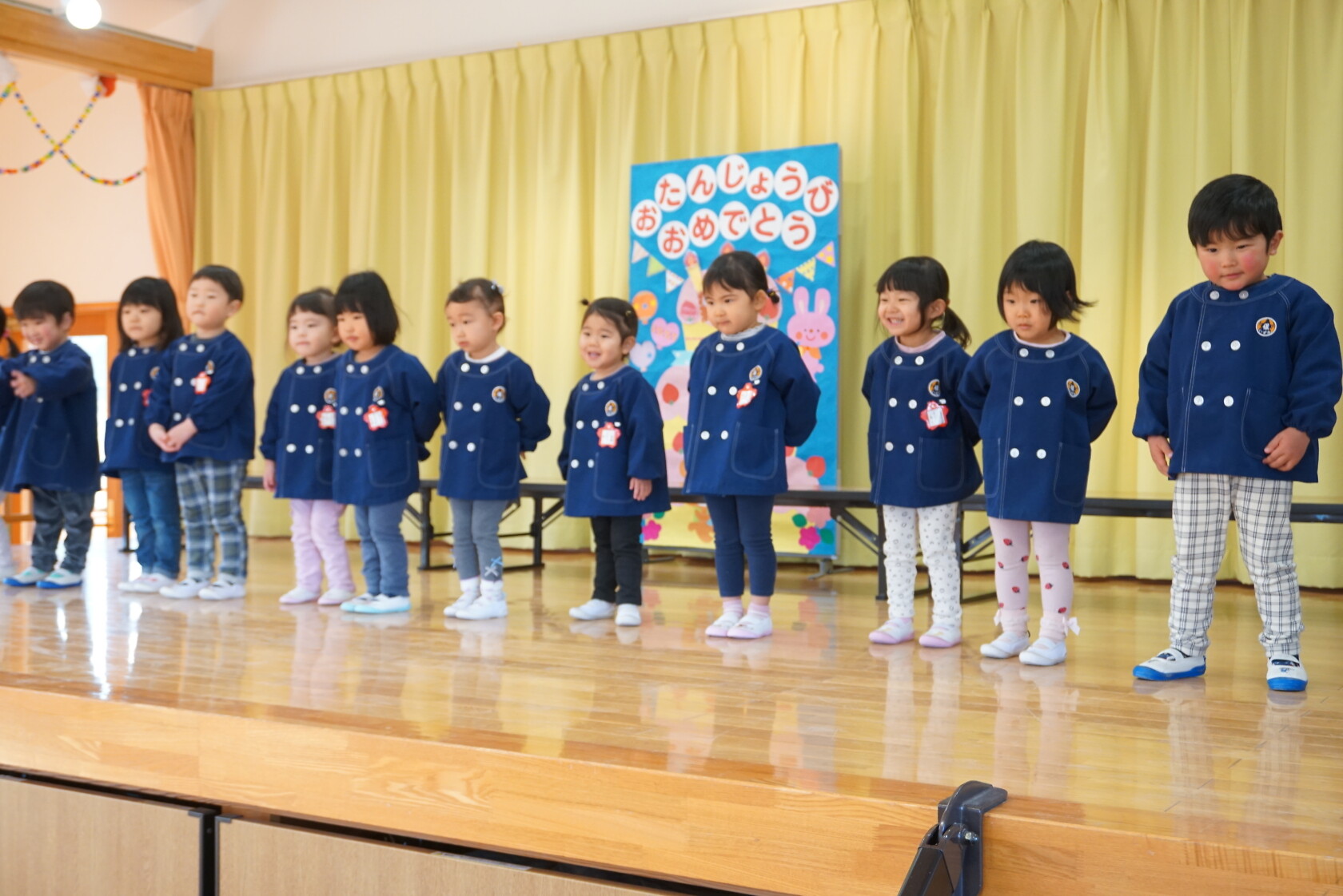 お誕生会(未満児) 公開済み: 2023年1月25日更新: 2023年1月25日 今日は、1月生まれのお友達のお誕生会がありました✨ 今月は、6名のお友達をお祝いしました😆お名前を呼ばれ恥ずかしそうに前へ出ますが、沢山のお友達に「おめでとう‼👏」とお祝いされ、とても嬉しそうでした😌 各クラスからの歌のプレゼントは、 小規模さくら「豆まき」、「雪だるまのチャチャチャ」 さくら「豆まき」、「ゆきのこぼうず」 ちゅうりっぷ、小規模ちゅうりっぷ「雪」、「げんきなうんちたいそう」を歌いました🎵 どのクラスも大きな声で歌い、堂々と踊りながら、とっても可愛らしい発表でした✨ 1月生まれのお友達、お誕生日おめでとうございます❣❣