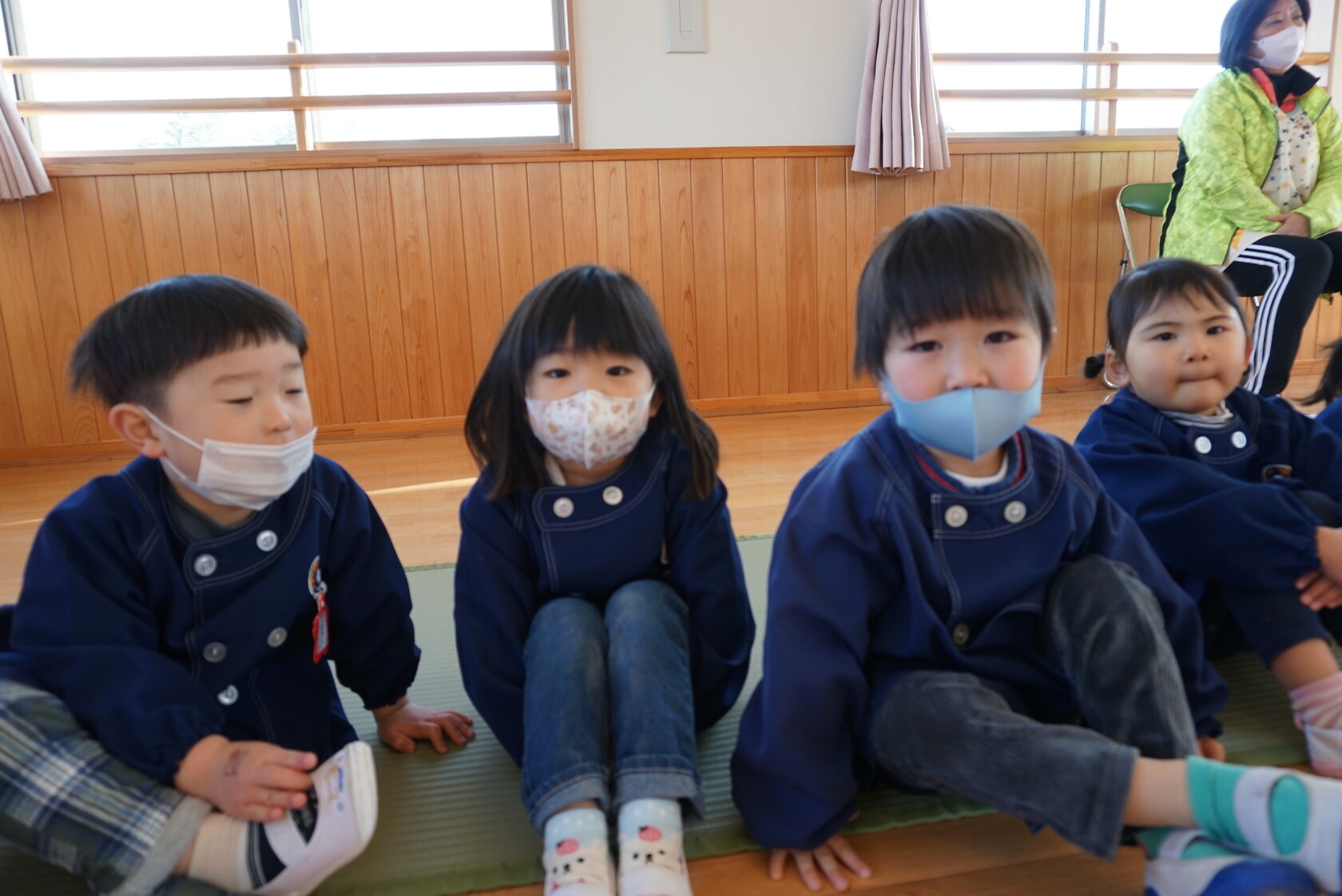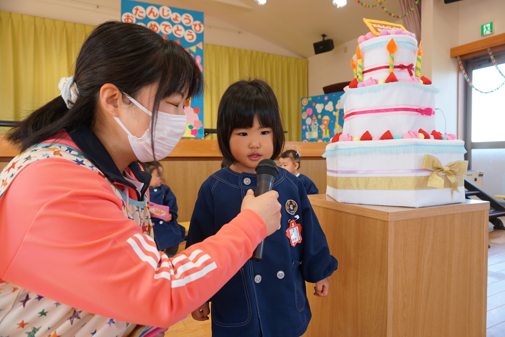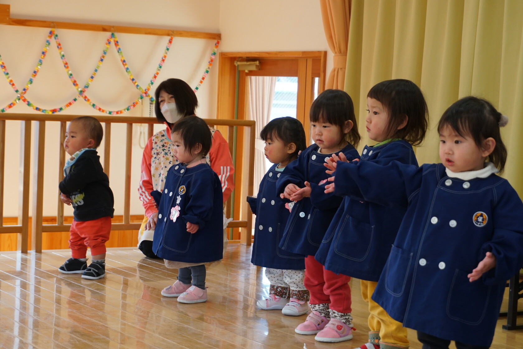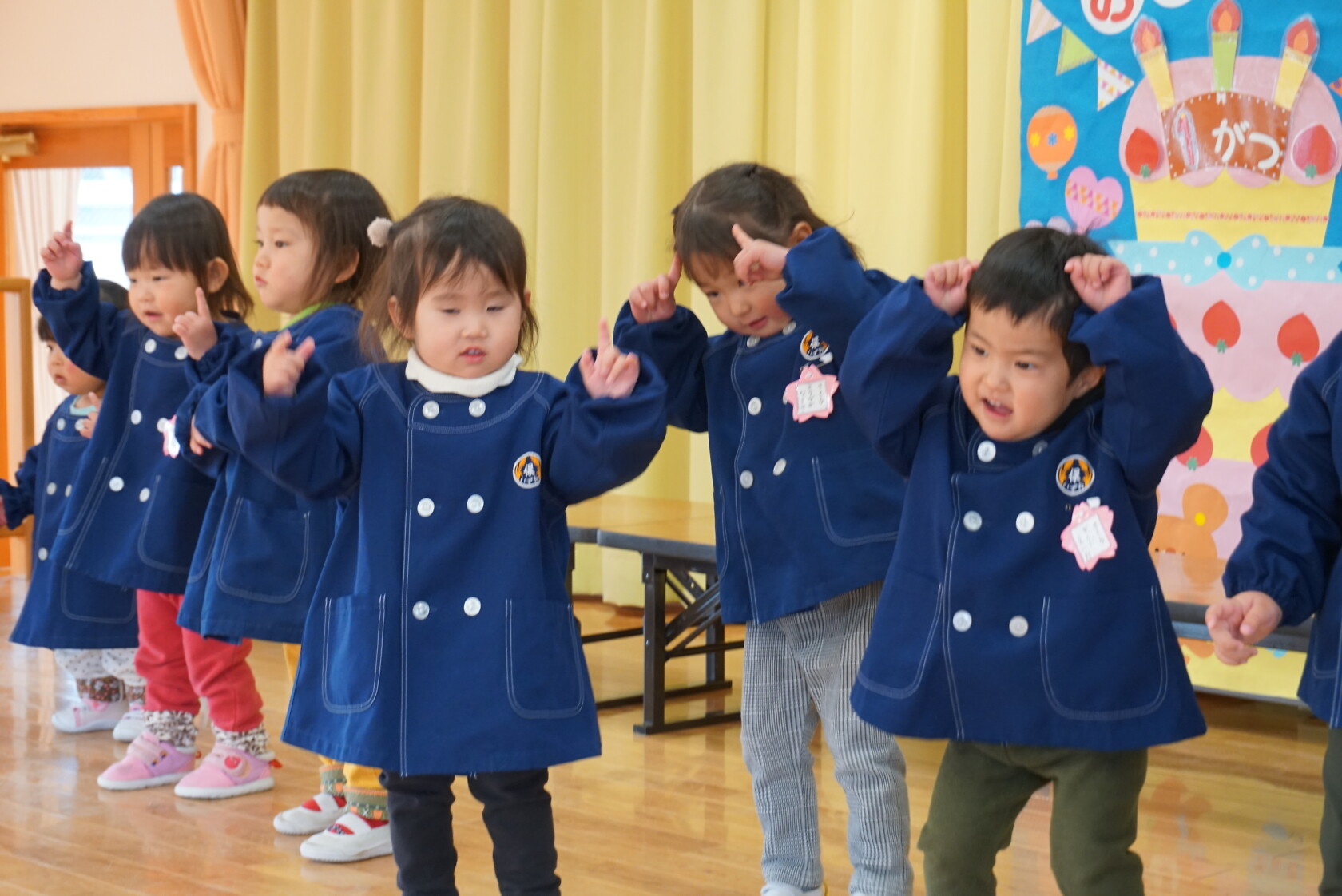 お誕生会(未満児) 公開済み: 2023年1月25日更新: 2023年1月25日 今日は、1月生まれのお友達のお誕生会がありました✨ 今月は、6名のお友達をお祝いしました😆お名前を呼ばれ恥ずかしそうに前へ出ますが、沢山のお友達に「おめでとう‼👏」とお祝いされ、とても嬉しそうでした😌 各クラスからの歌のプレゼントは、 小規模さくら「豆まき」、「雪だるまのチャチャチャ」 さくら「豆まき」、「ゆきのこぼうず」 ちゅうりっぷ、小規模ちゅうりっぷ「雪」、「げんきなうんちたいそう」を歌いました🎵 どのクラスも大きな声で歌い、堂々と踊りながら、とっても可愛らしい発表でした✨ 1月生まれのお友達、お誕生日おめでとうございます❣❣