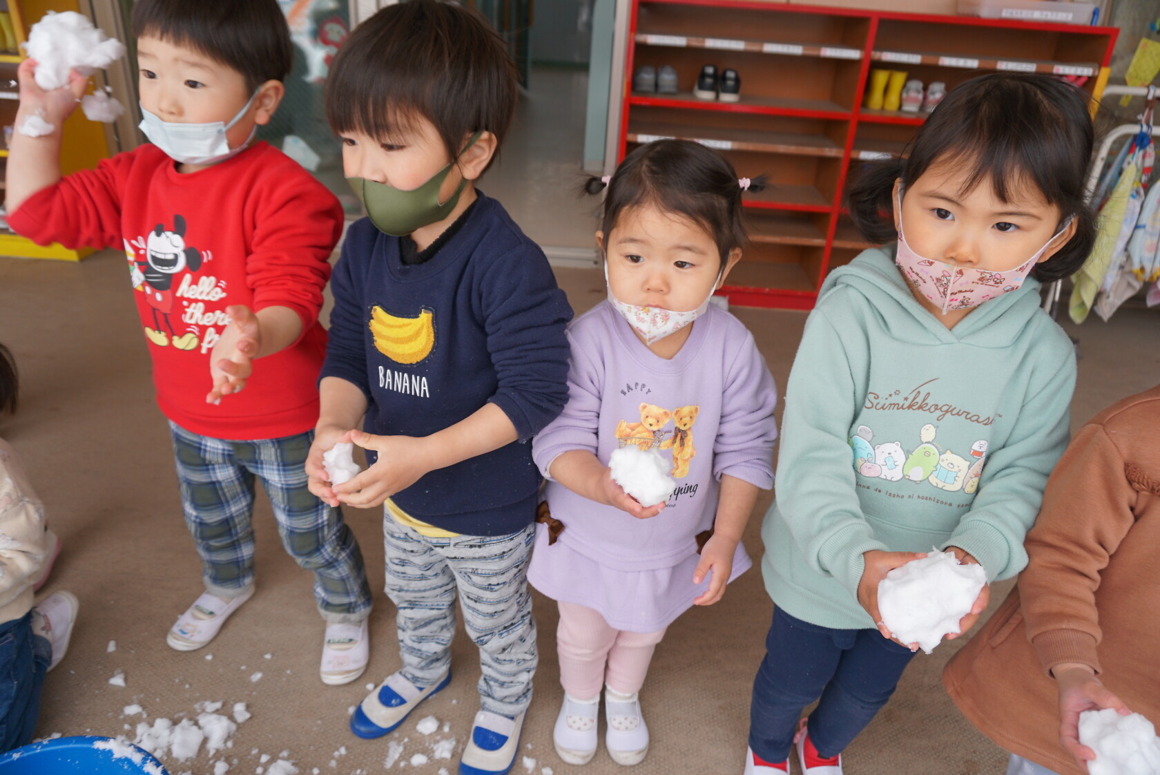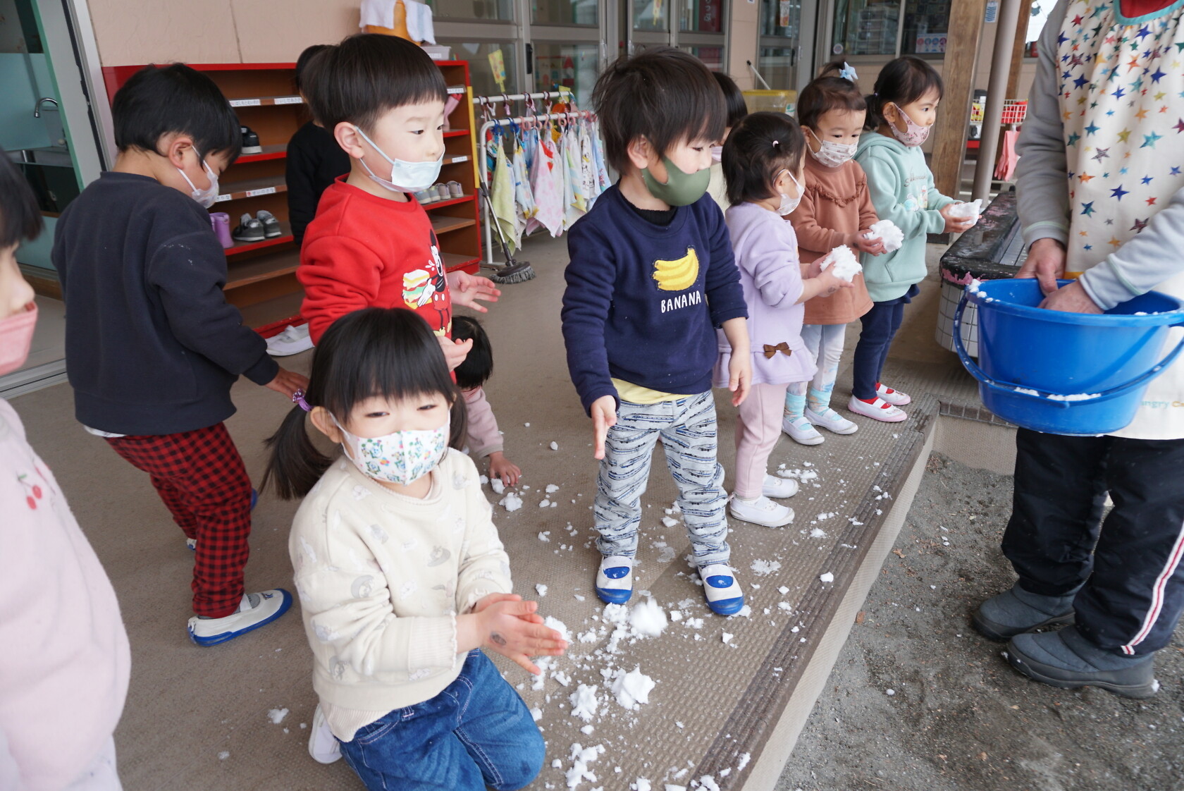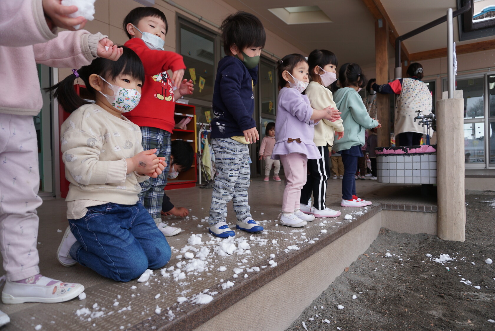 テラスに出て雪を触ってみると、「うわ~っ!!✨」と目を輝かせ、雪を丸めたり投げてみたり、楽しそうな子ども達でした🎵