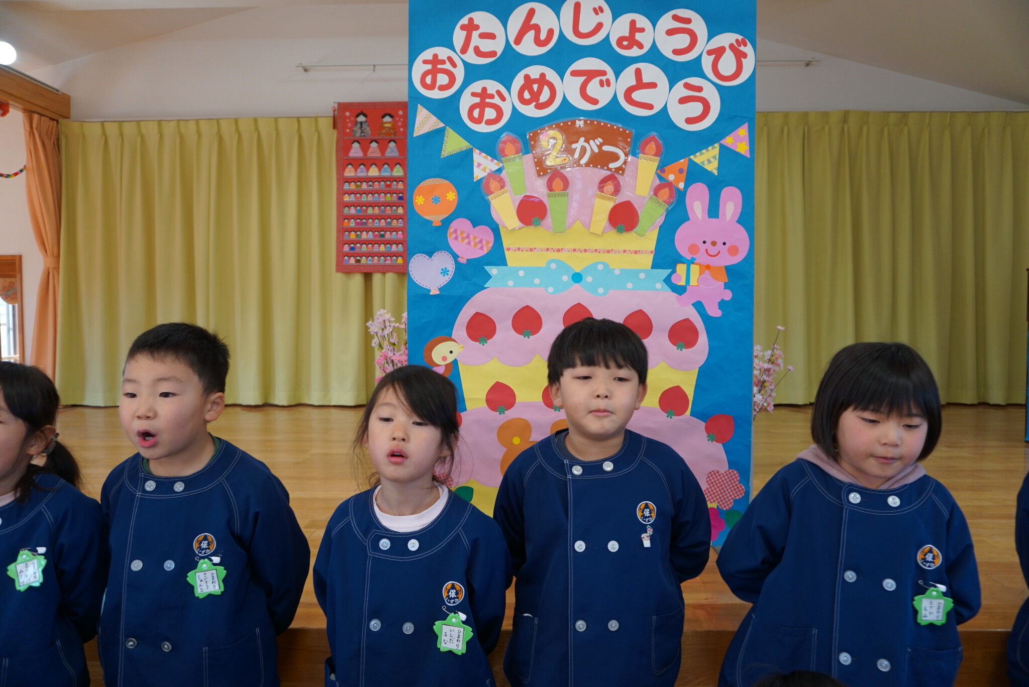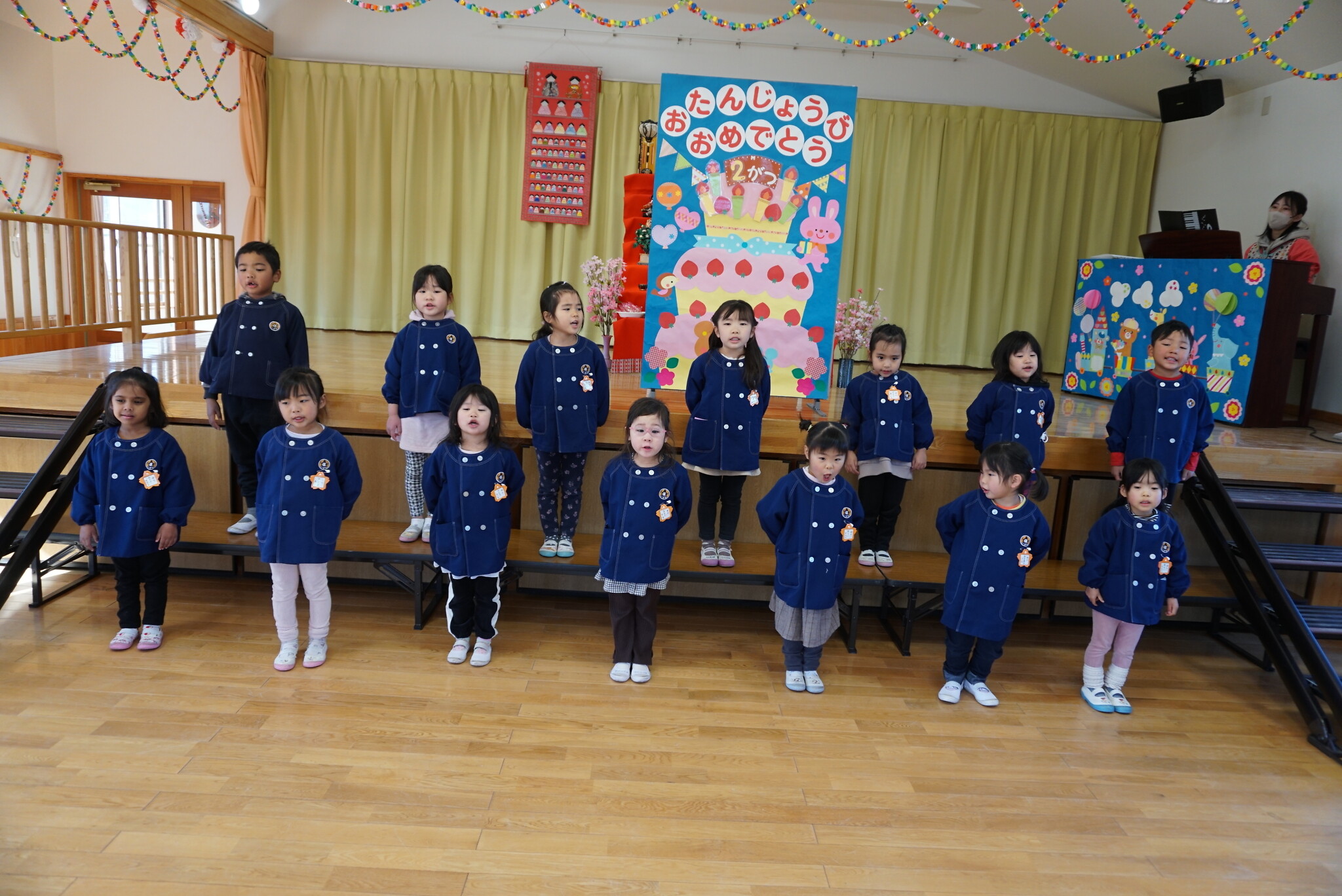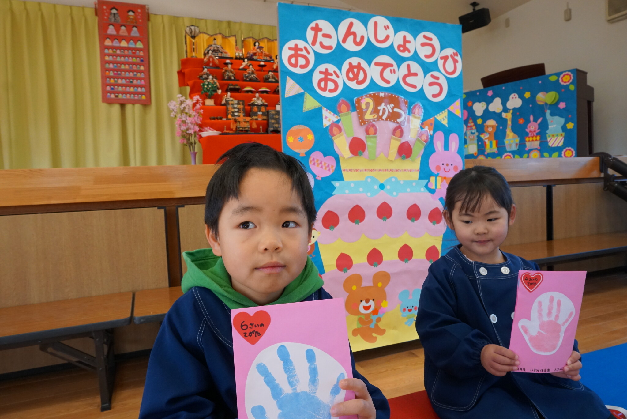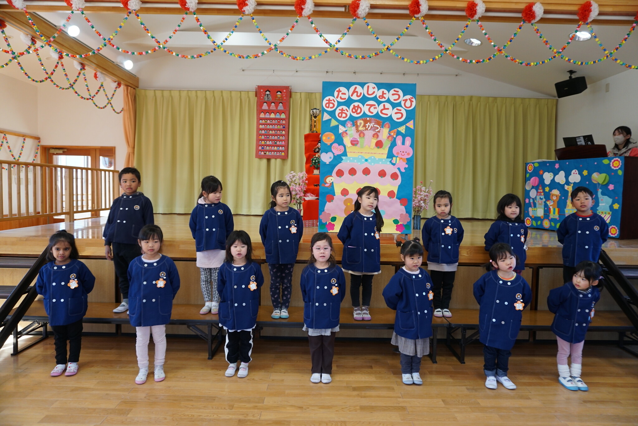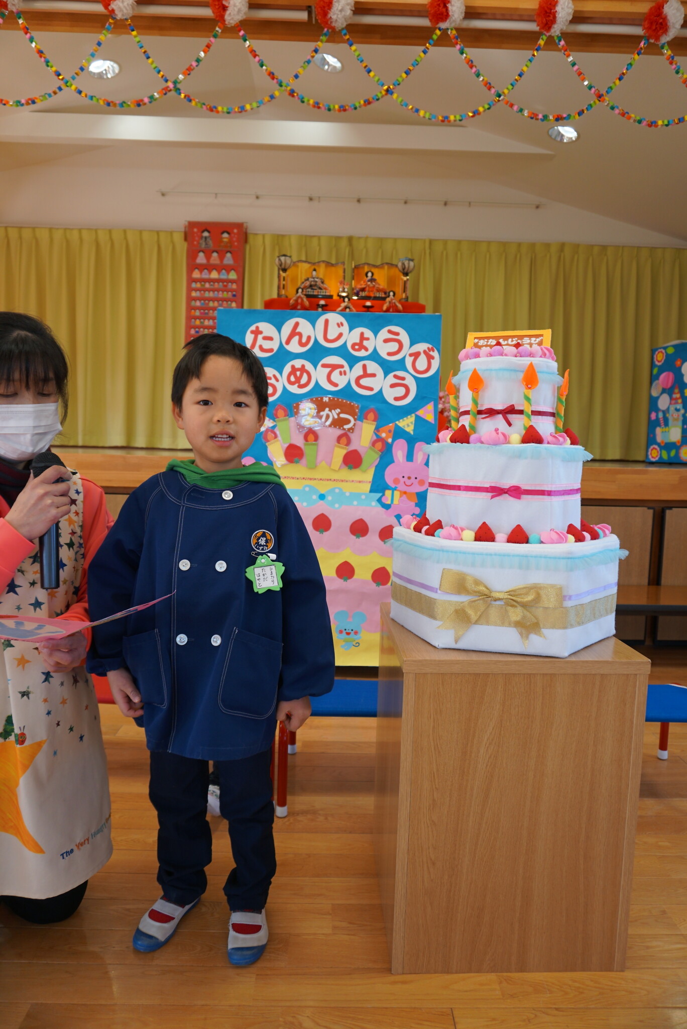 お誕生会(以上児) 公開済み: 2023年2月22日更新: 2023年2月22日 今日は2月生まれのお誕生会がありました! ひまわり組1人、すみれ組1人でした。2人は名前が呼ばれると大きな声で返事が出来ました😊 又、保育士からのお誕生カードのプレゼントはとても嬉しそうで、手元のカードの写真や手型を何度も見返していました😁 お歌のプレゼントでは、 すみれ組「ふしぎなポケット」「こねこのパンやさん」 ゆり組「雪祭」「地球の歌」 ひまわり組「みんなおおきくなった」「たいせつなたからもの」でした! 2月うまれのおともだちお誕生日おめでとうございます!!