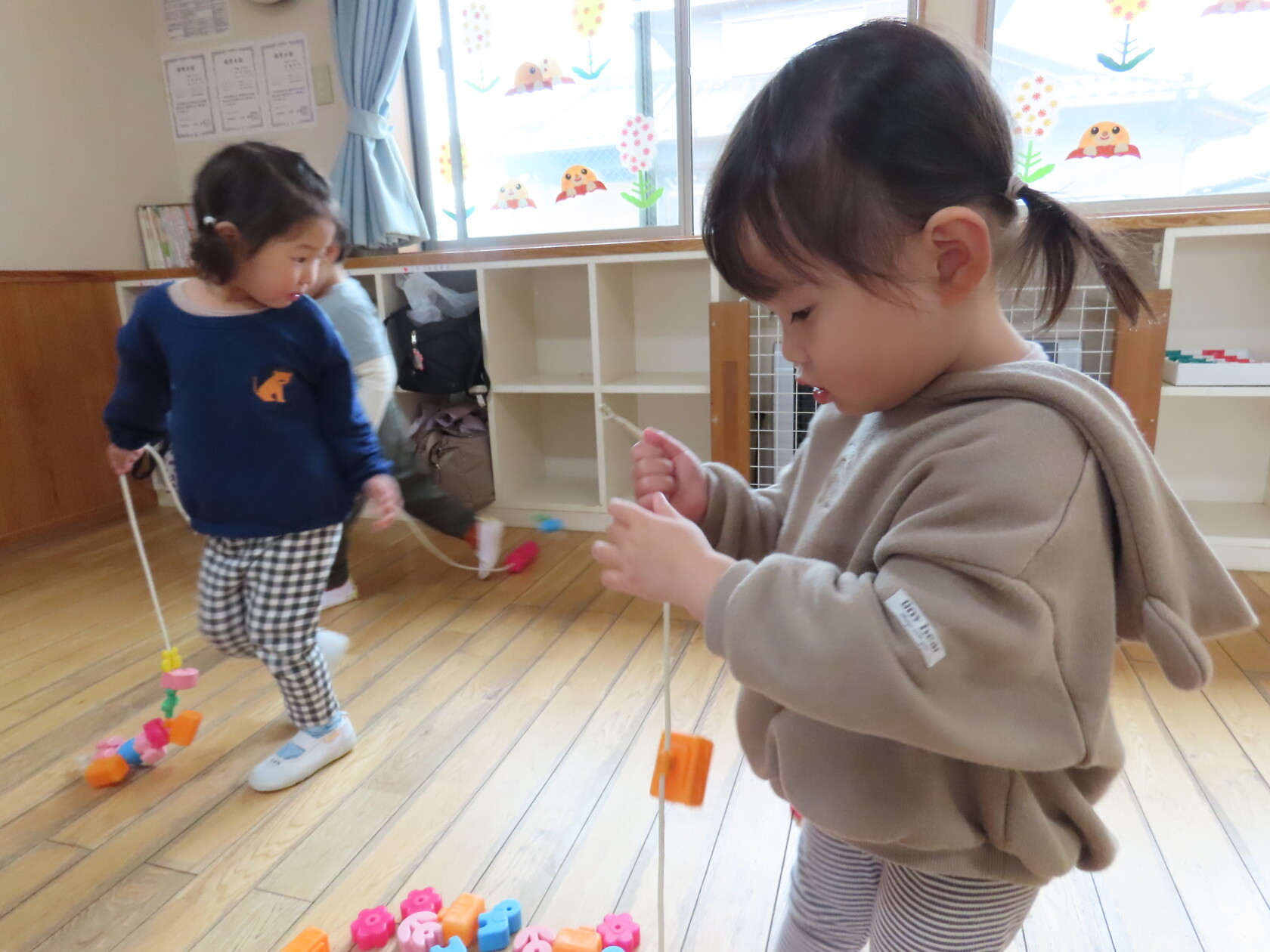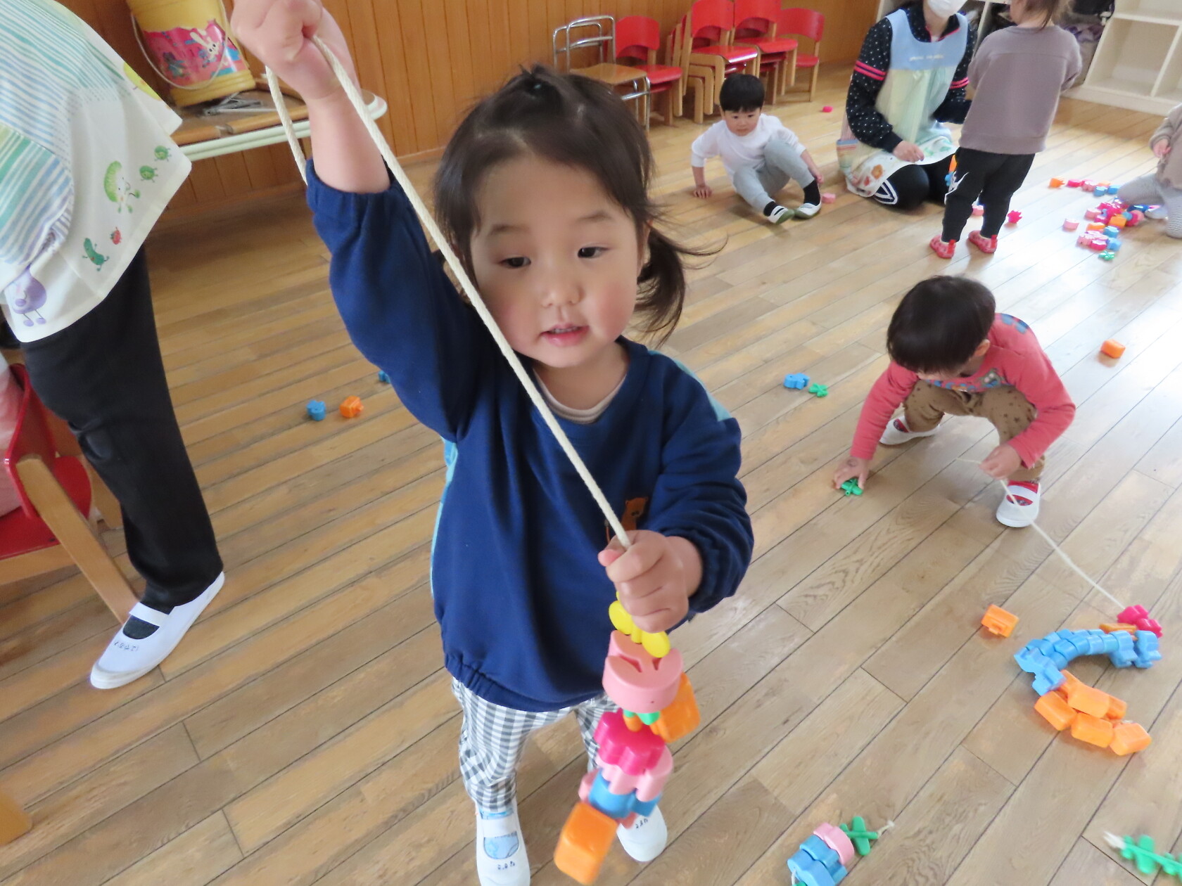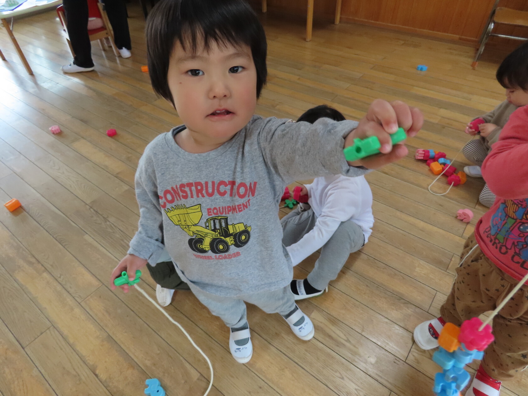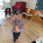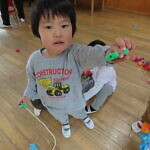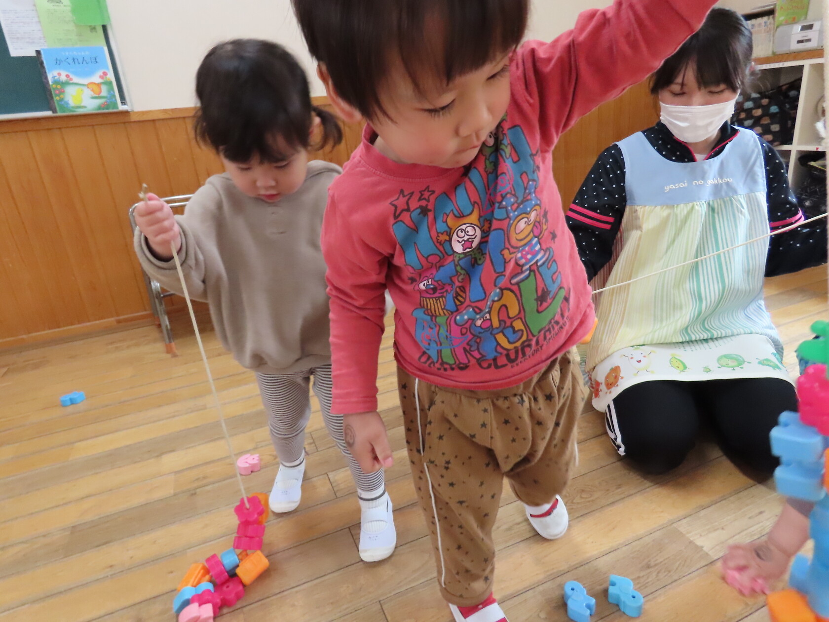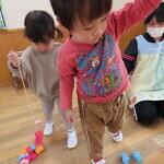 一つ紐を通す度、「入ったよ!」と伝えてくれたり、「ひこうきない!」と言っているお友達に飛行機を探してあげたり、みんなで楽しくあそびました