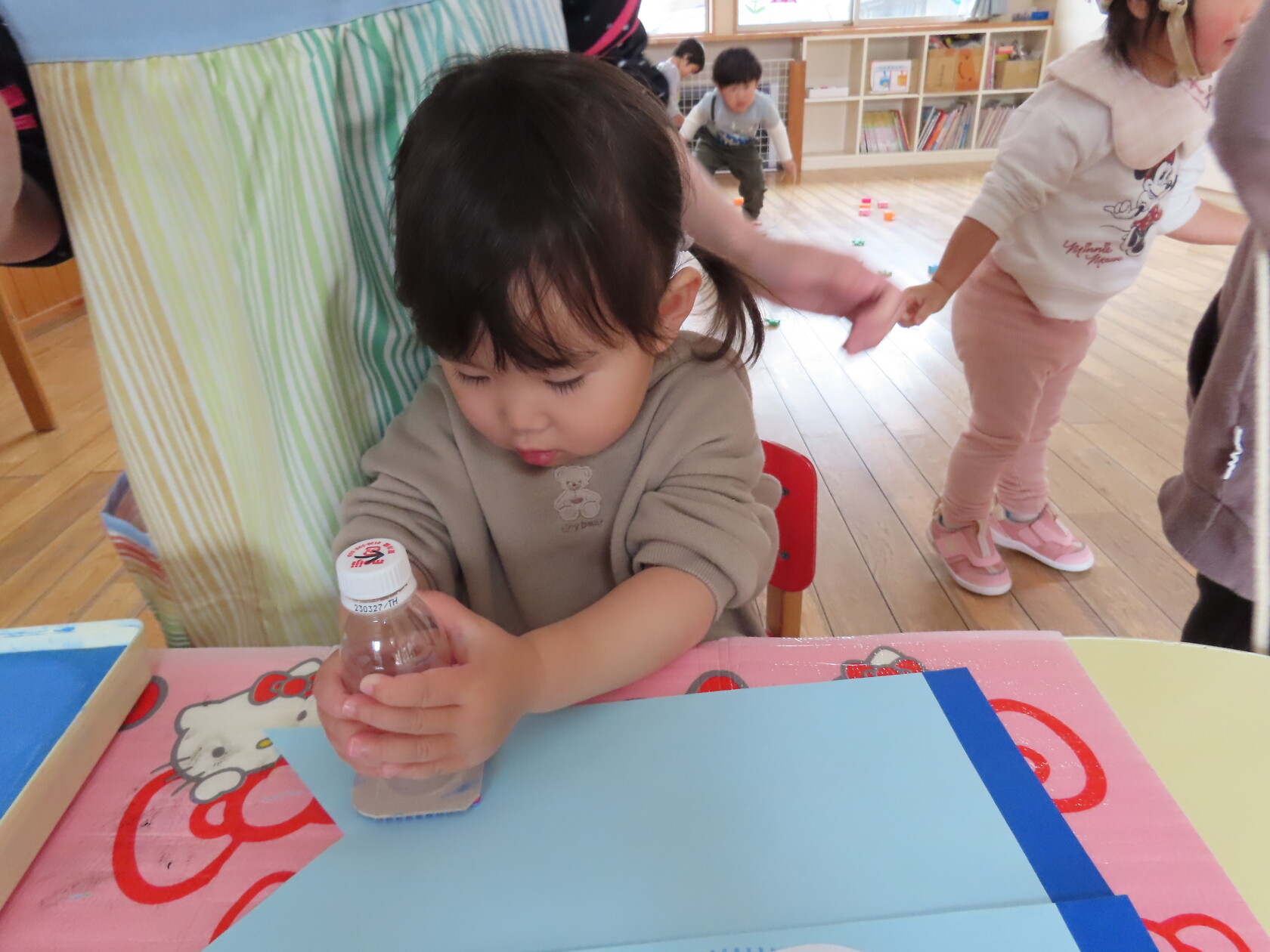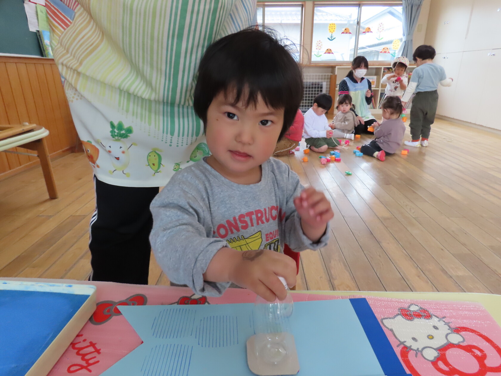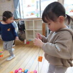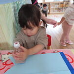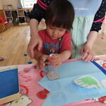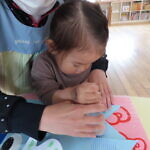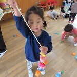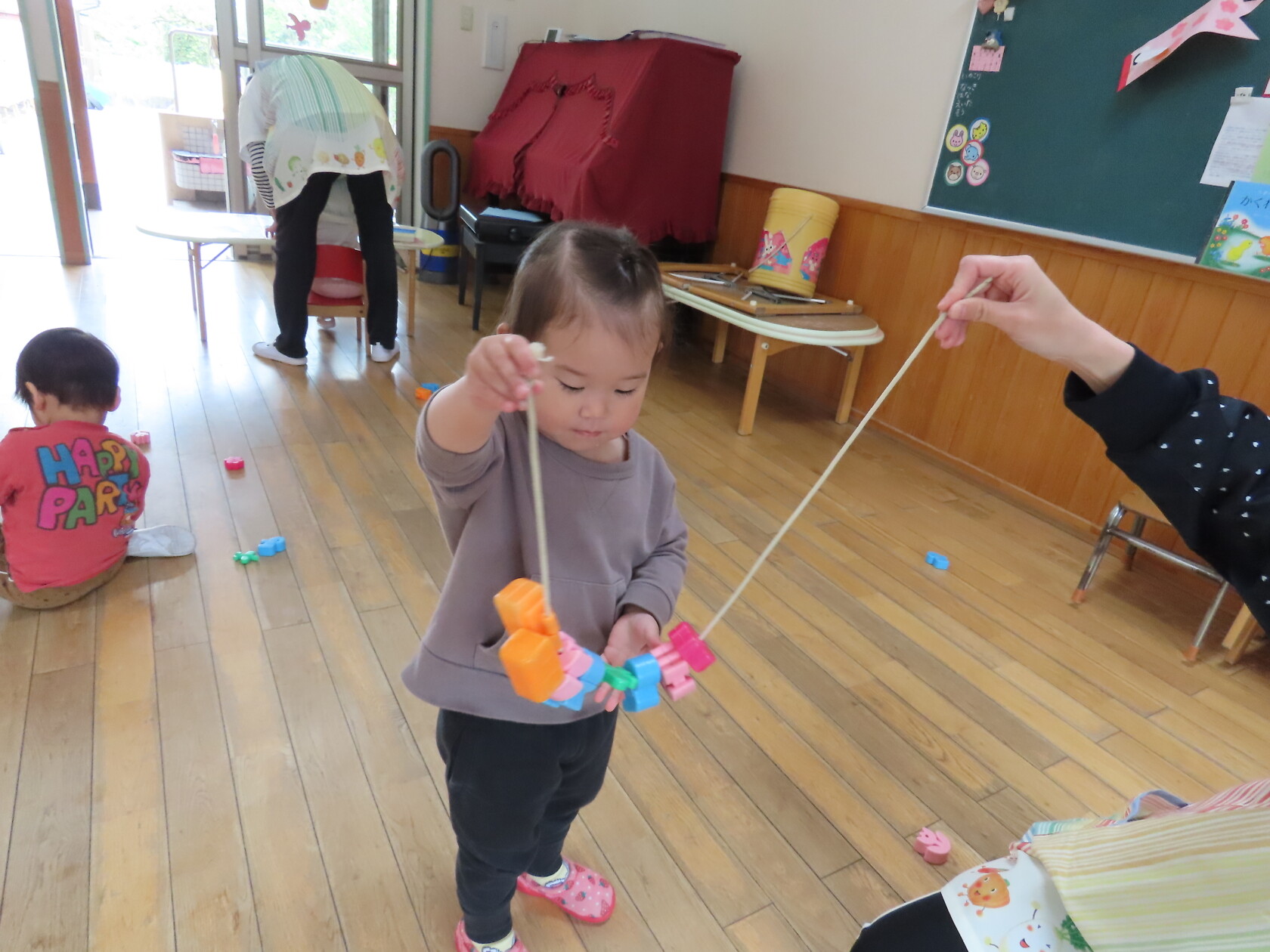 一つ紐を通す度、「入ったよ!」と伝えてくれたり、「ひこうきない!」と言っているお友達に飛行機を探してあげたり、みんなで楽しくあそびました