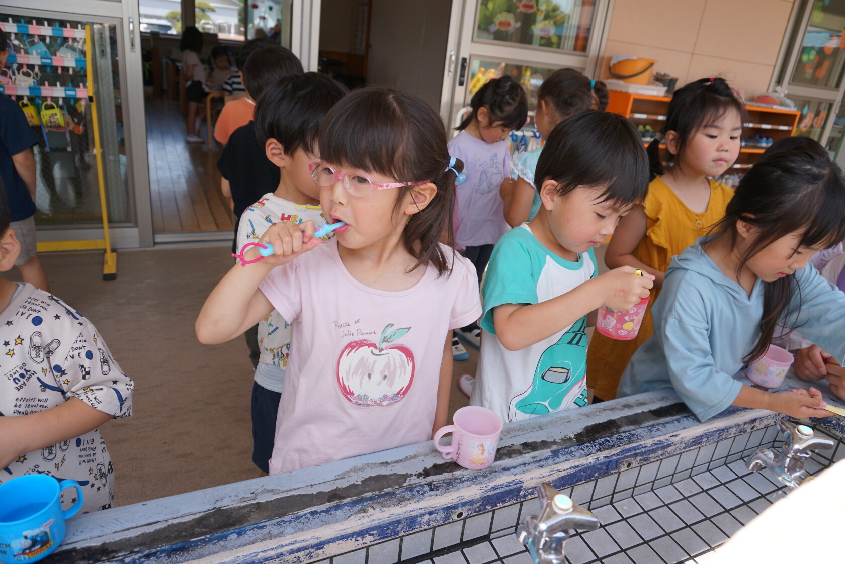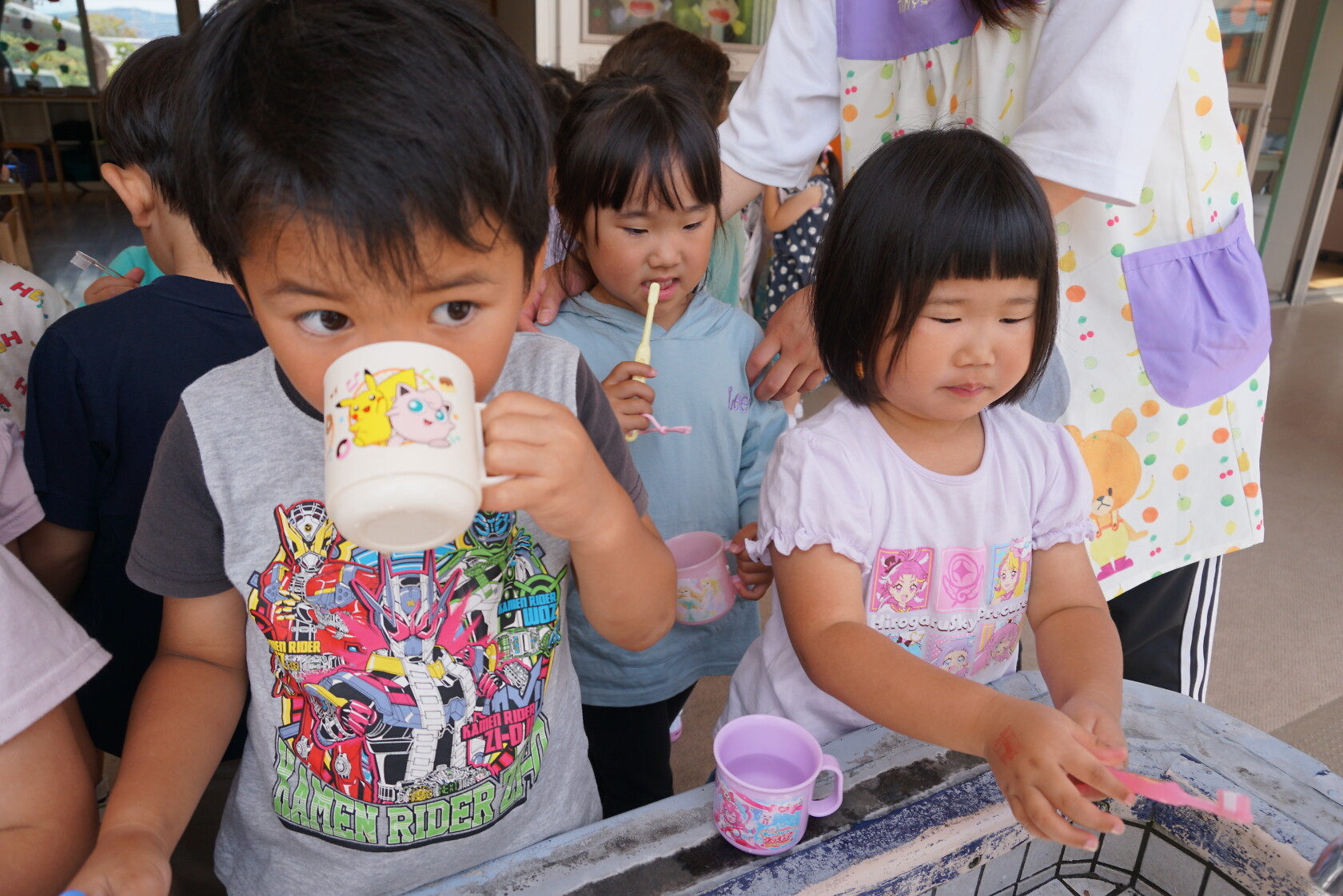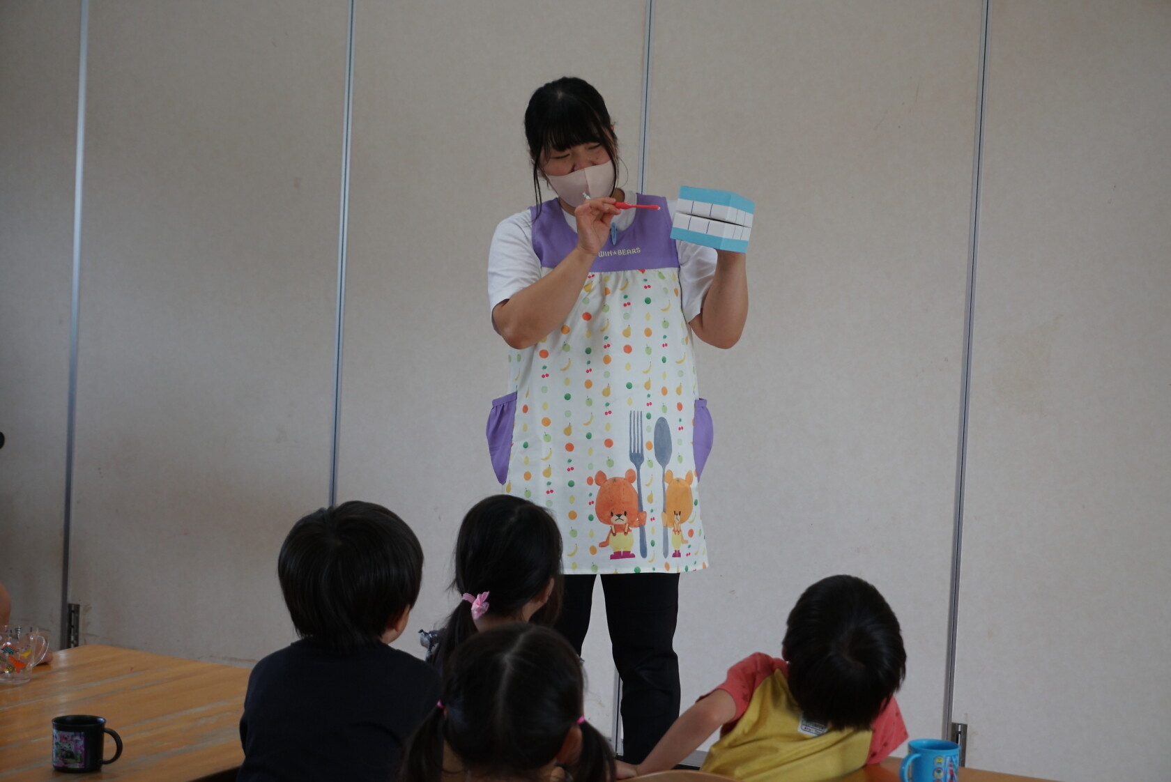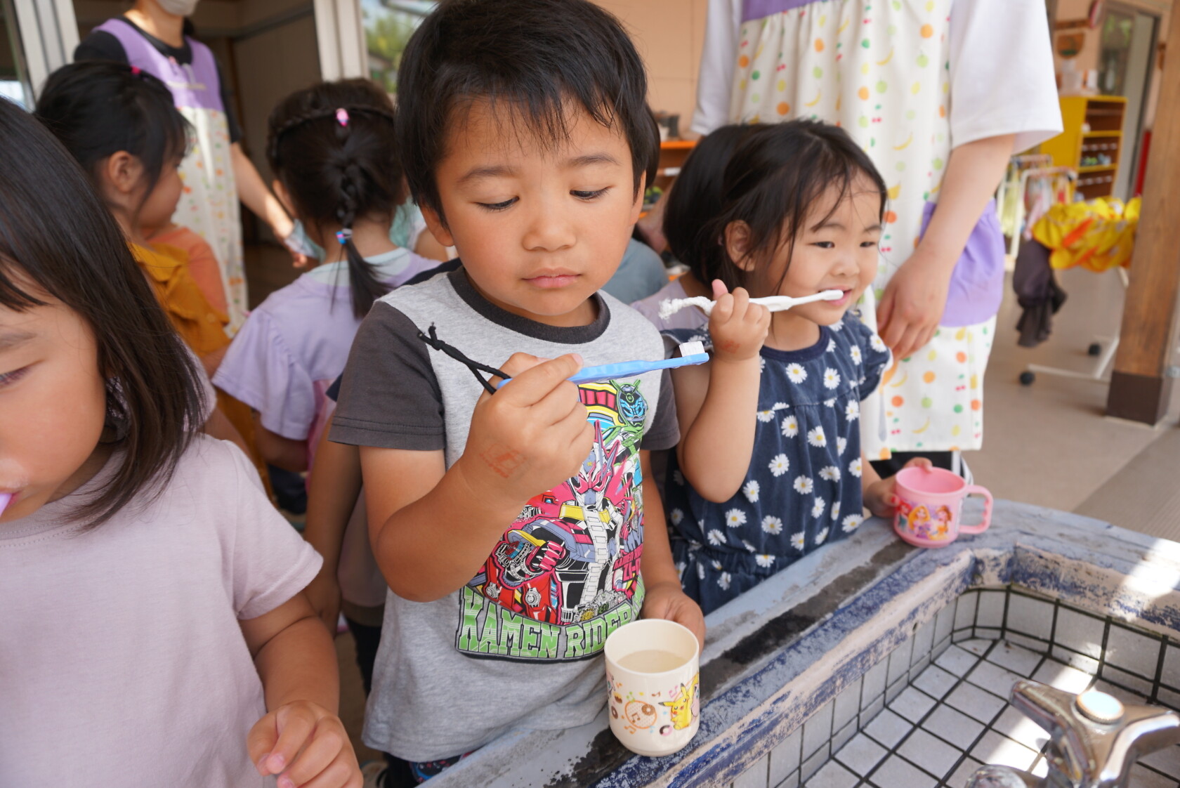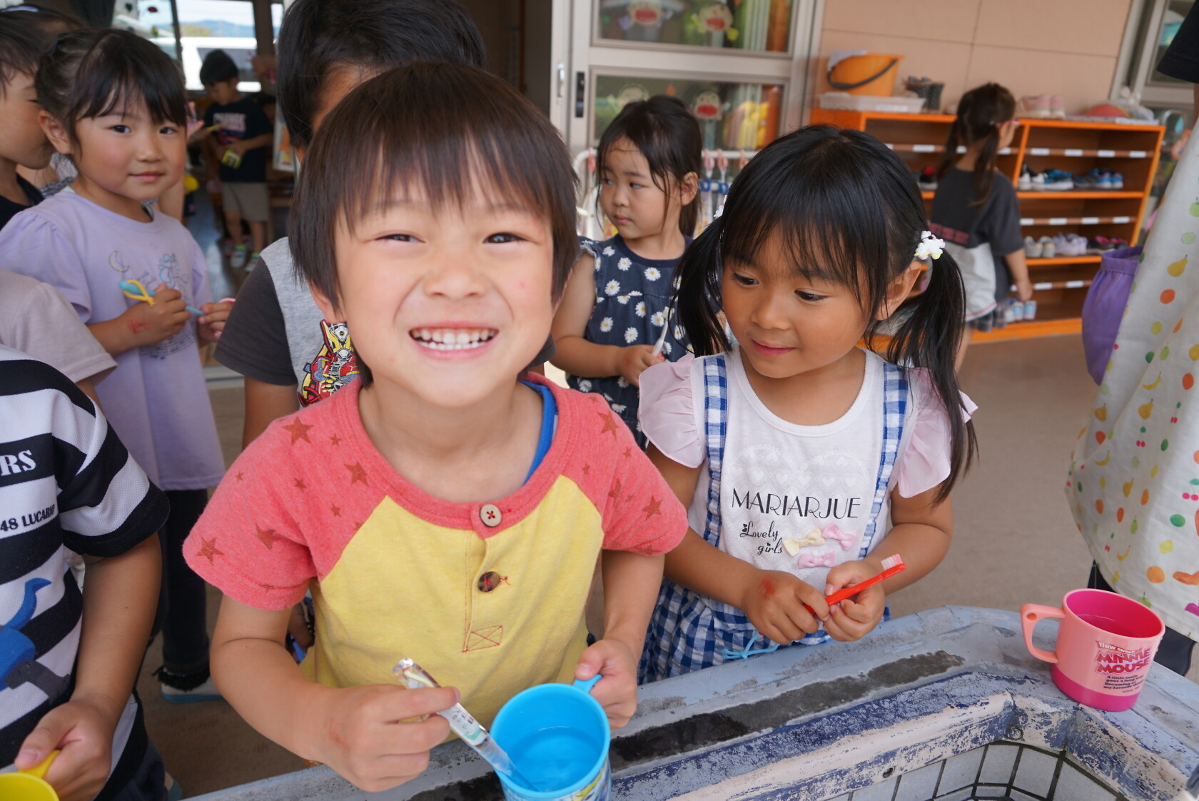 今日のできごと(ひまわり・ゆり) 公開済み: 2023年6月5日更新: 2023年6月5日 今日から食後の歯磨きが始まりました😁 歯ブラシの持ち方や磨き方など、歯のパッペットを使って教えてもらいました😀 みんな真剣に話を聞き、お気に入りのコップと歯ブラシを持って嬉しそうに取り組めました😆 ひまわりぐみさんは、今までの歯磨きをもう一度見直す機会になりましたね😊 しっかりと歯磨きをして、虫歯ゼロを目指しましょう✨