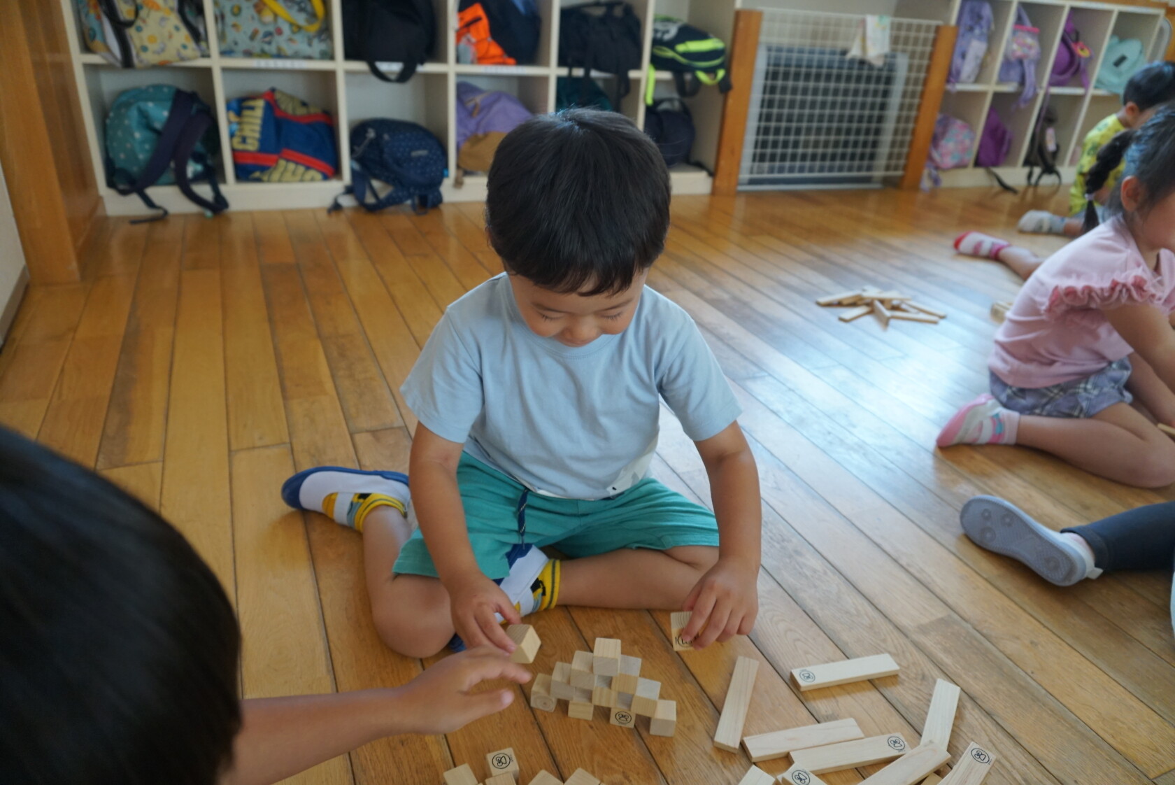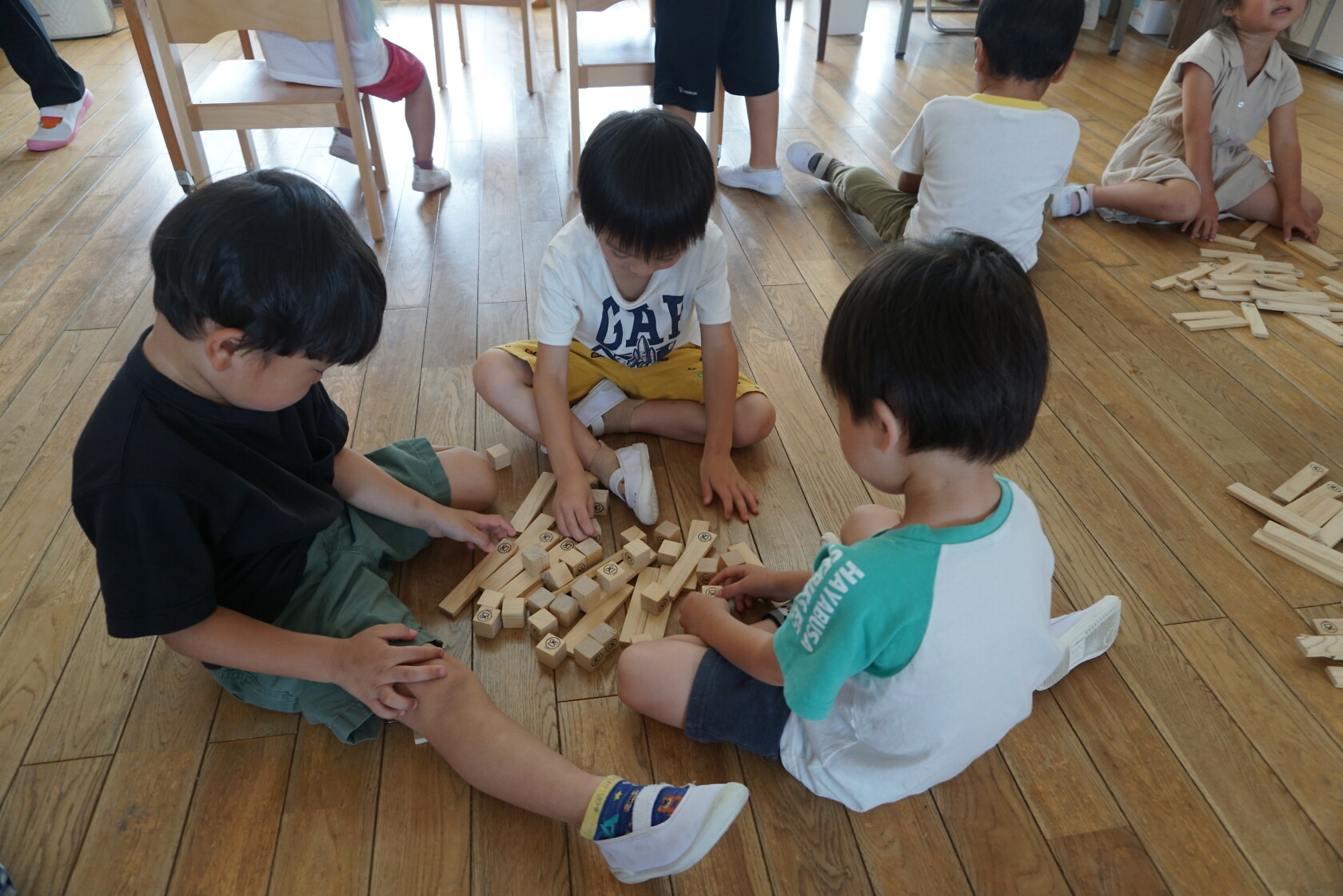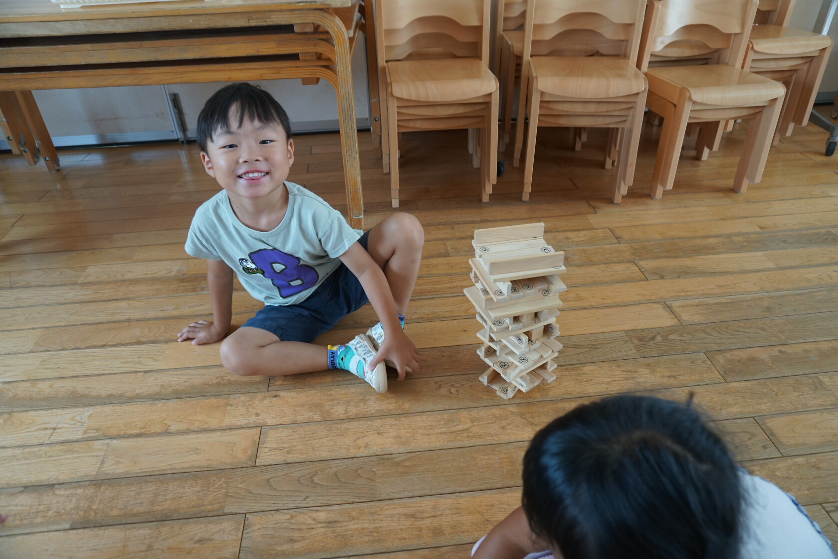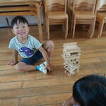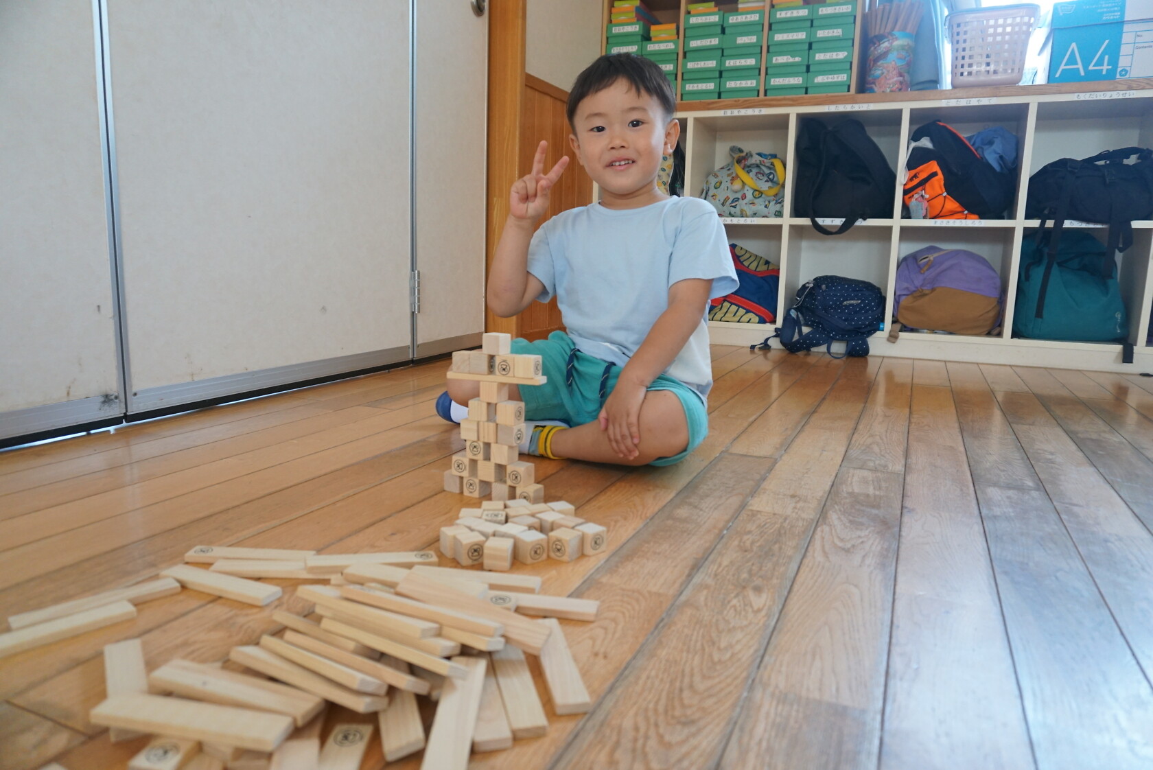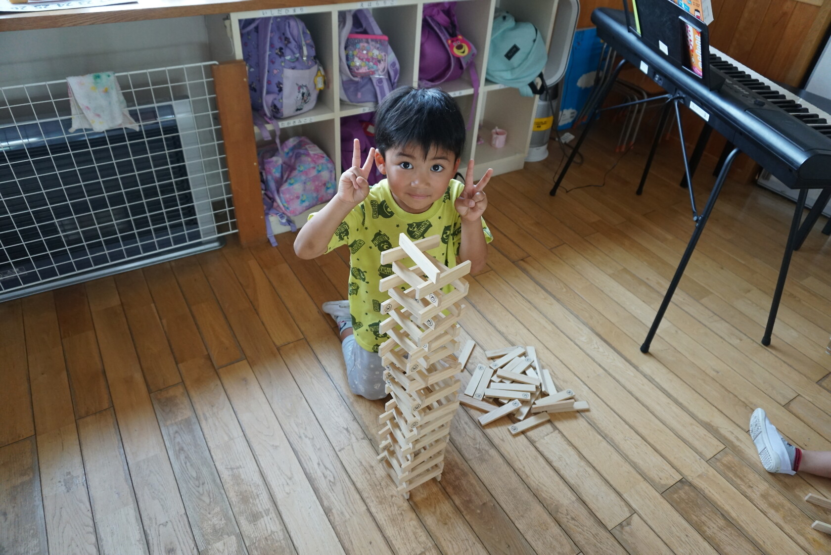 少しずつ積み方を変えながら、高く積み上げていく子や安定感のある積み方をする子など色々な方法で遊べるようになってきました😆