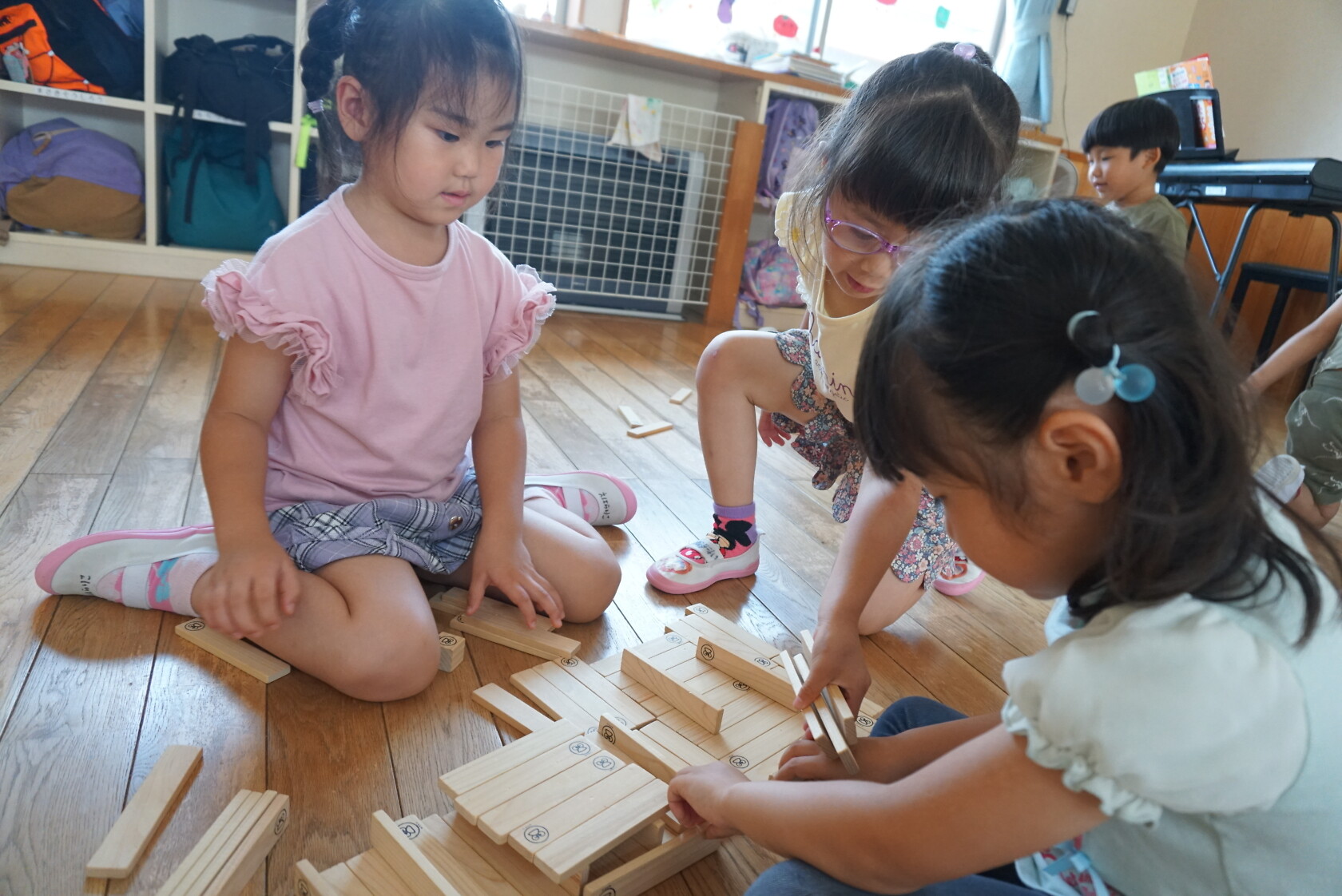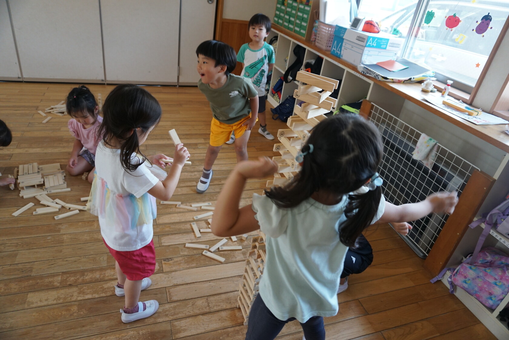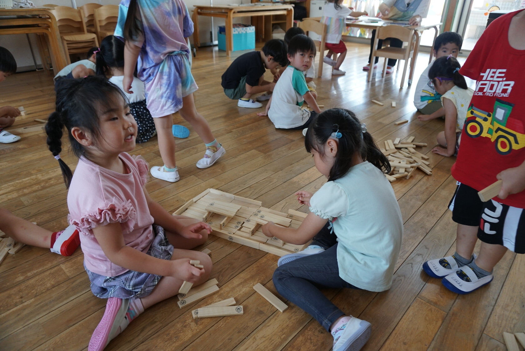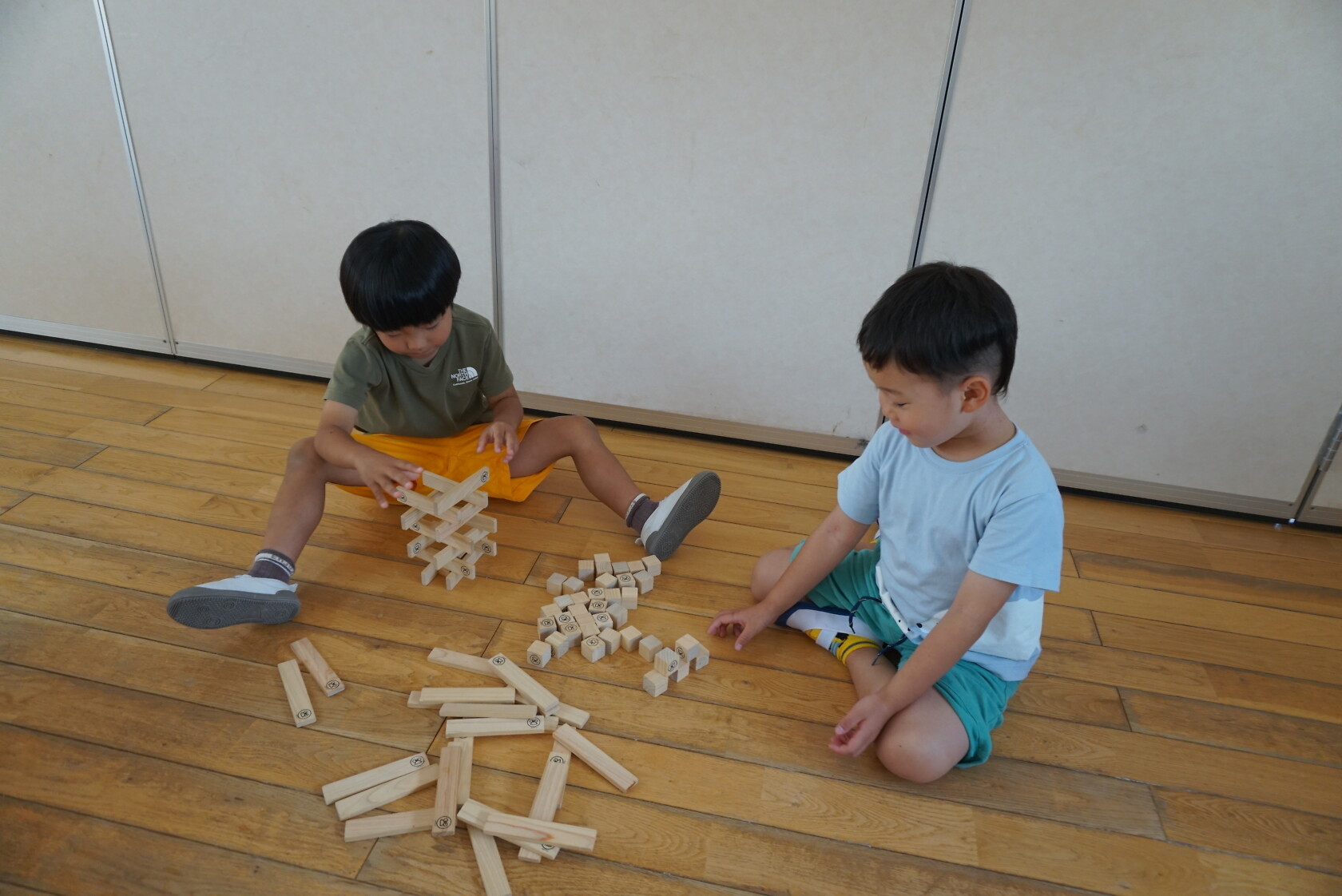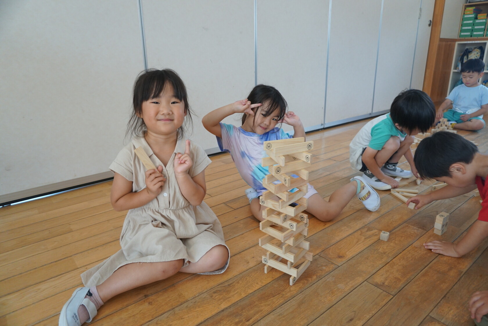 少しずつ積み方を変えながら、高く積み上げていく子や安定感のある積み方をする子など色々な方法で遊べるようになってきました😆