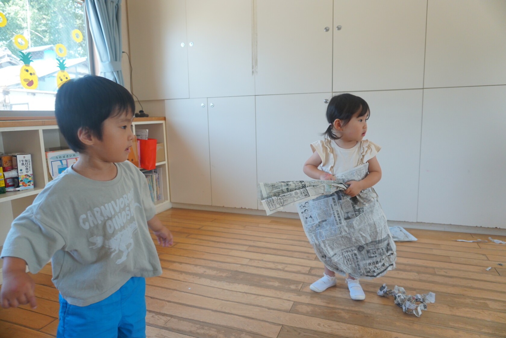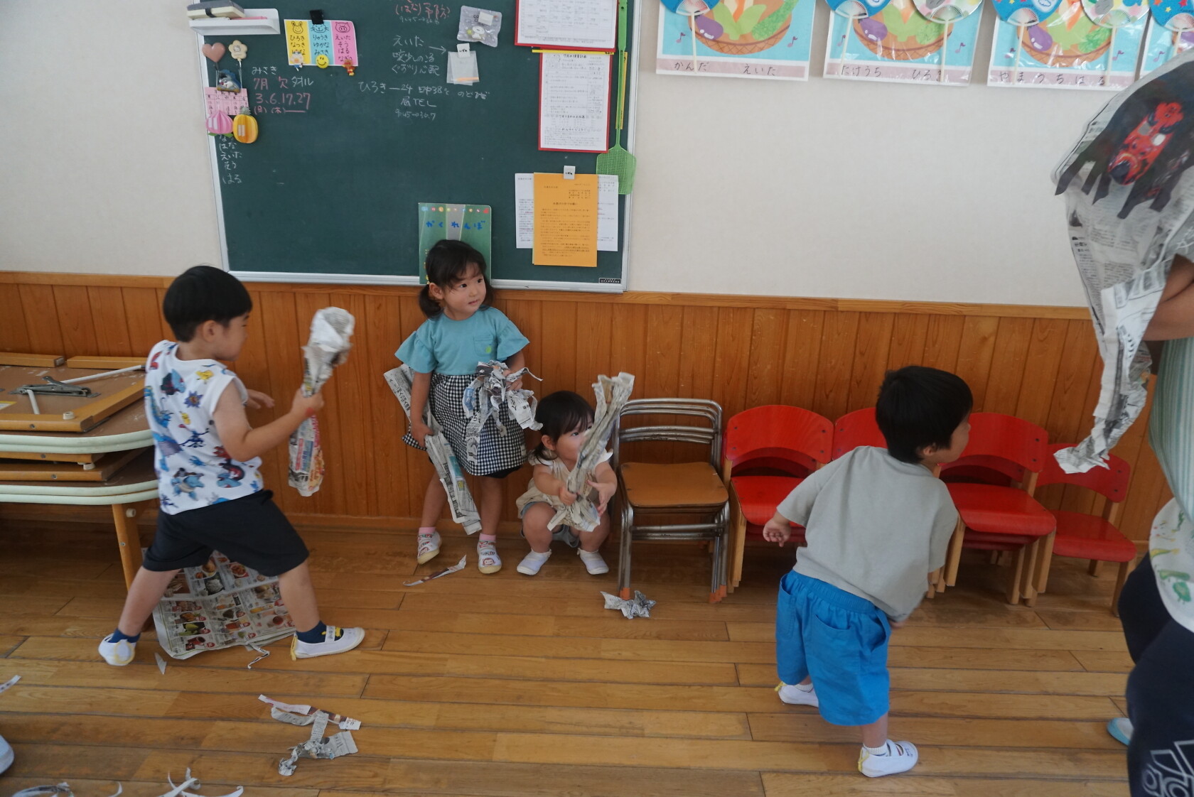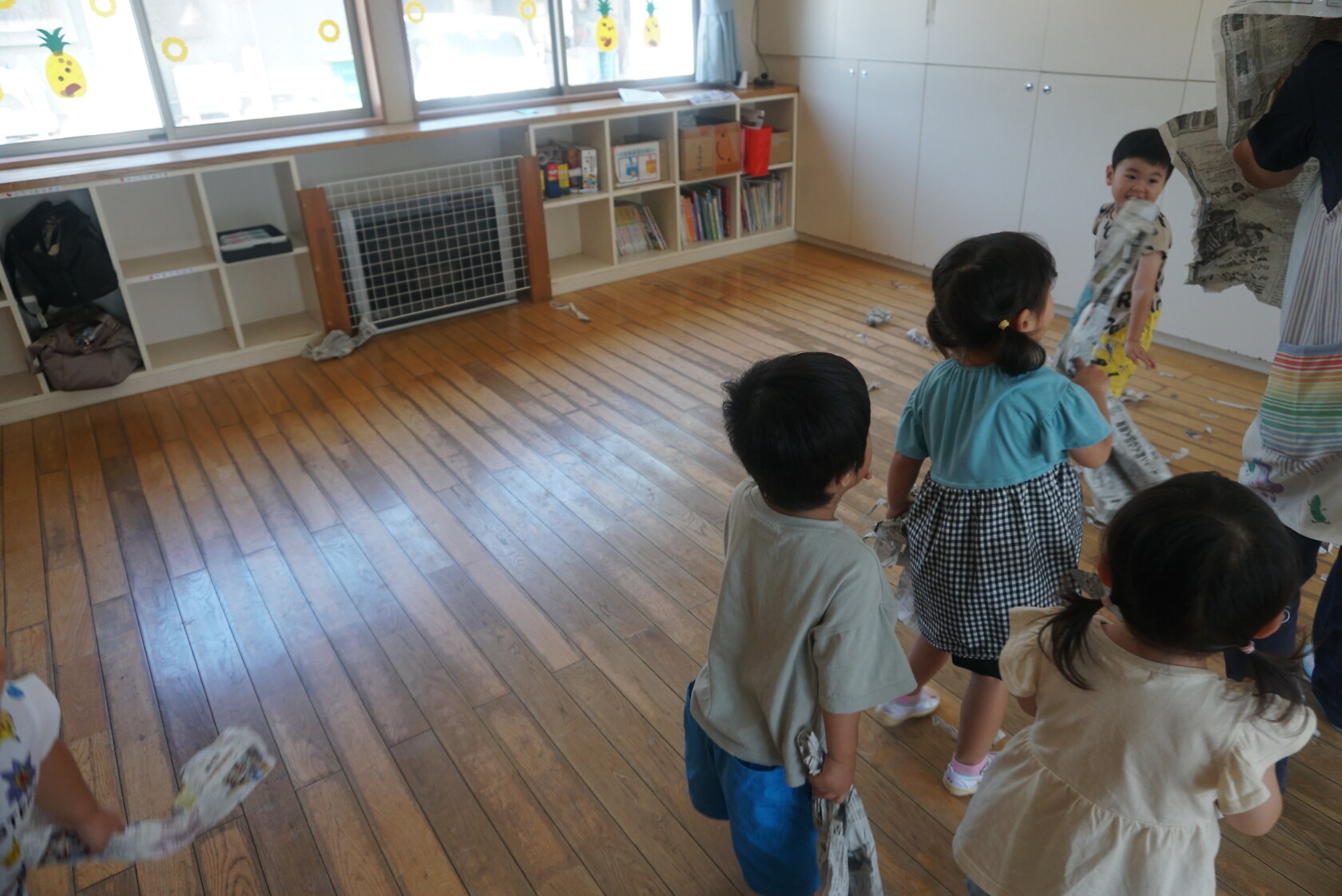 今日のできごと(ちゅうりっぷ) 公開済み: 2023年7月25日更新: 2023年7月25日 今日はお部屋で、新聞紙遊びをしました✨ 細長くちぎった新聞紙を麺に見立てて遊んだり、大きな新聞紙をスカートやシャツにしたりして楽しみました。 途中で鬼のお面を被った先生が登場すると、剣やボールを作り、一生懸命鬼退治をしていました💪 おうちでも何をして遊んだか聞いてみて下さいね😆