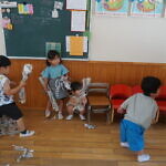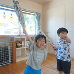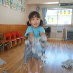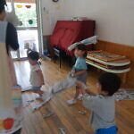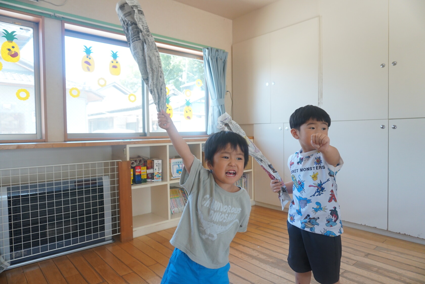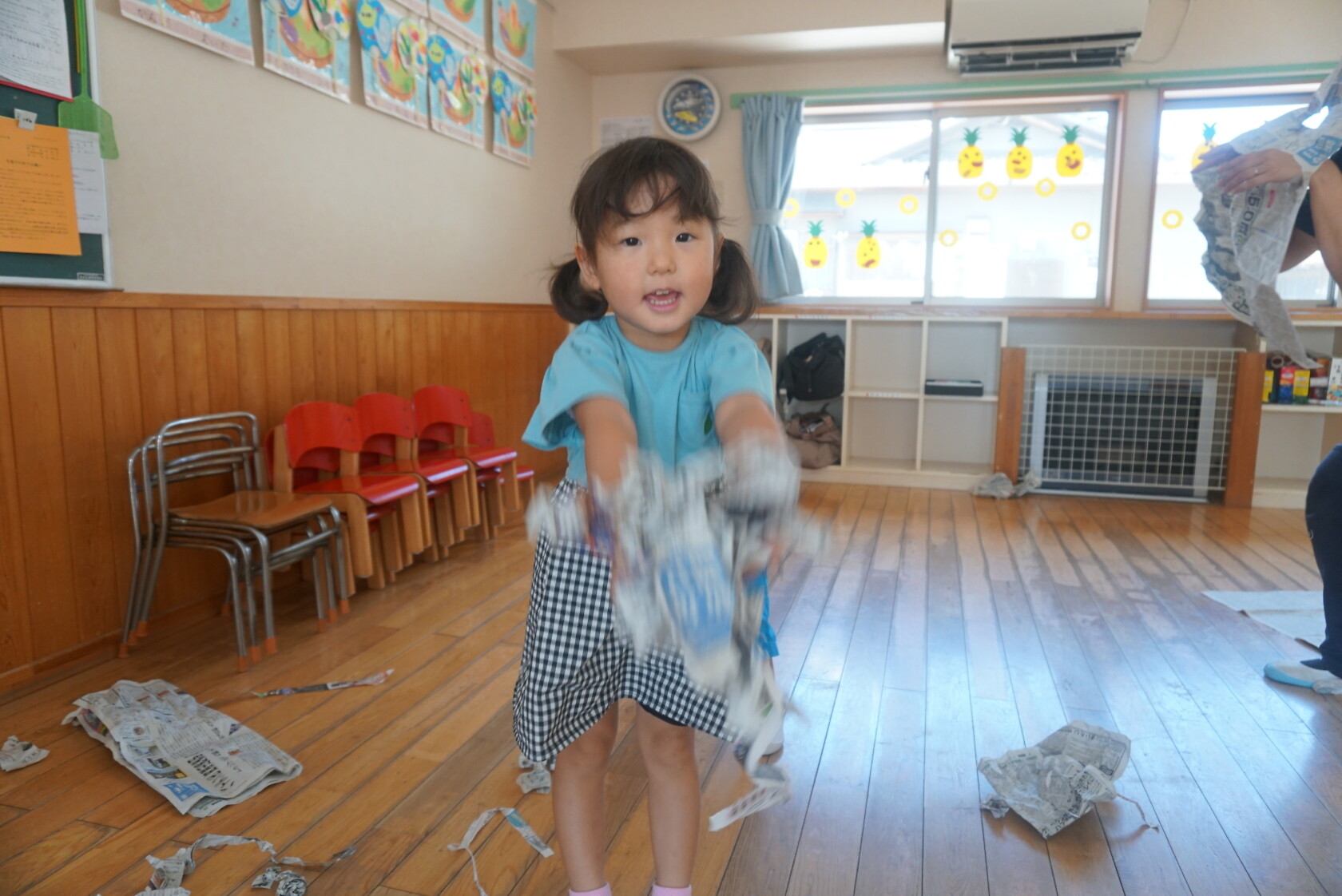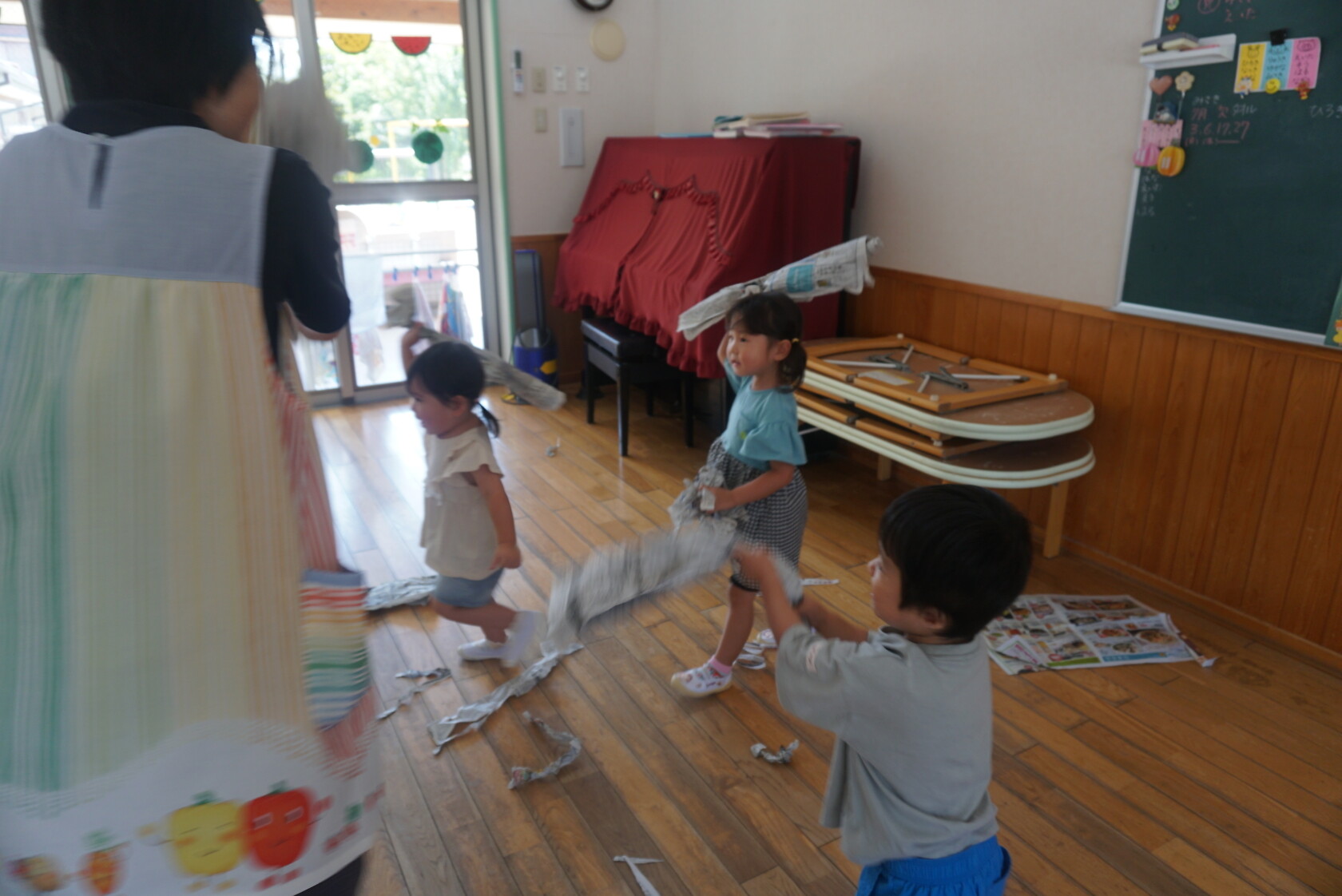 今日のできごと(ちゅうりっぷ) 公開済み: 2023年7月25日更新: 2023年7月25日 今日はお部屋で、新聞紙遊びをしました✨ 細長くちぎった新聞紙を麺に見立てて遊んだり、大きな新聞紙をスカートやシャツにしたりして楽しみました。 途中で鬼のお面を被った先生が登場すると、剣やボールを作り、一生懸命鬼退治をしていました💪 おうちでも何をして遊んだか聞いてみて下さいね😆