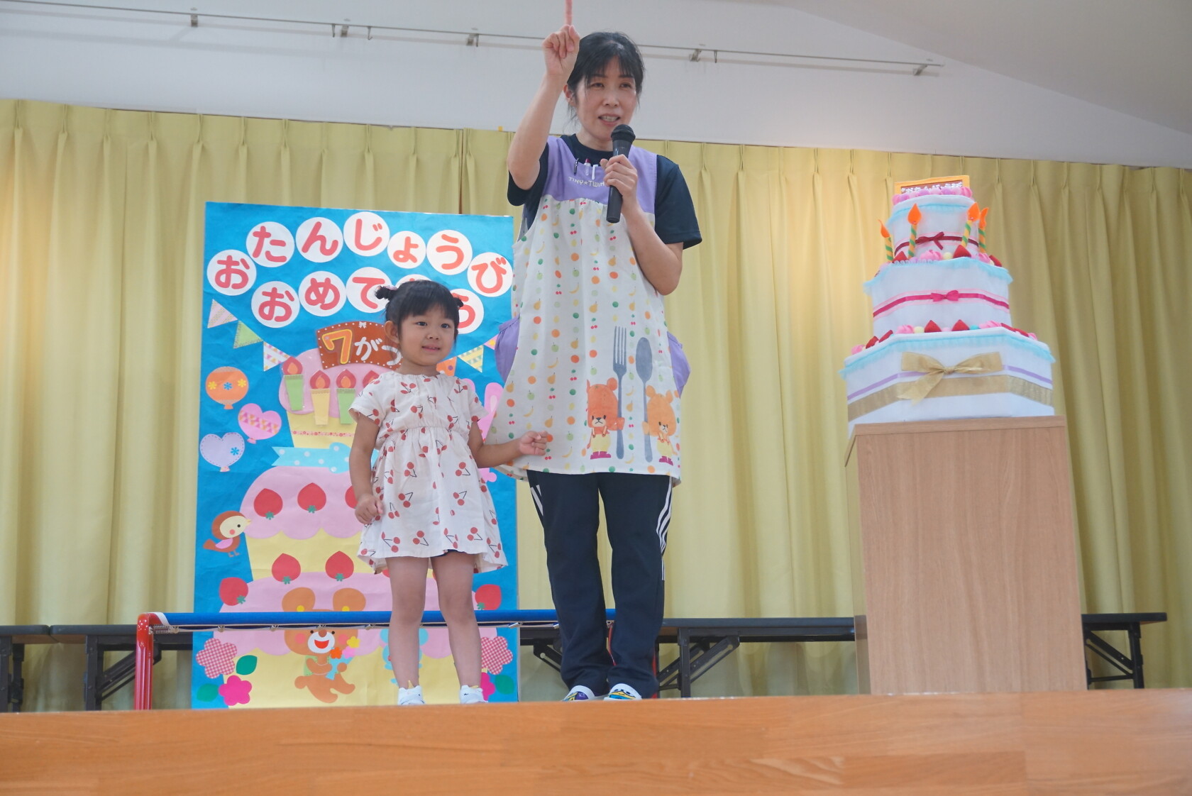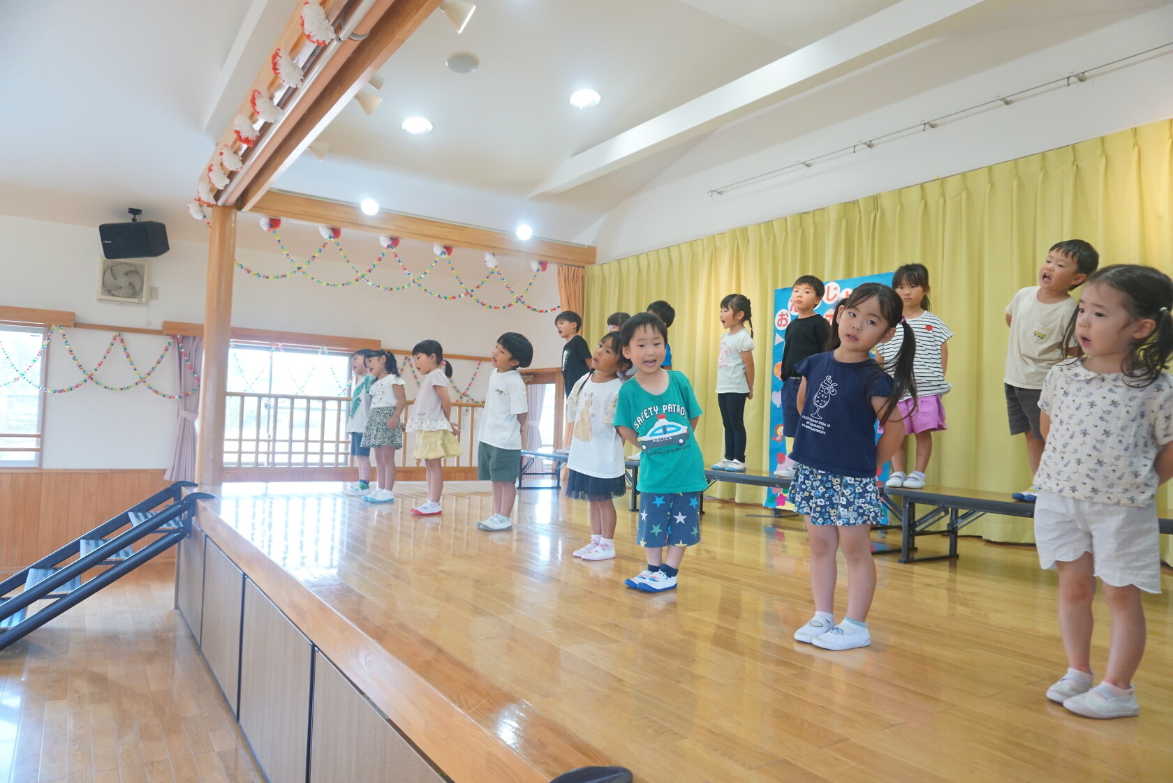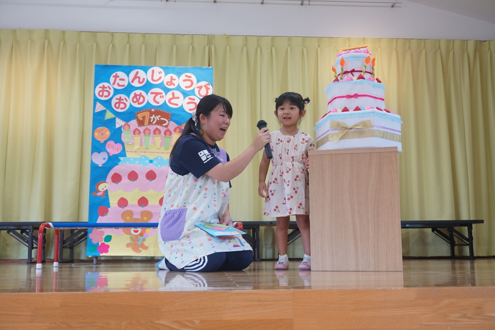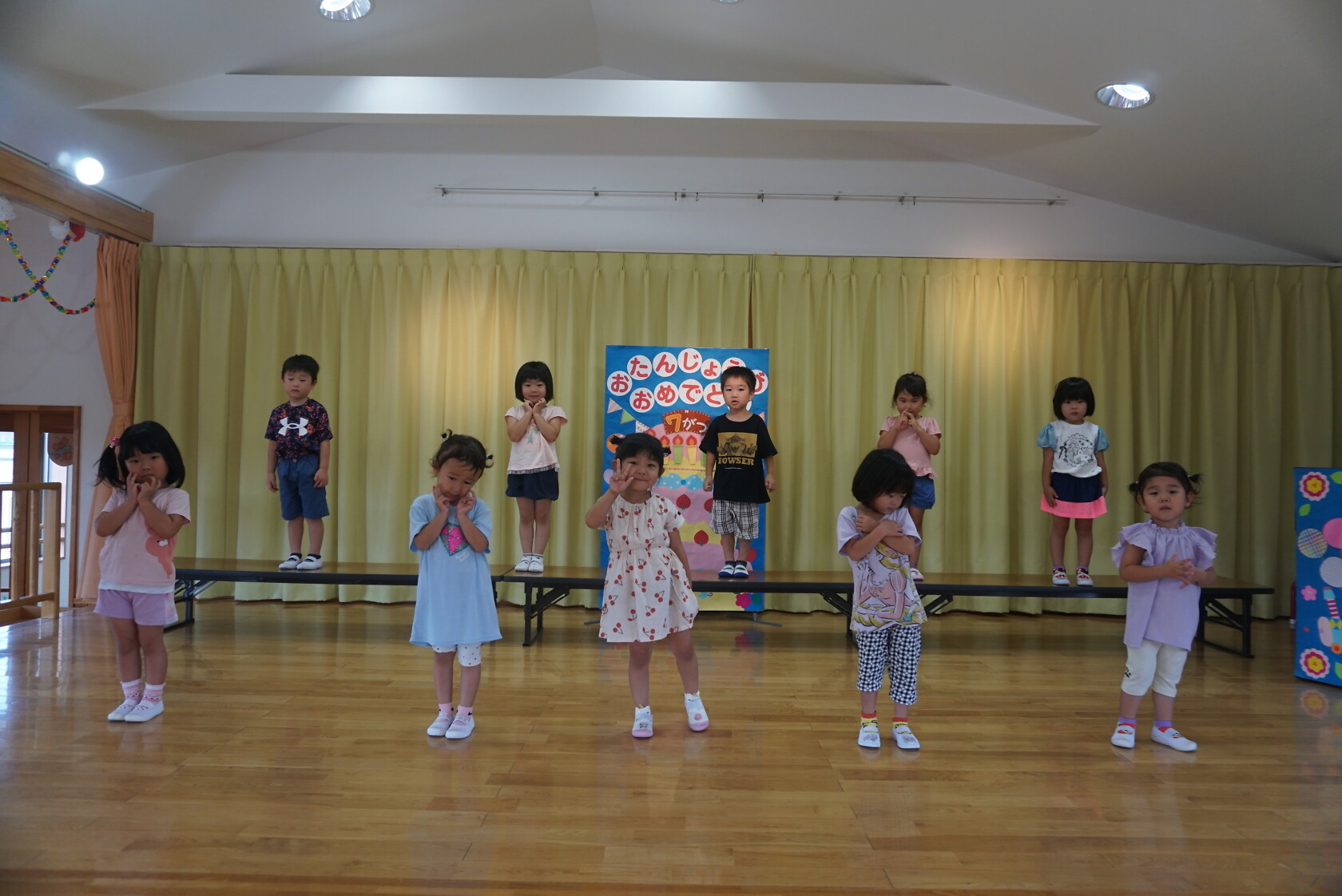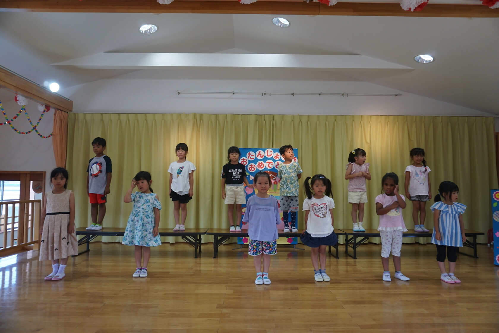 お誕生会(以上児) 公開済み: 2023年7月26日更新: 2023年7月26日 今日は7月うまれのお友だちのお誕生会でした✨ 名前を呼ばれ、元気よく返事をしてステージに上がり、上手にお誕生日カードの発表ができました。 今月のお歌のプレゼントは すみれ組「おばけなんてないさ」「とんでったバナナ」 ゆり組「スイカの名産地」「崖の上のポニョ」 ひまわり組「アイスクリームのうた」「勇気100%」でした♬。 7月うまれのお友だちお誕生日おめでとうございます