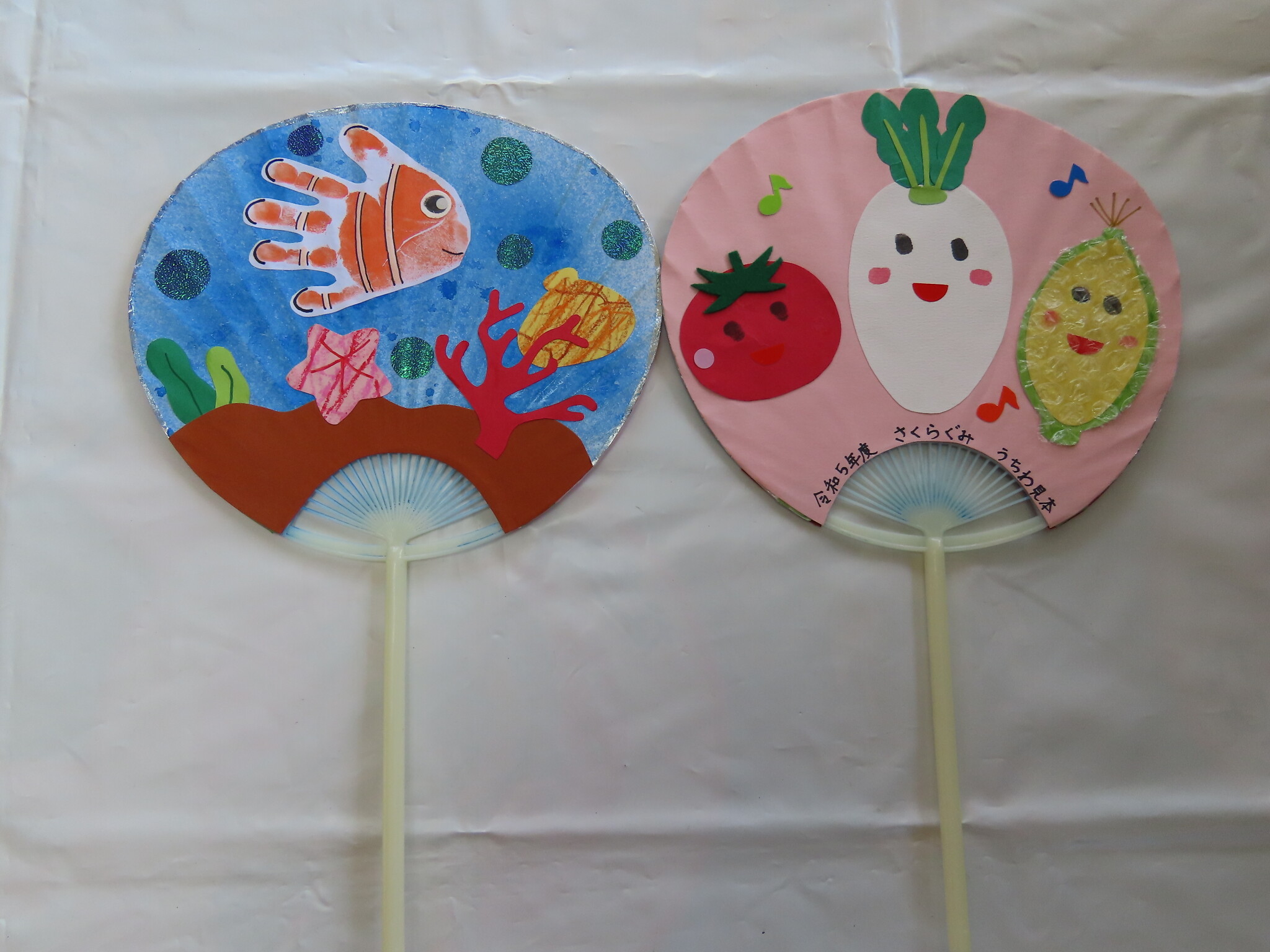 うちわの製作の持ちかえり(さくら・小規模さくら) 公開済み: 2023年7月31日更新: 2023年7月31日 残念ながら、今年度も納涼大会は中止となってしまいましたが、子ども達がうちわの製作を行いました!! 片面は、絵本の「おやさいさん」のキャラクターを指押しを使って描きました😀フェルトやプチプチの梱包シートを使用したので、触れて楽しんでみて下さい🎵 もう片面は、可愛らしい手形がニモに変身🐠海の中を描き、涼しさが感じられる作品となっています✨ ぜひ、お子さんを抱っこしてうちわを扇ぎ、優しい風を感じて下さいね💕