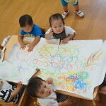 日差しが照りつける中、子ども達は暑さを忘れ元気に過ごしています。 今日はみんなでクレヨンを使って大きな紙に点や線、絵など、思い思いの絵を描き、楽しい時間を過ごす […]