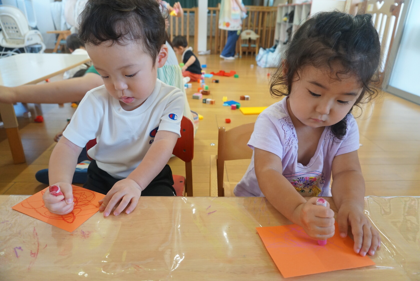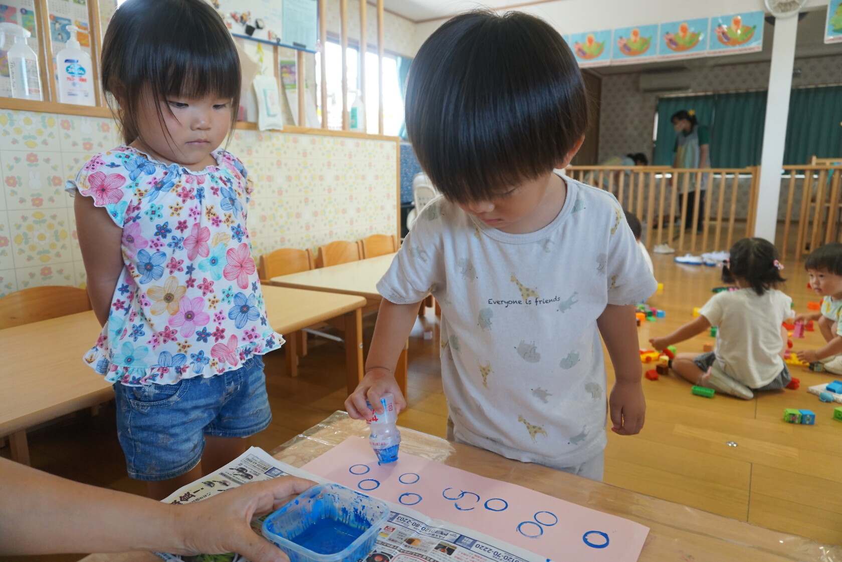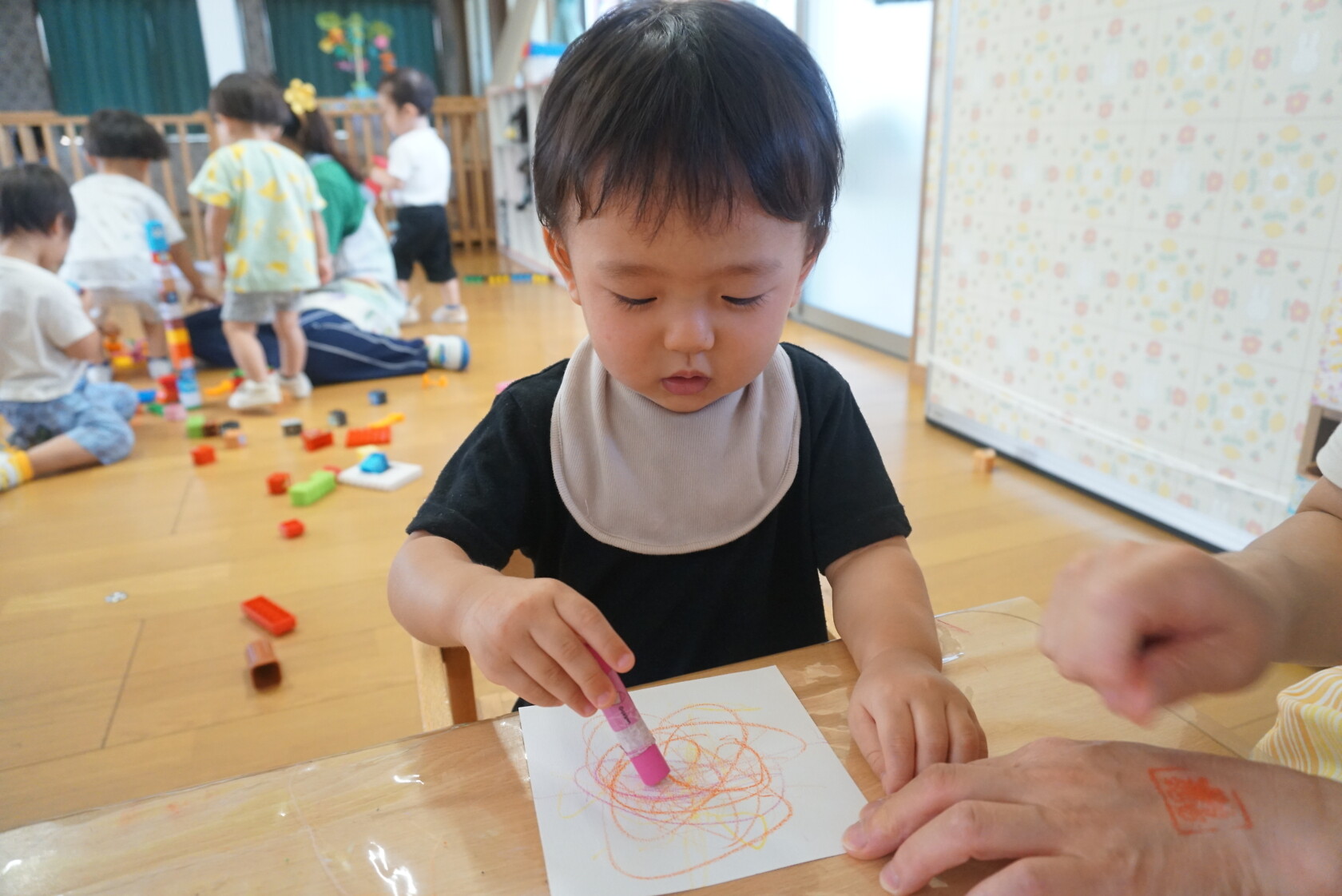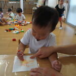 今日のできごと(小規模ちゅうりっぷ、小規模さくら) 公開済み: 2023年8月10日更新: 2023年8月10日 お眠りのピアノが流れるとすぐに静かになり、机に顔を伏せ、お眠りをする子ども達😴「♬起きよう~起きよう~」と起こすと可愛い動物になって起きたり、元気いっぱいなアンパンマンになって起きてくれます😀 今日は、その後に月の製作をしました!2歳児さんは、ヤクルトの容器でスタンプを押したり、顔を描きました🖍 1歳児さんは、3色のクレヨンを使ってなぐり描きをし、みんな楽しんで取り組んでいました😊🎵 御家族で過ごす時間が多くなる時期ですが、ケガ等に気をつけ、楽しくお過ごし下さい✨