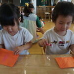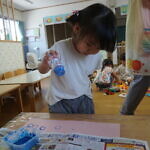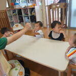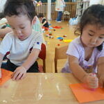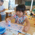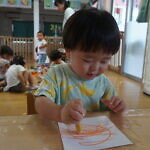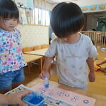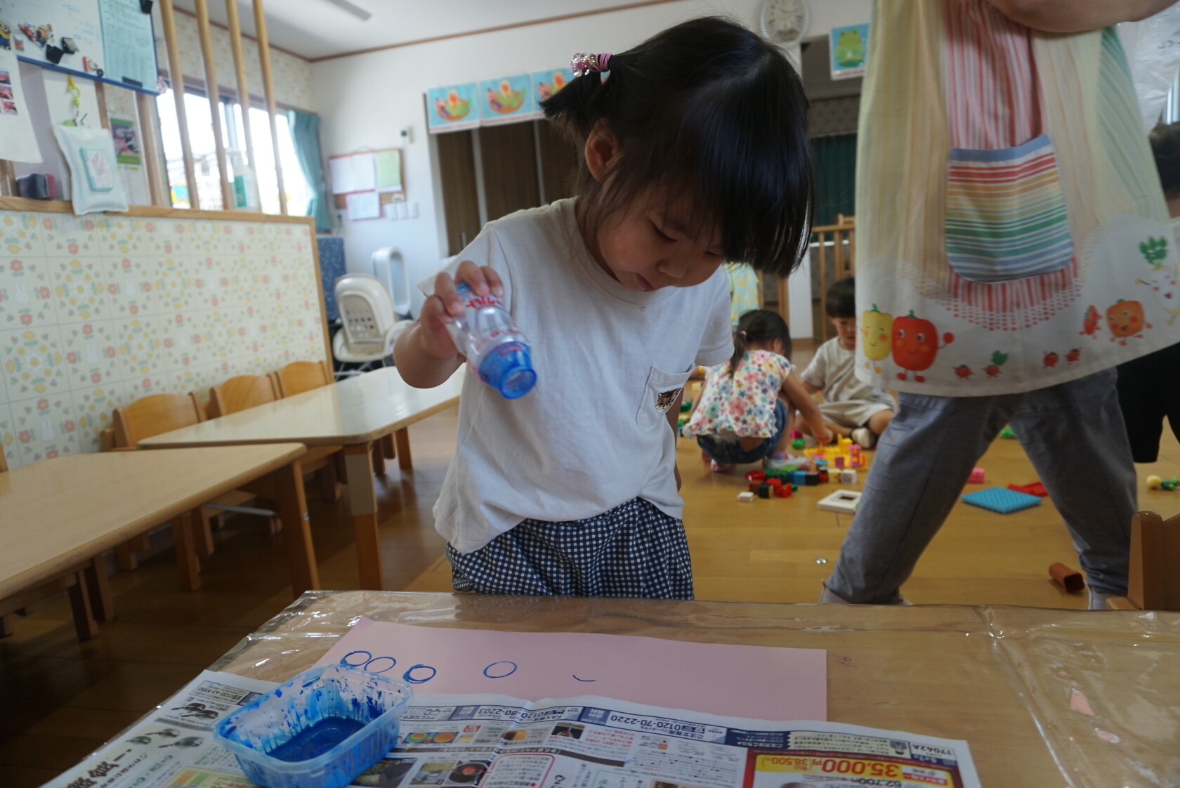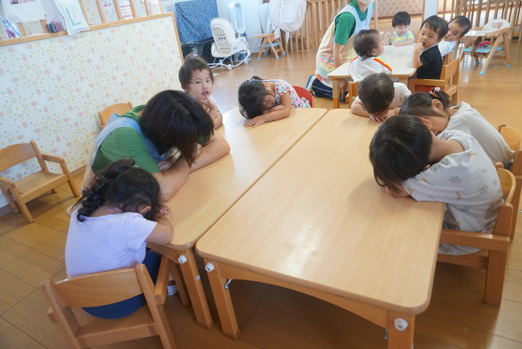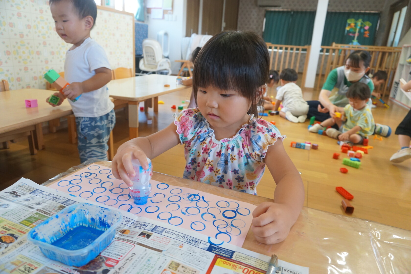今日のできごと(小規模ちゅうりっぷ、小規模さくら) 公開済み: 2023年8月10日更新: 2023年8月10日 お眠りのピアノが流れるとすぐに静かになり、机に顔を伏せ、お眠りをする子ども達😴「♬起きよう~起きよう~」と起こすと可愛い動物になって起きたり、元気いっぱいなアンパンマンになって起きてくれます😀 今日は、その後に月の製作をしました!2歳児さんは、ヤクルトの容器でスタンプを押したり、顔を描きました🖍 1歳児さんは、3色のクレヨンを使ってなぐり描きをし、みんな楽しんで取り組んでいました😊🎵 御家族で過ごす時間が多くなる時期ですが、ケガ等に気をつけ、楽しくお過ごし下さい✨