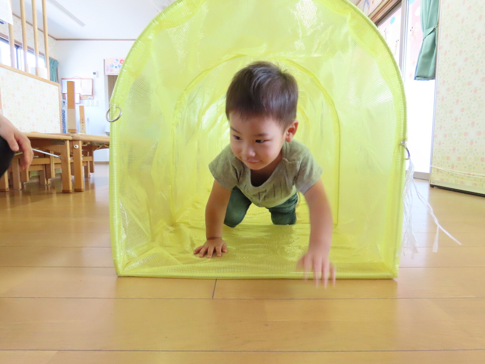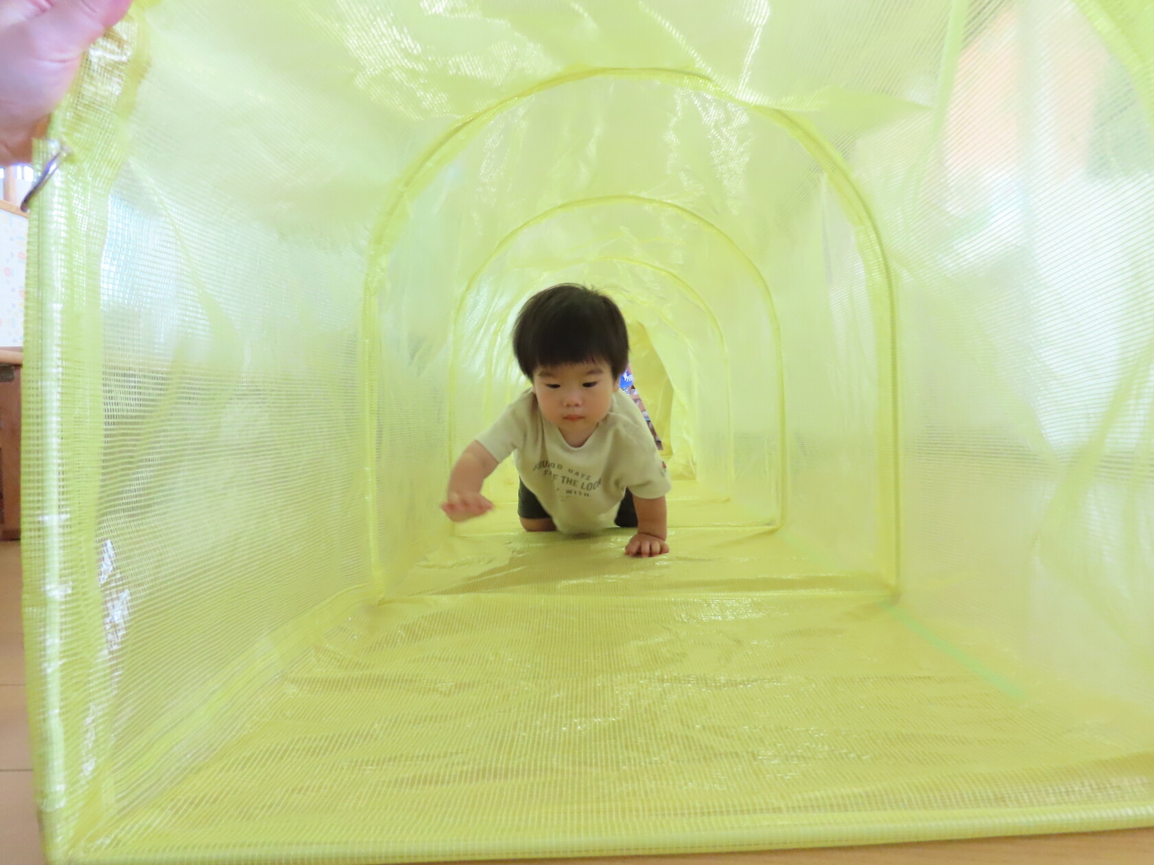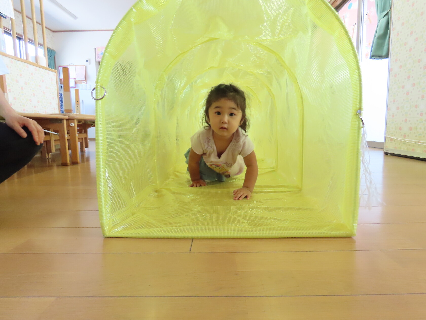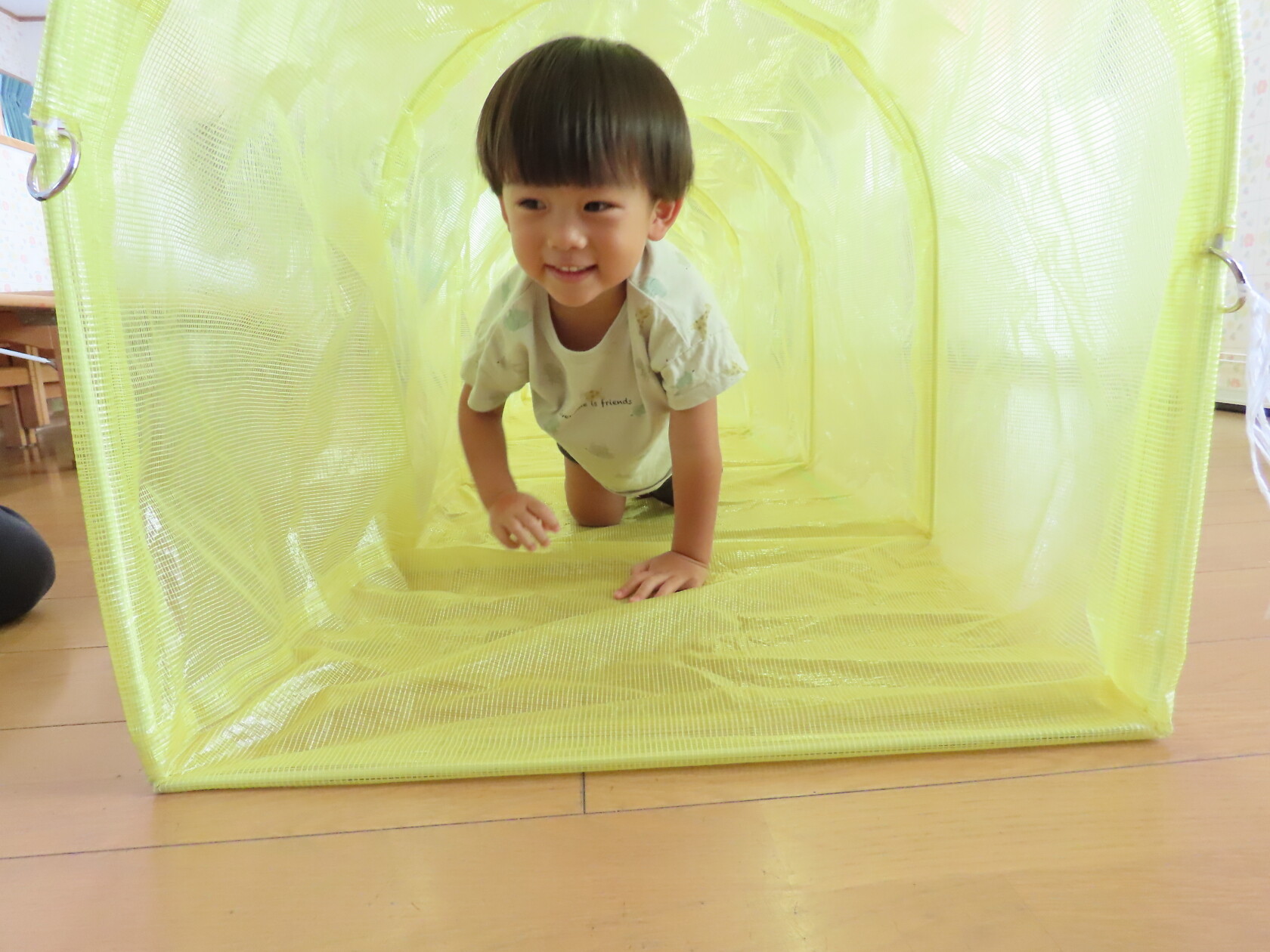 昨日から運動会の練習が始まり、今日はお部屋でドリームトンネルをくぐる練習を行いました!