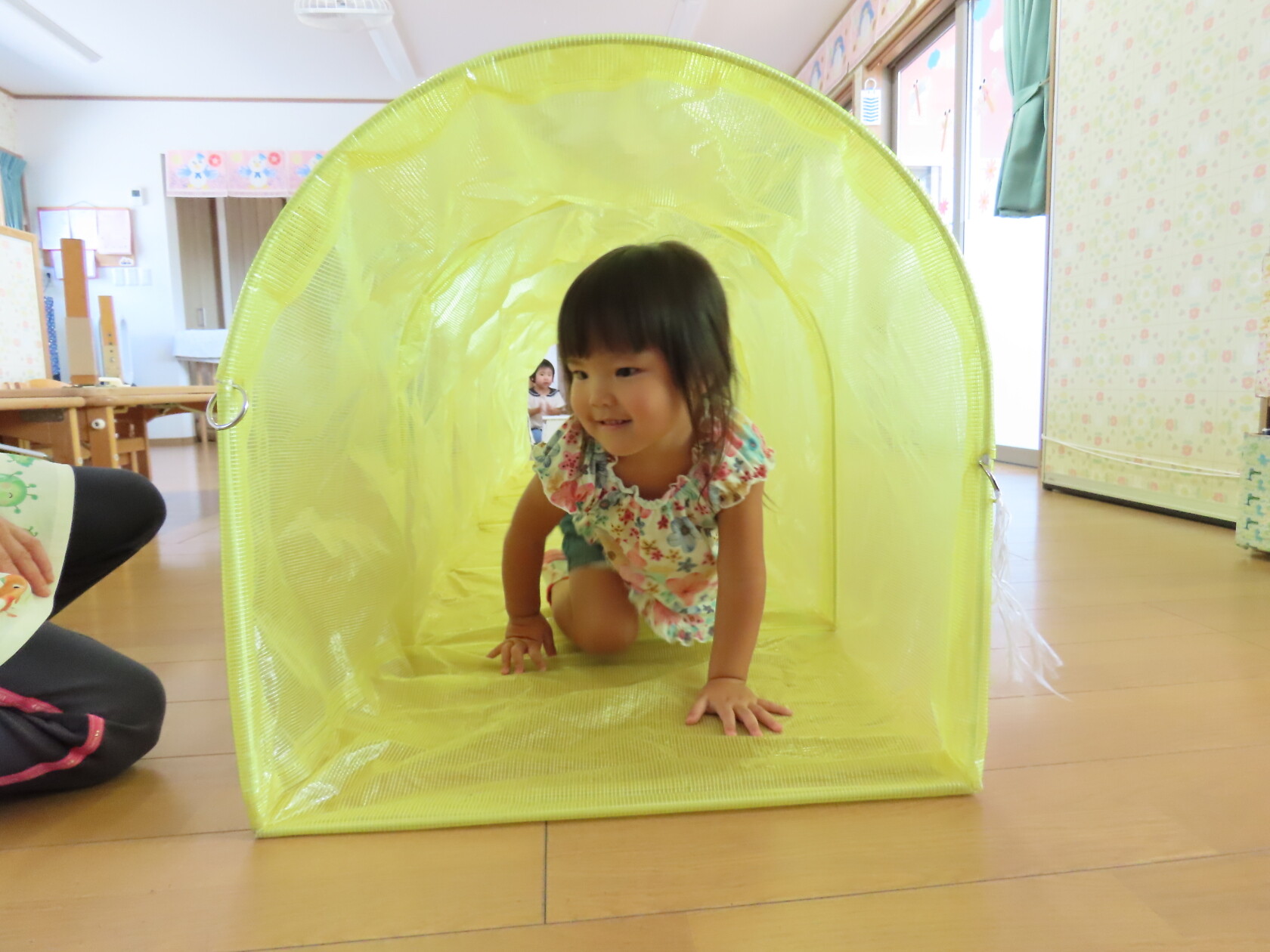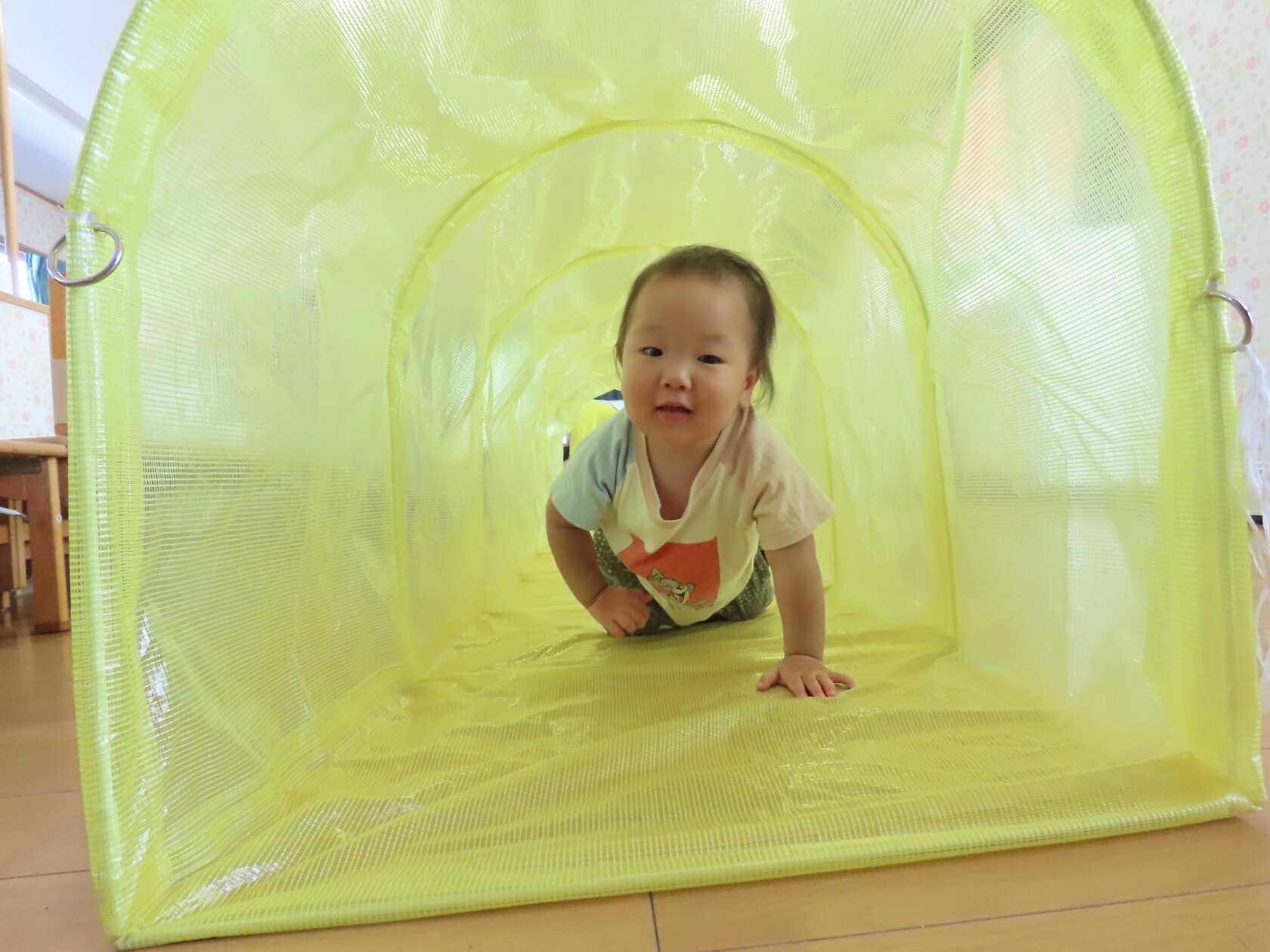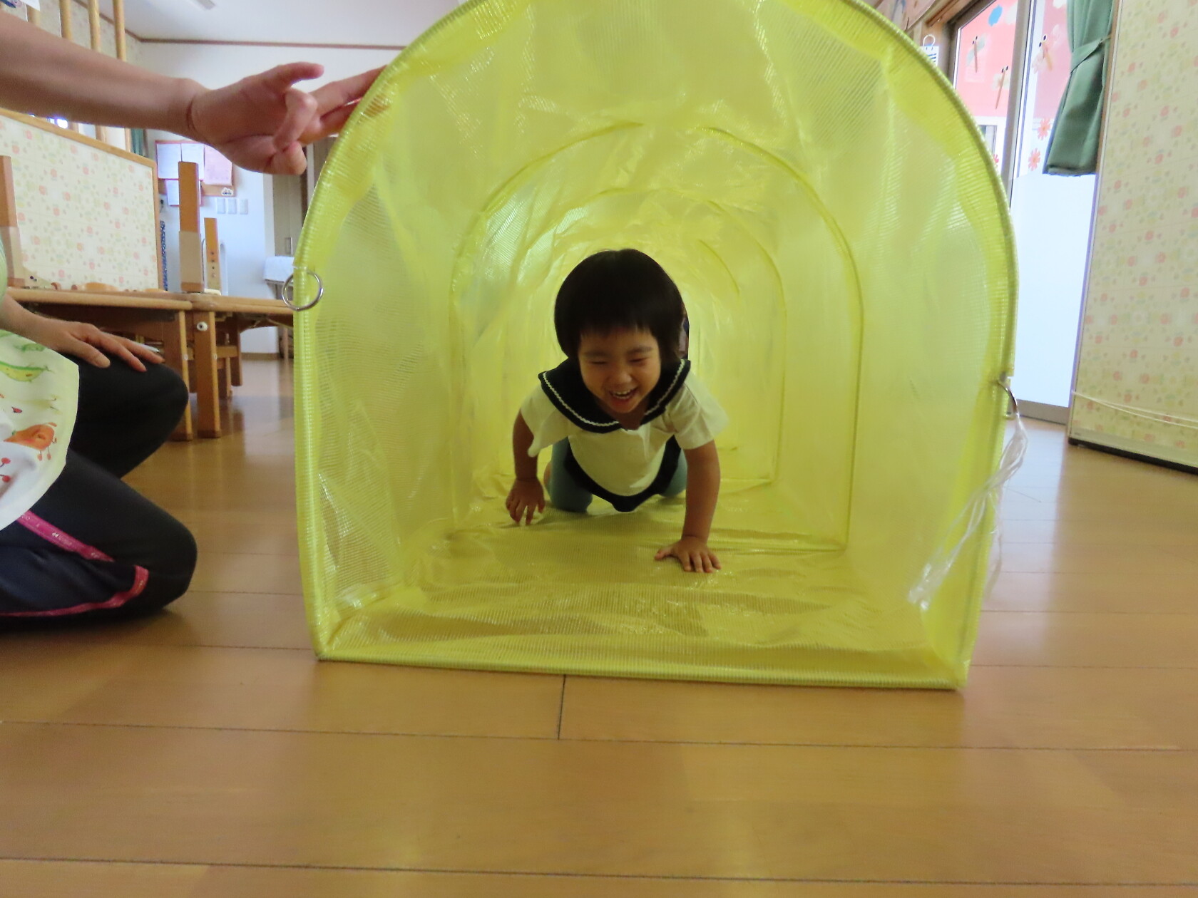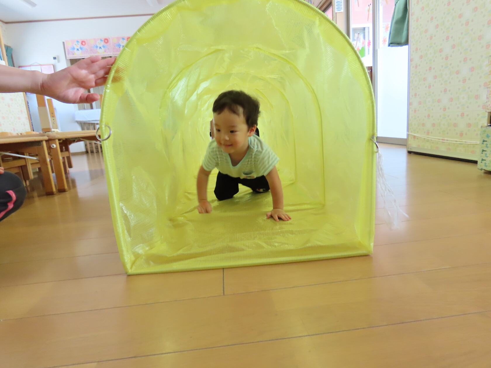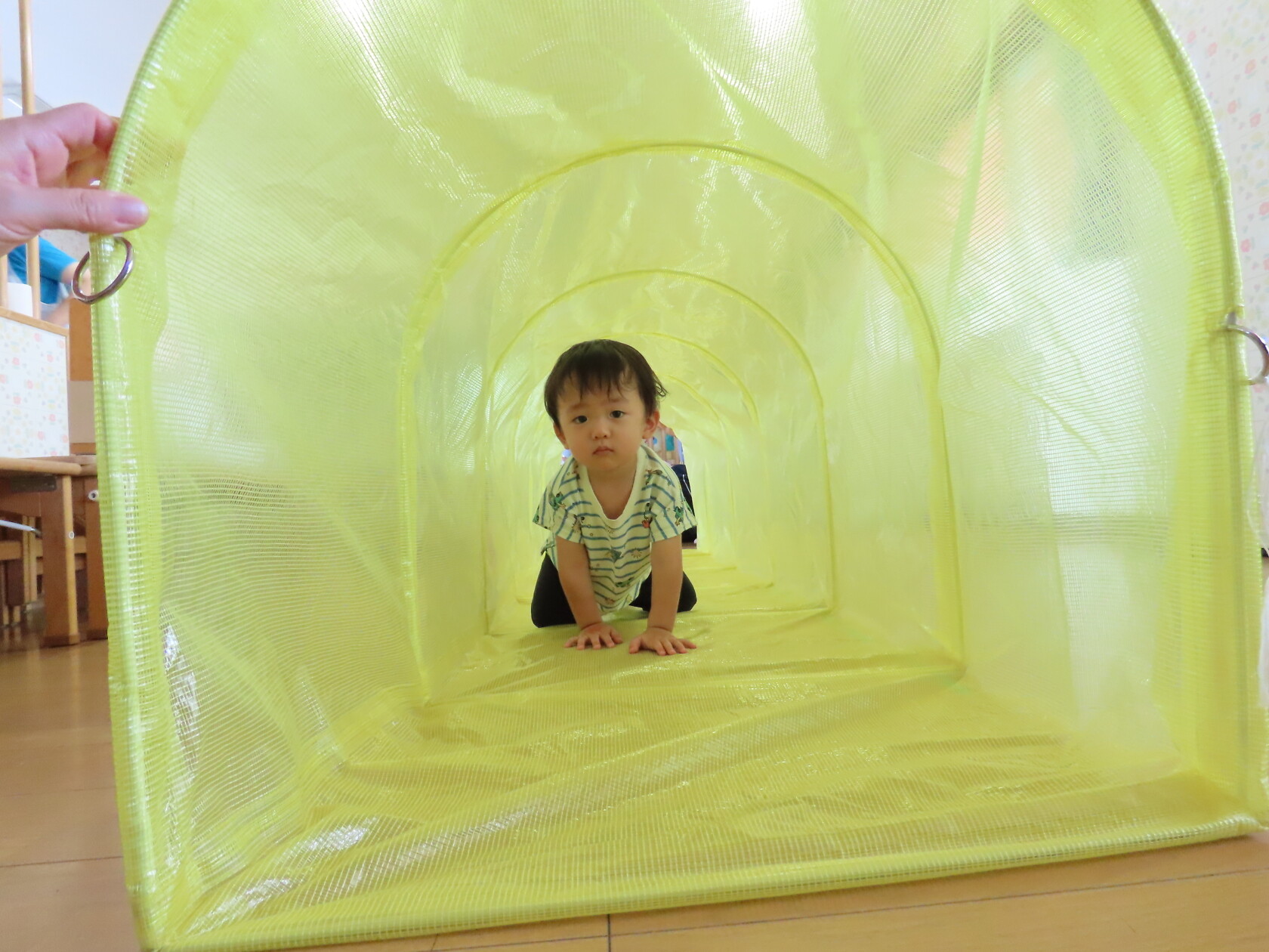 昨日から運動会の練習が始まり、今日はお部屋でドリームトンネルをくぐる練習を行いました!