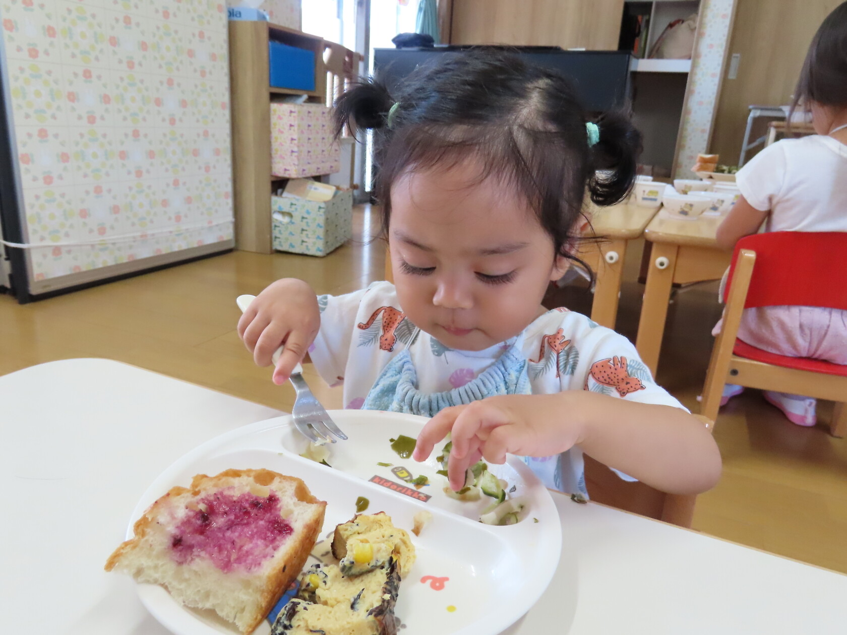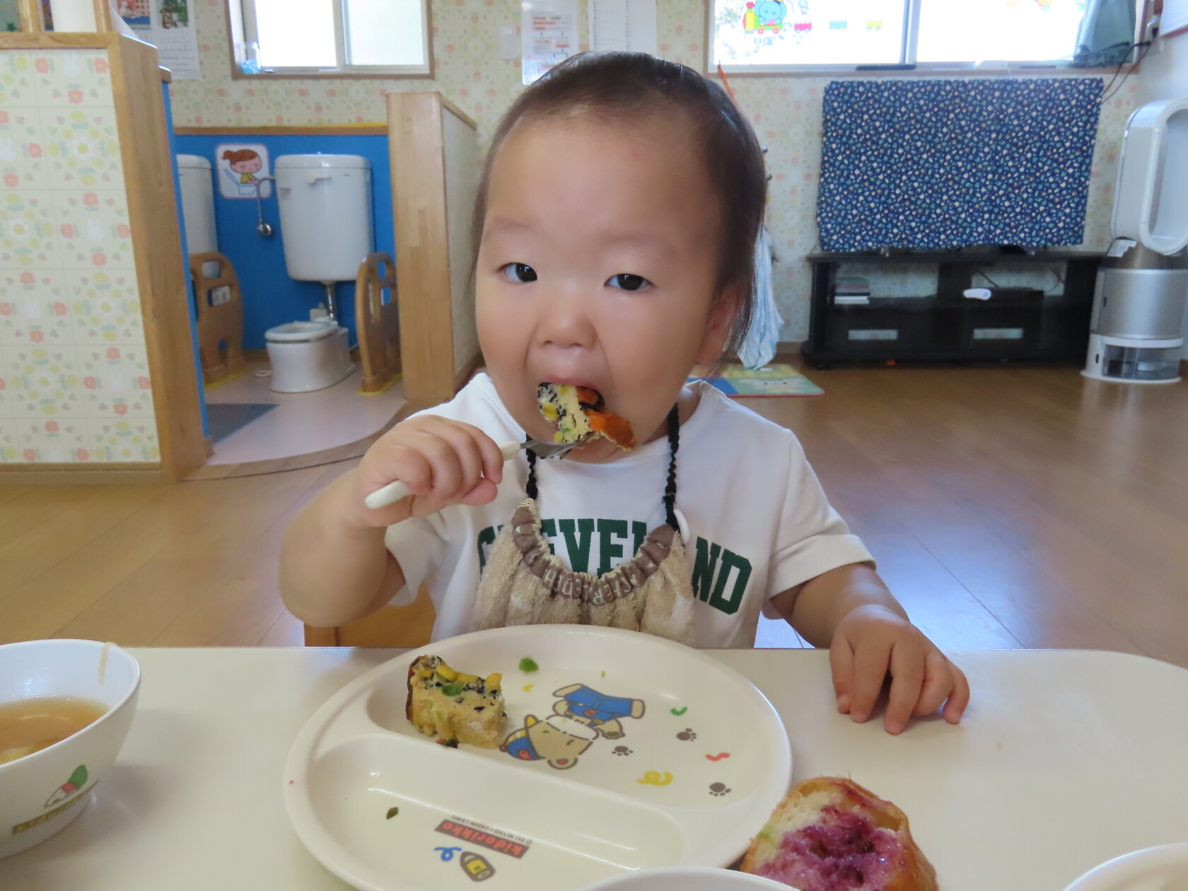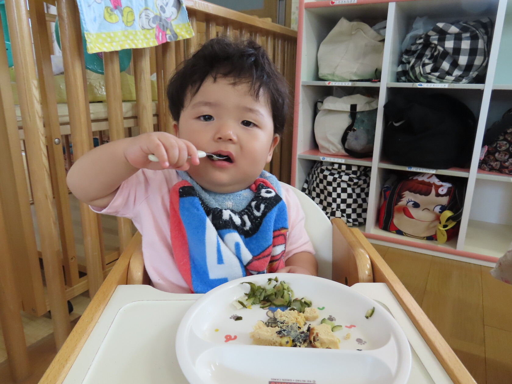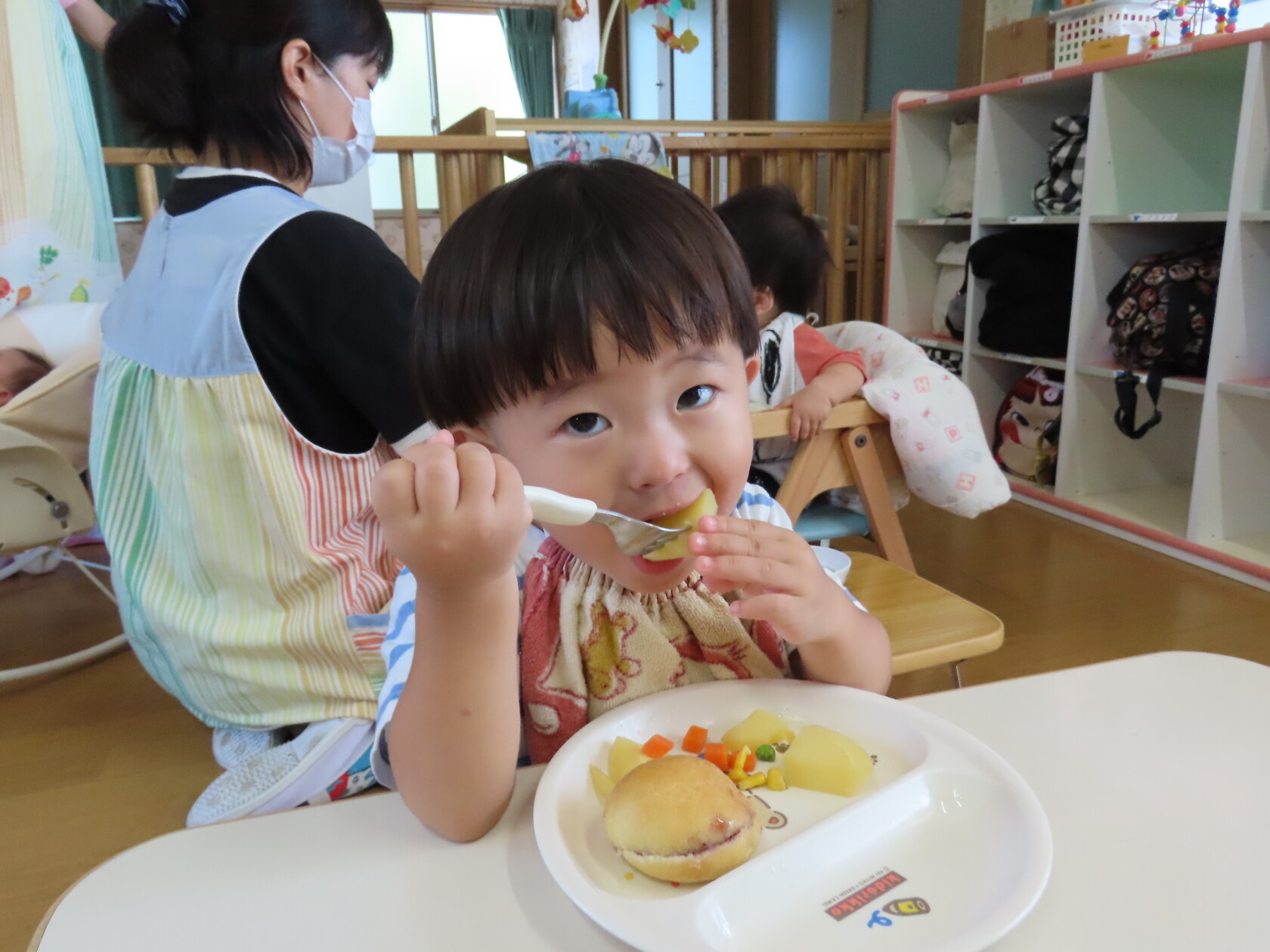 1歳児さんは、フォークの使い方が上手になってきて、一生懸命口に運んで食べています🍴