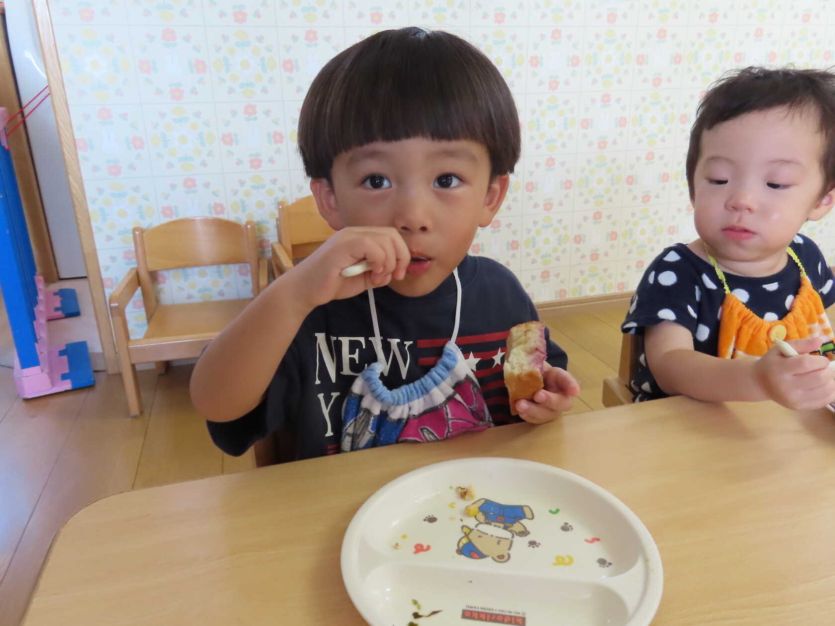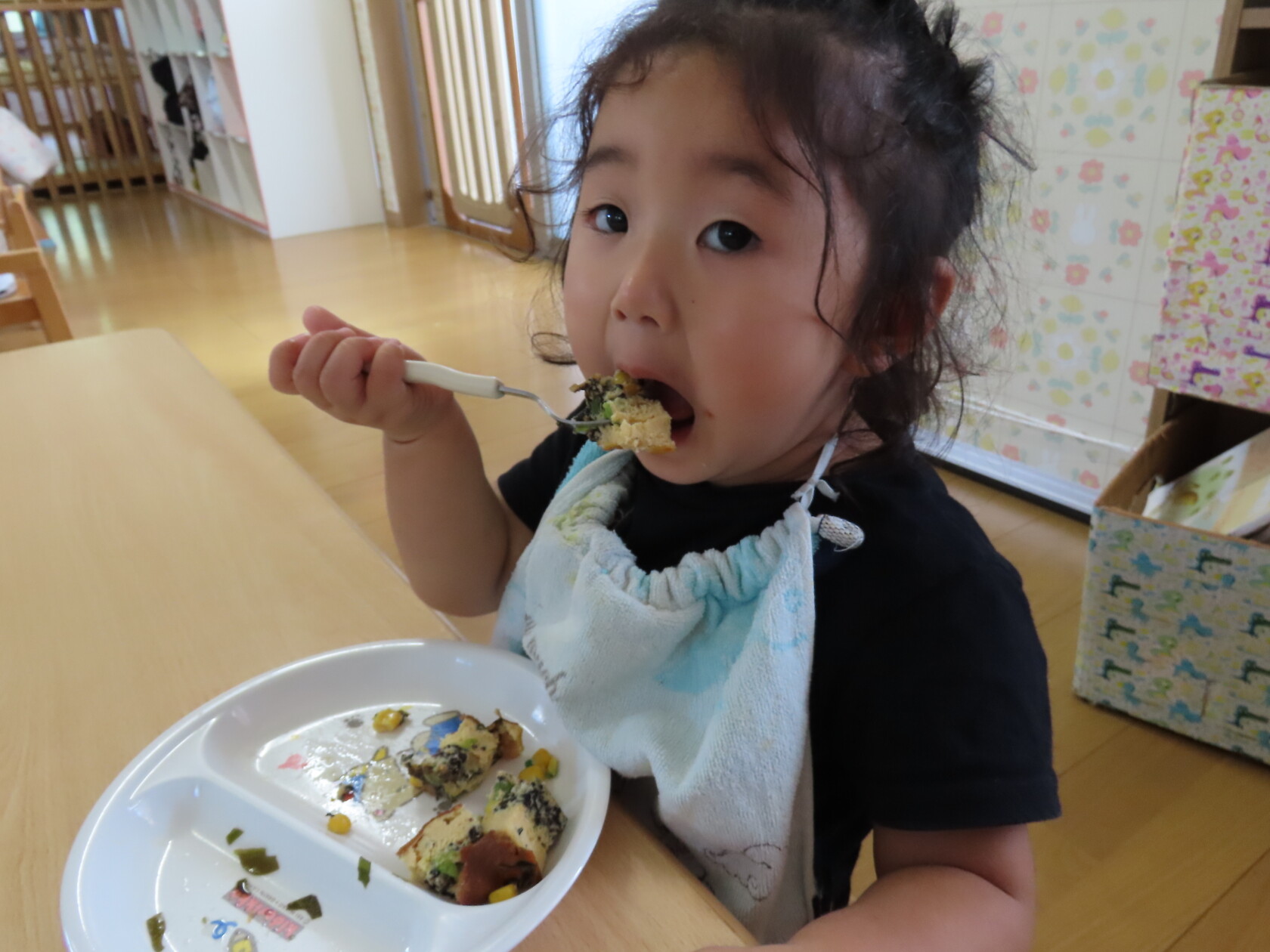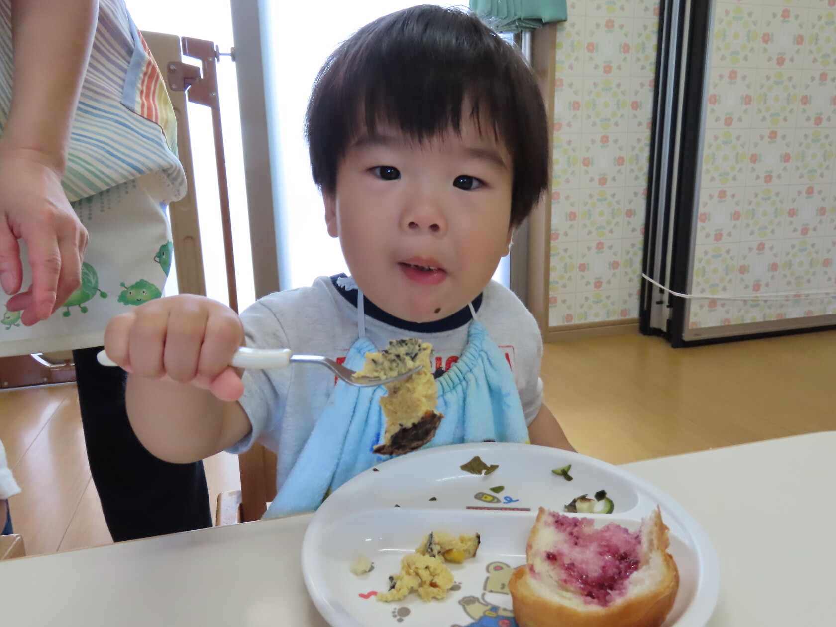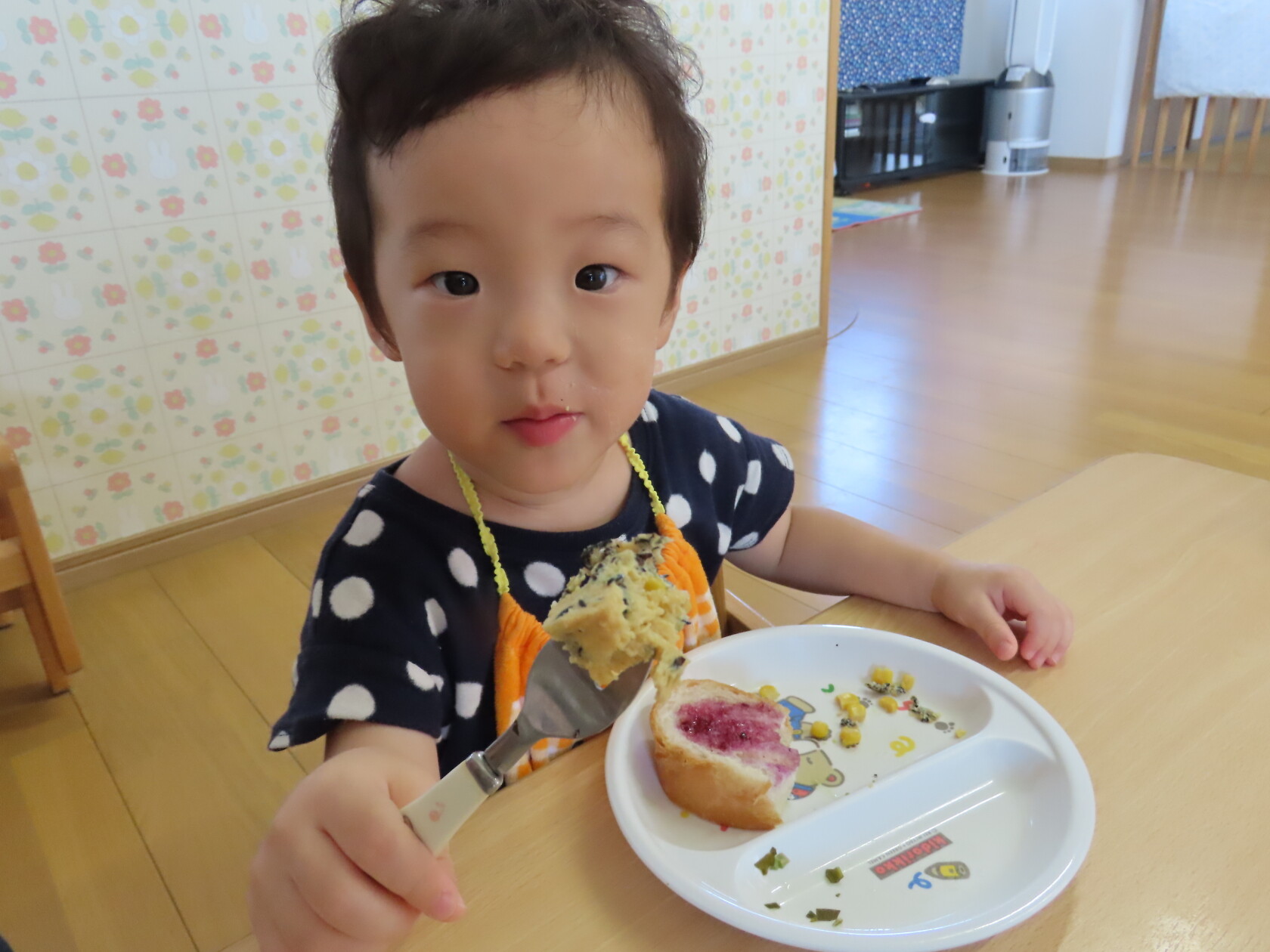 1歳児さんは、フォークの使い方が上手になってきて、一生懸命口に運んで食べています🍴