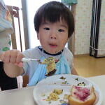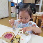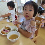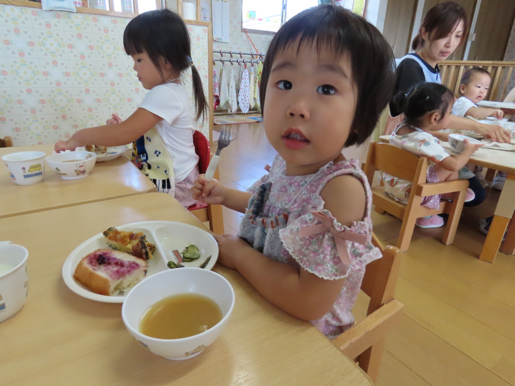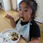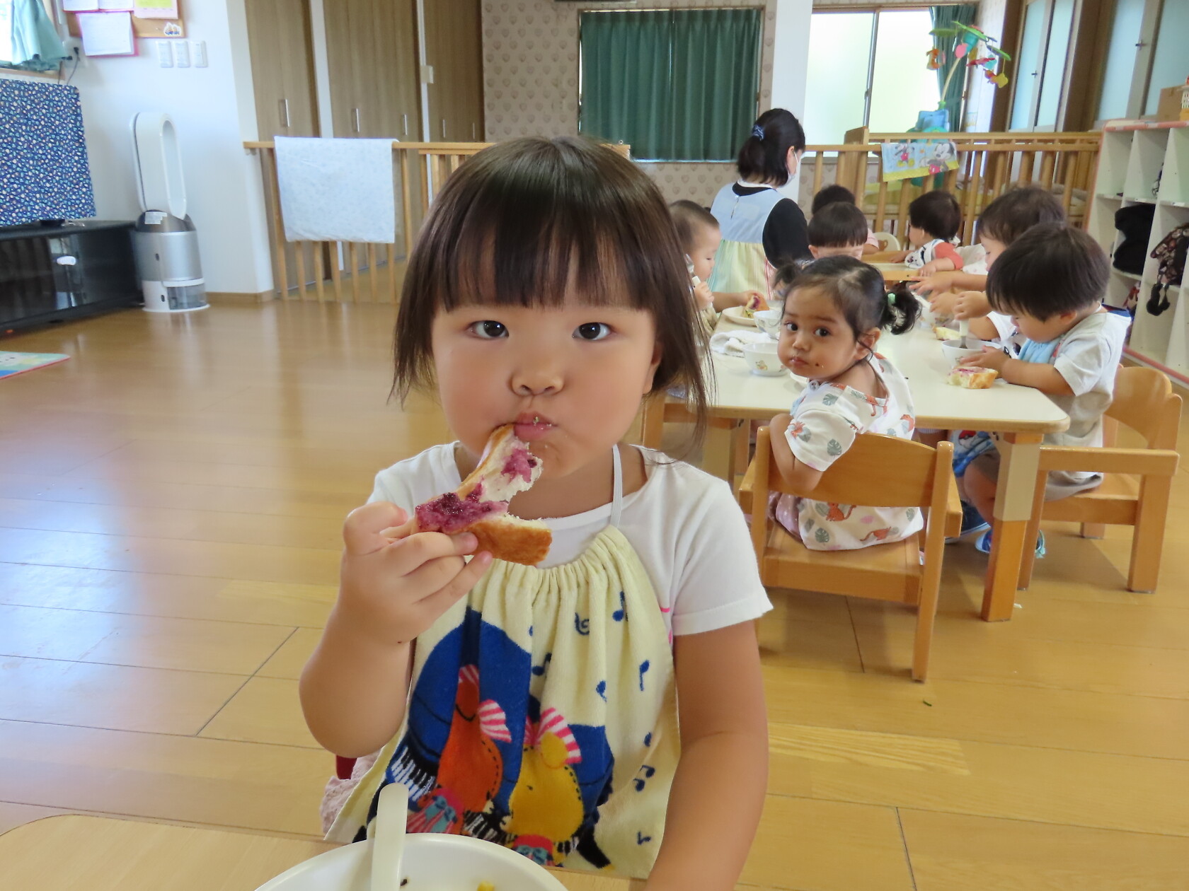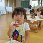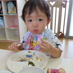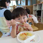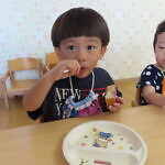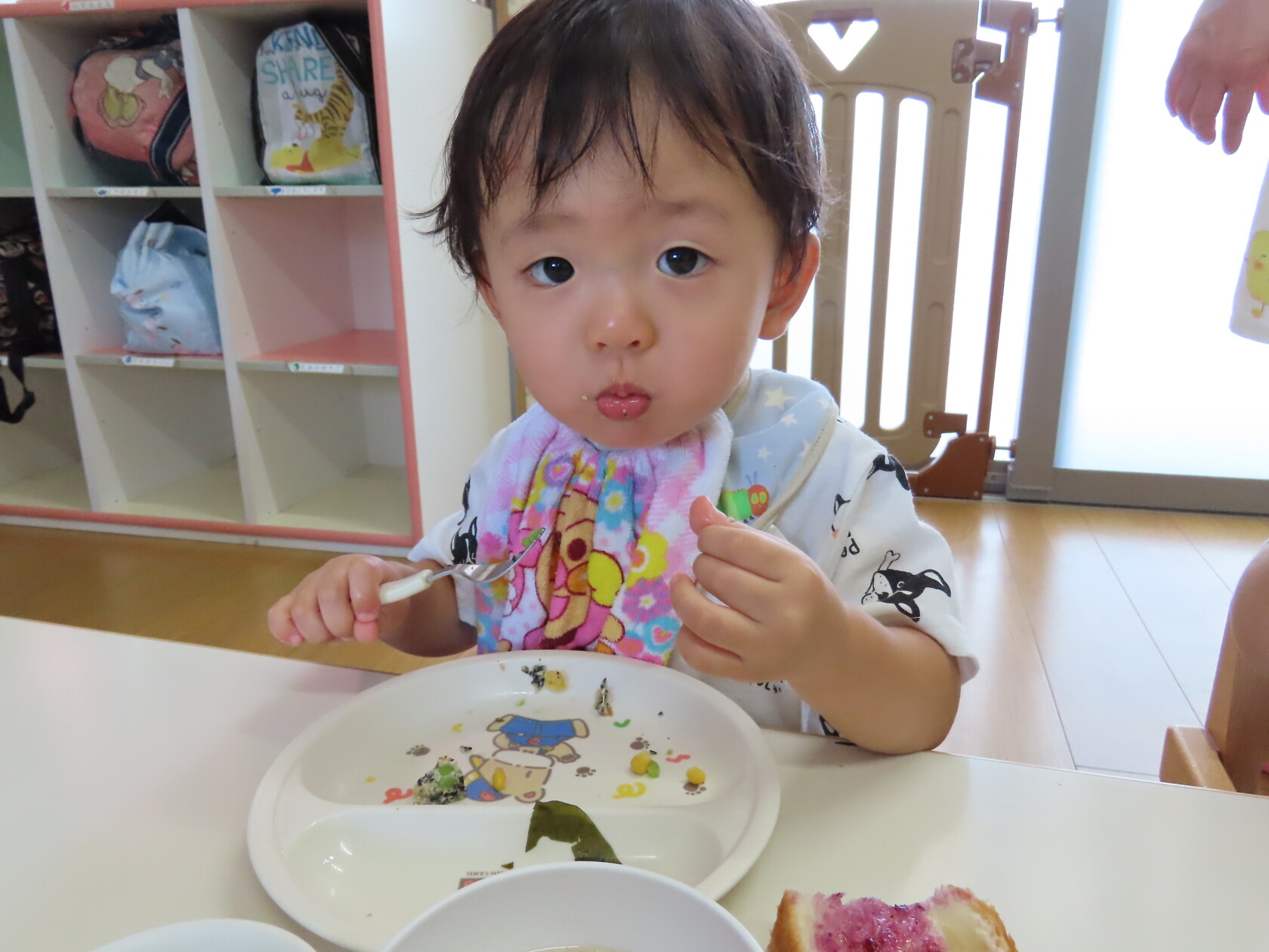 2歳児さんは、食べながら「これな~に?」と食材に興味を持ったり、「おいしいね」と会話を楽しみながら食べています🎵