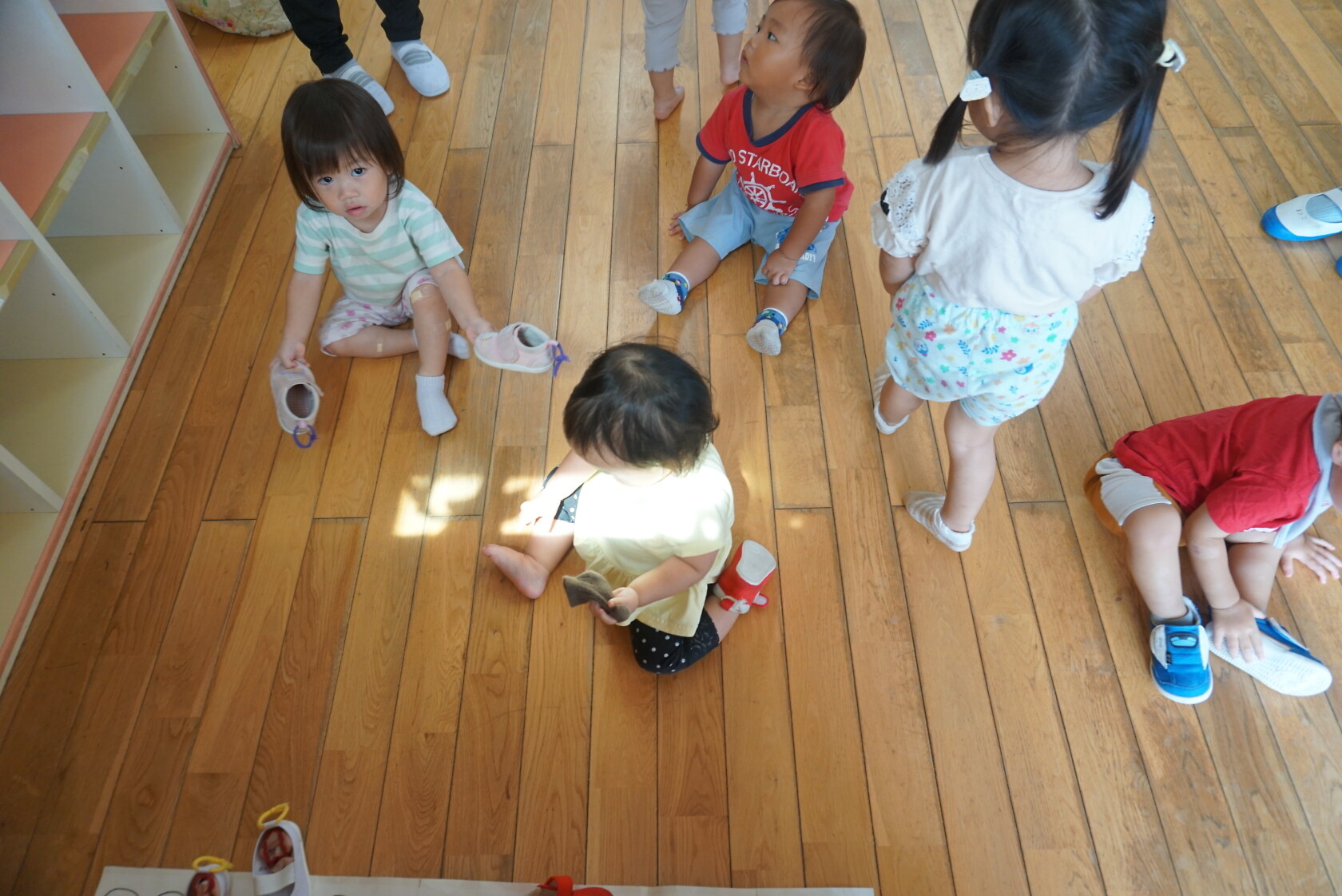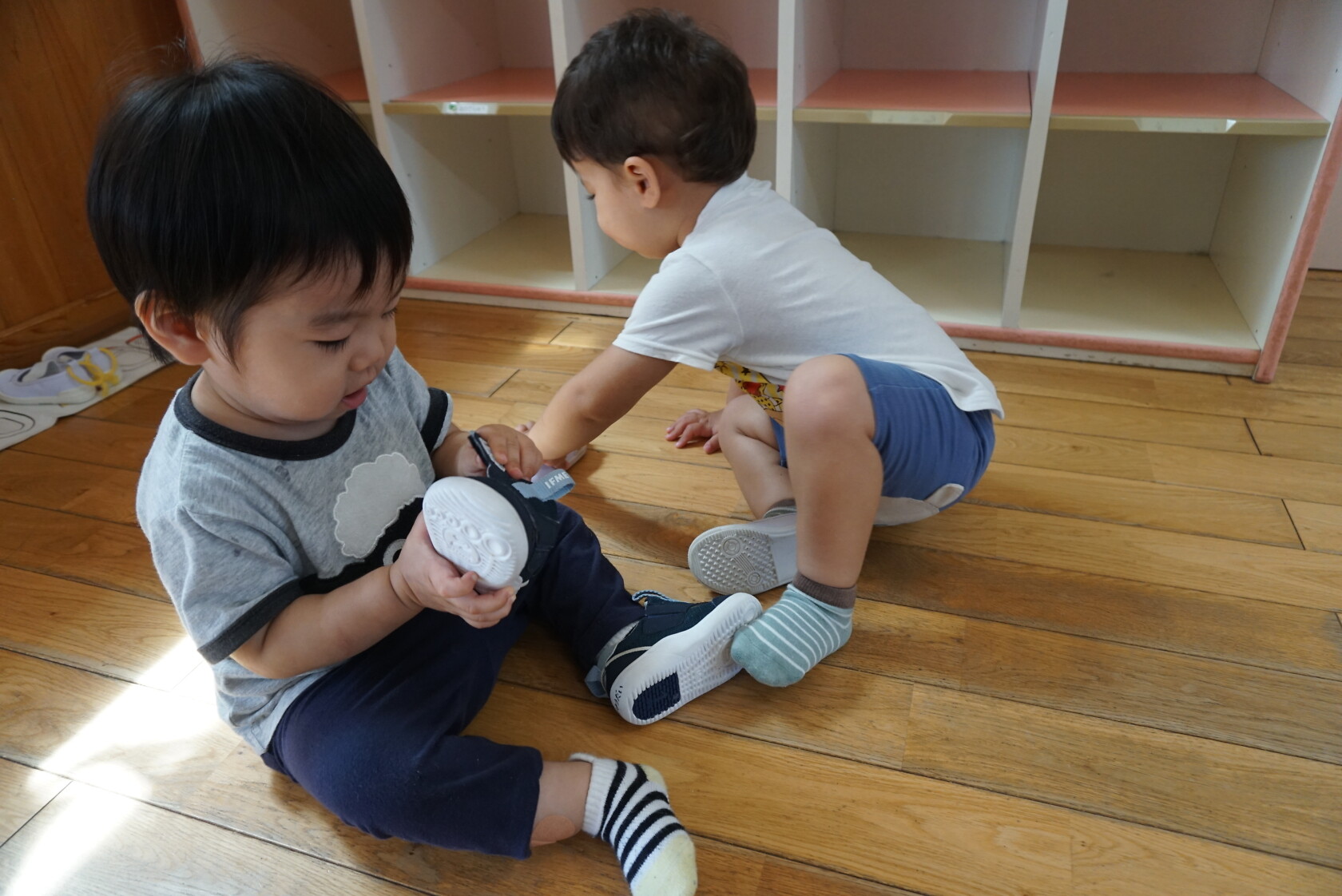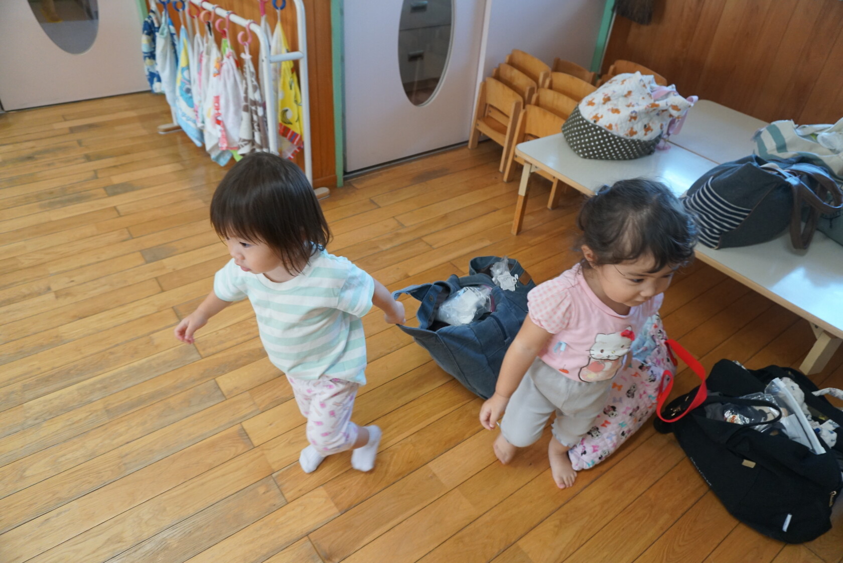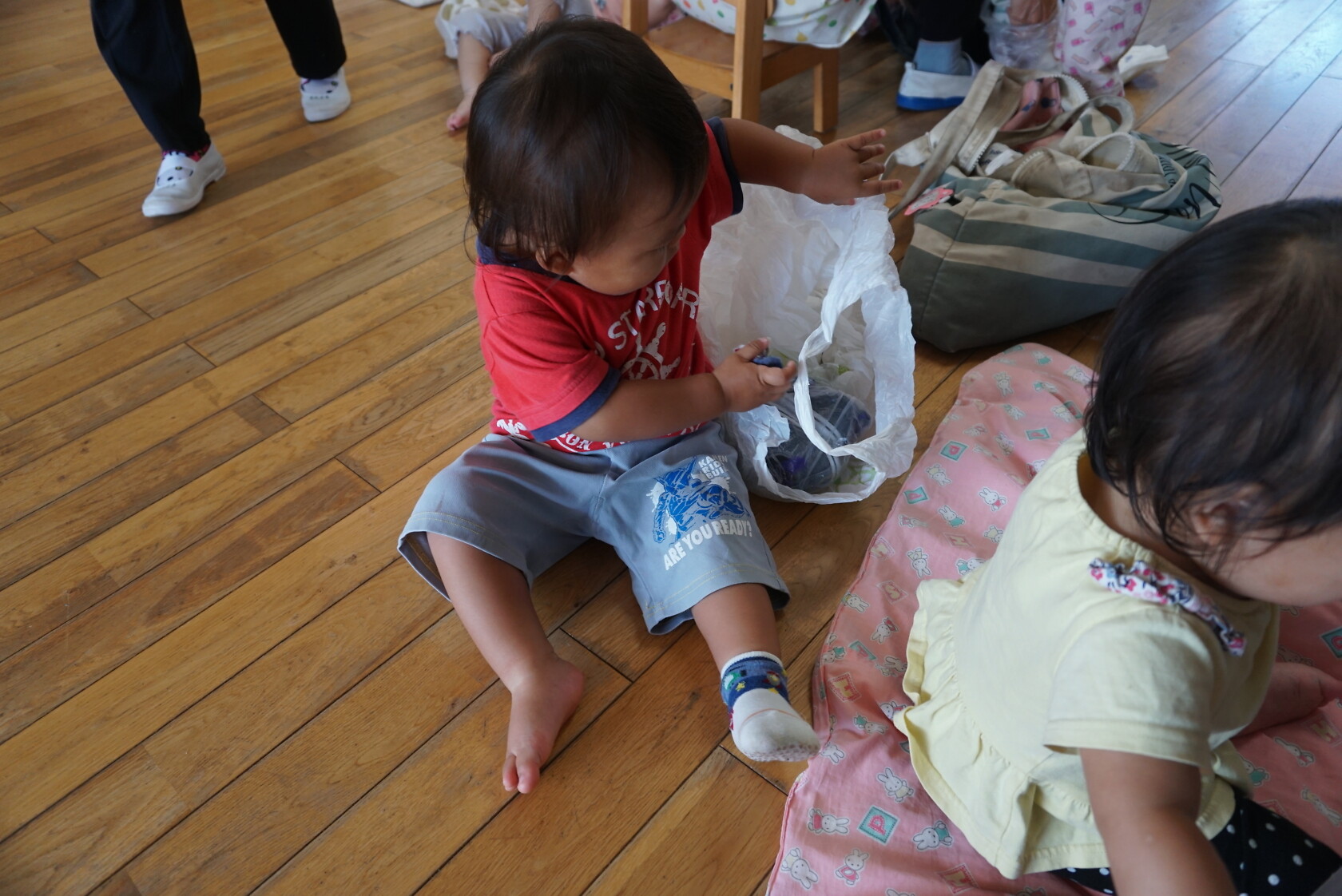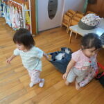 お着替えの前には、上履きを決められた場所に置き、カバンを運んだりしています💨 トイレやお着替えでは、ズボンやパンツの上げ下ろしを頑張っています💪