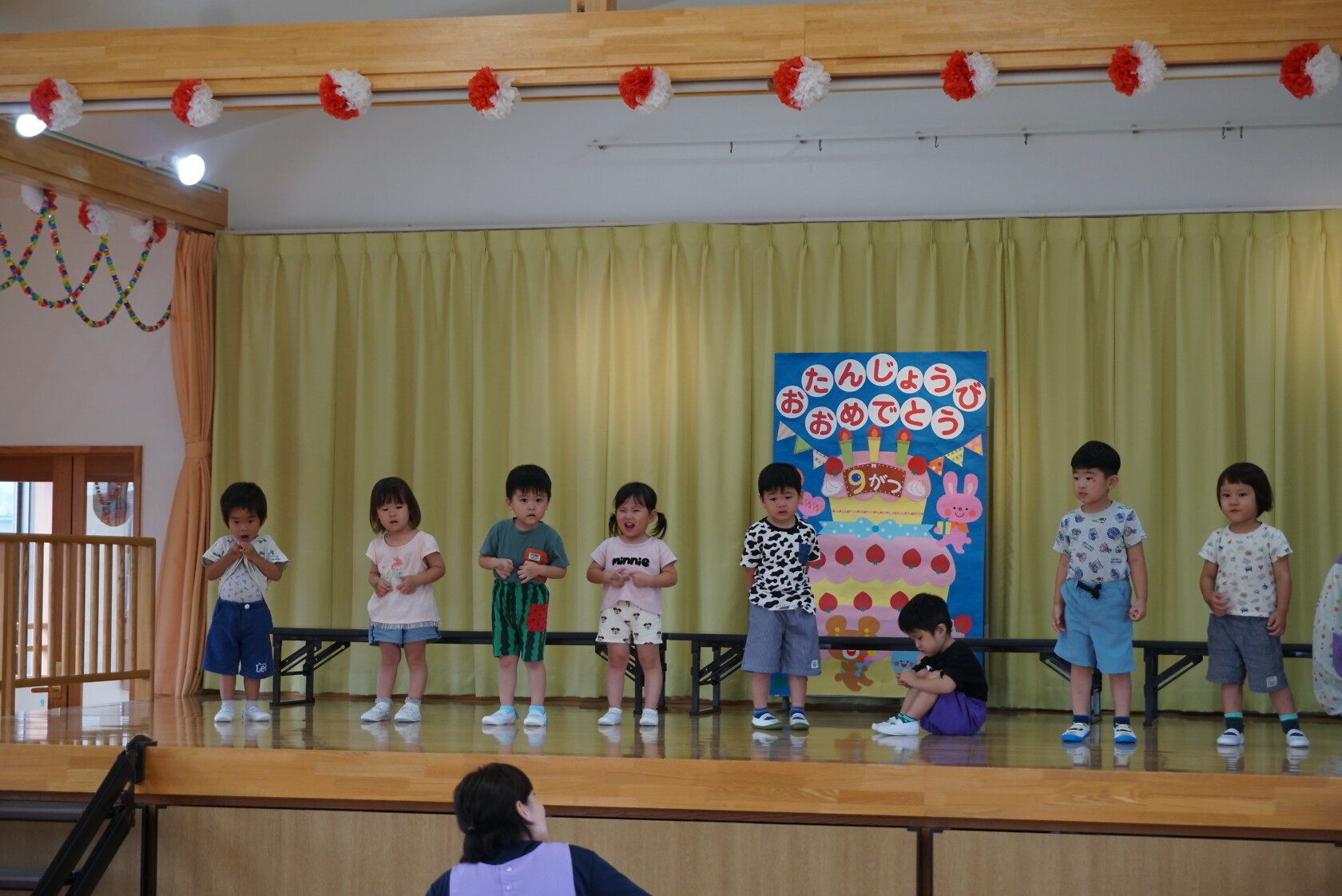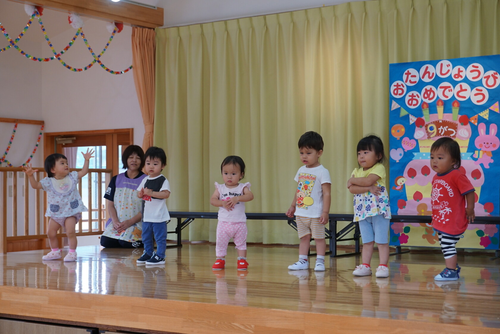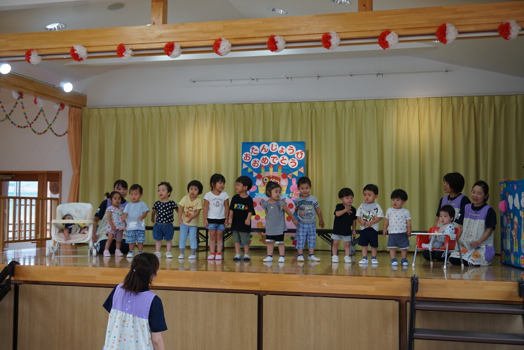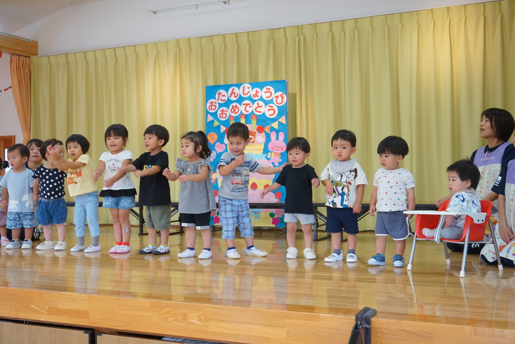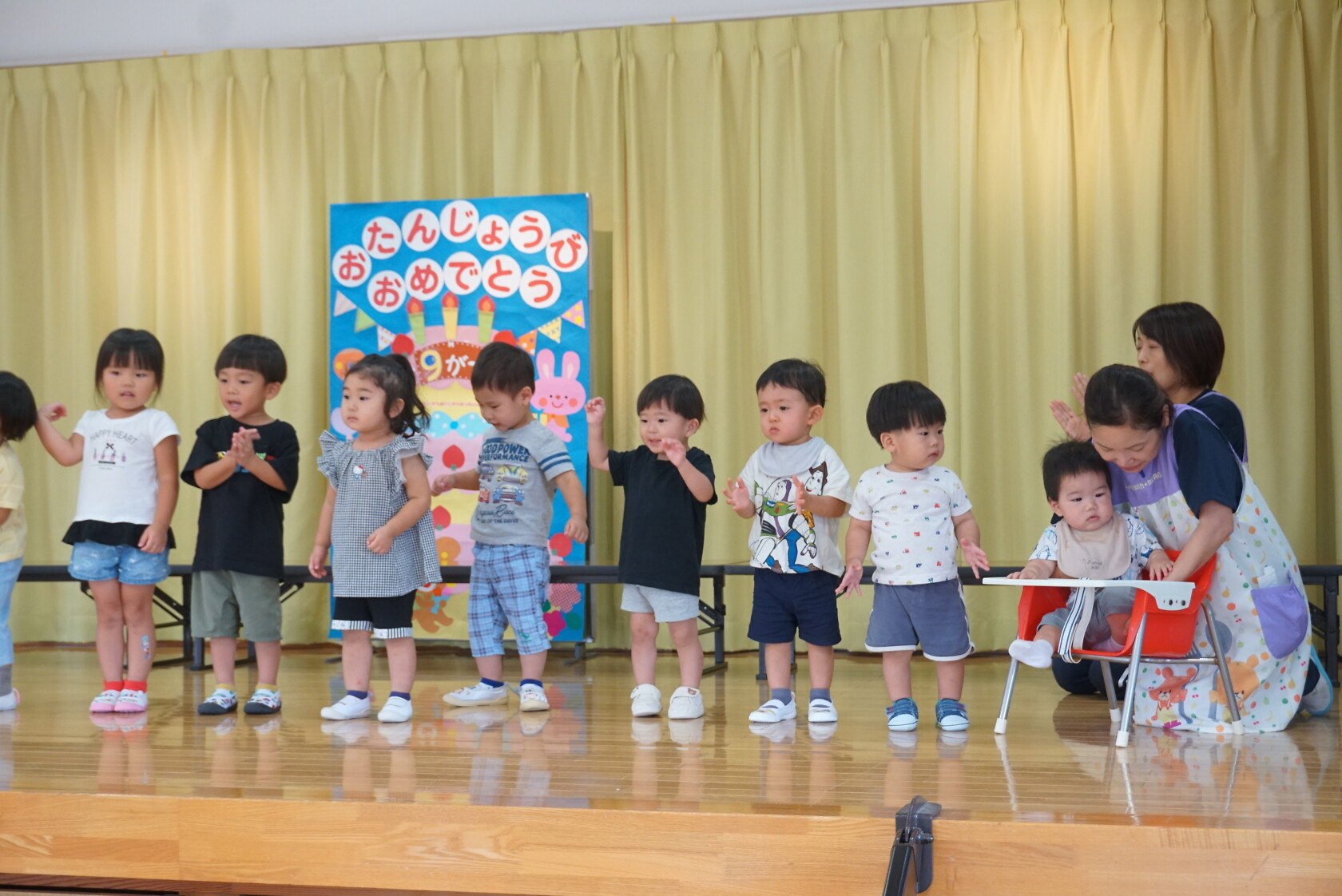 お誕生会(未満児) 公開済み: 2023年9月20日更新: 2023年9月20日 今日は、9月生まれのお誕生会でした🎂 未満児は、ちゅうりっぷ組から2名のお友達が舞台に上がりました😃 いつもと違う環境の中で、練習通りにはいかなかったようですが、時々、笑顔が見られましたね🎵 歌のプレゼントでは、小規模ちゅうりっぷ・さくら組「かたたたき」「大きな栗の木の下で」 さくら組「かたたたき」「いもほりのうた」 ちゅうりっぷ組「かたたたき」「おへそ」を、歌ってくれました🎼 令和5年度が始まり、半年がたちました🙂 4月当初に比べ、みんなが笑顔で舞台に立つことができ、とても成長を感じています😊 これからも、楽しみです✨ 9月生まれのお友達、おめでとうございます👏