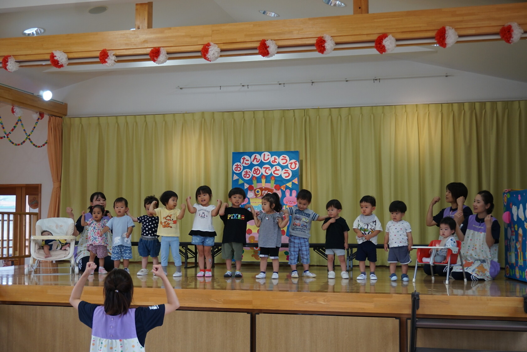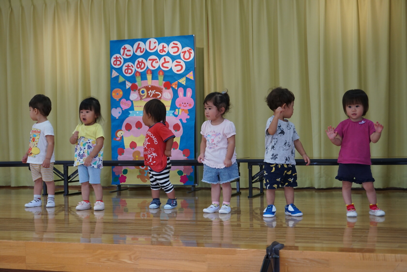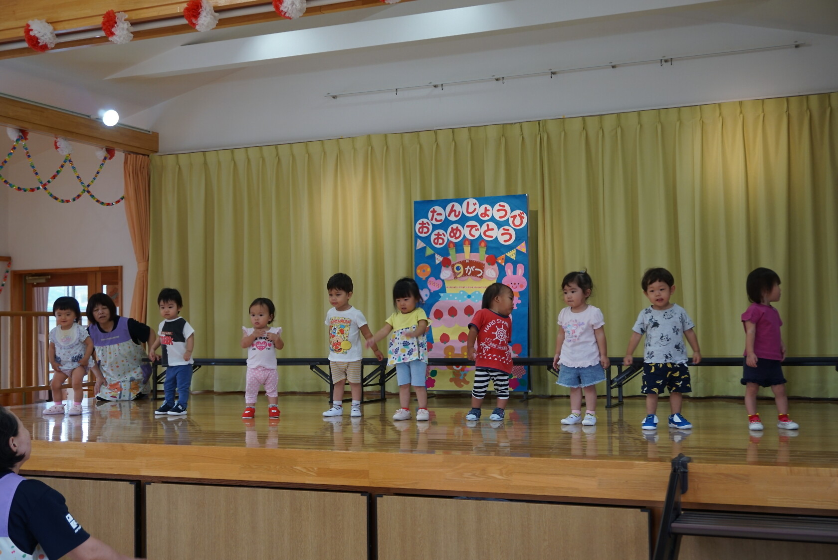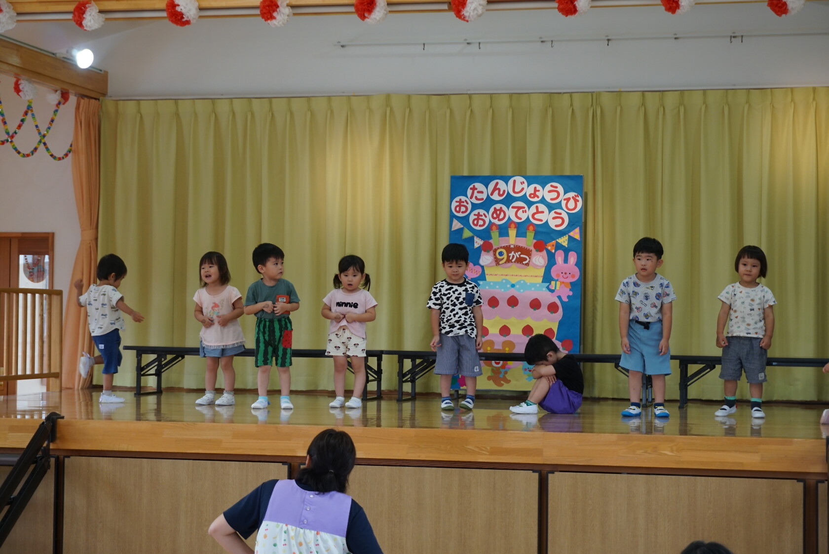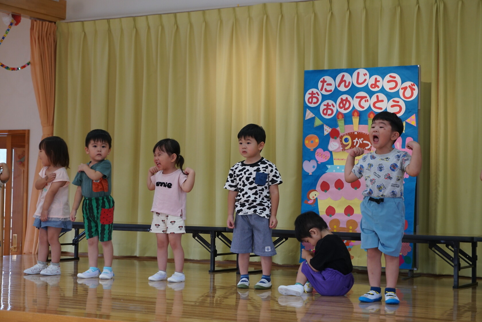 お誕生会(未満児) 公開済み: 2023年9月20日更新: 2023年9月20日 今日は、9月生まれのお誕生会でした🎂 未満児は、ちゅうりっぷ組から2名のお友達が舞台に上がりました😃 いつもと違う環境の中で、練習通りにはいかなかったようですが、時々、笑顔が見られましたね🎵 歌のプレゼントでは、小規模ちゅうりっぷ・さくら組「かたたたき」「大きな栗の木の下で」 さくら組「かたたたき」「いもほりのうた」 ちゅうりっぷ組「かたたたき」「おへそ」を、歌ってくれました🎼 令和5年度が始まり、半年がたちました🙂 4月当初に比べ、みんなが笑顔で舞台に立つことができ、とても成長を感じています😊 これからも、楽しみです✨ 9月生まれのお友達、おめでとうございます👏