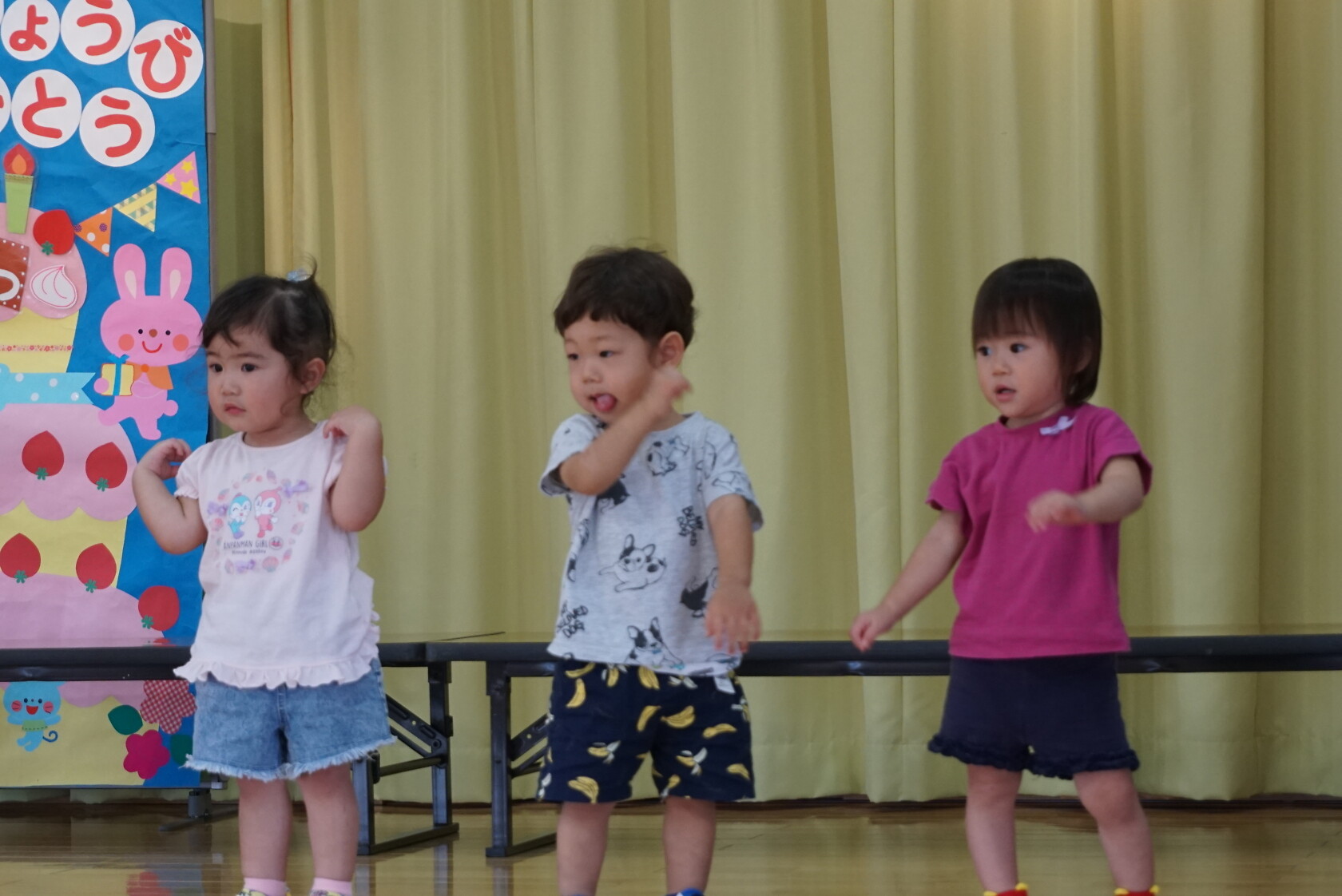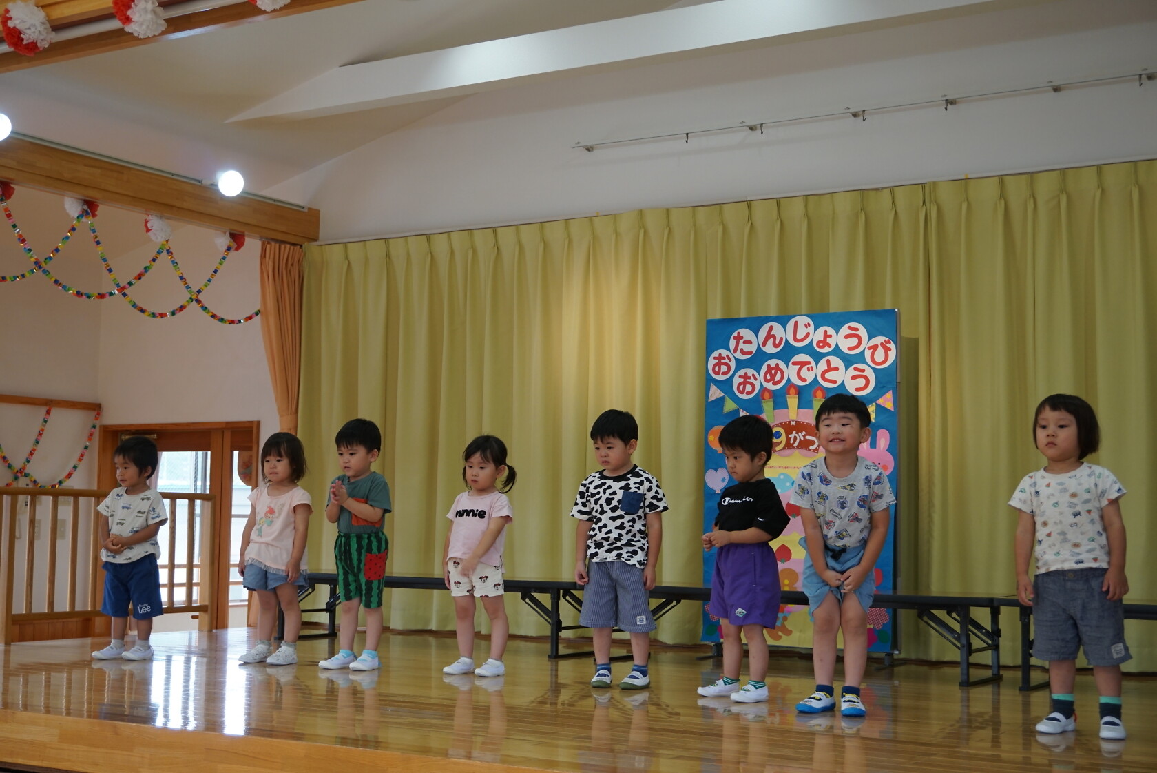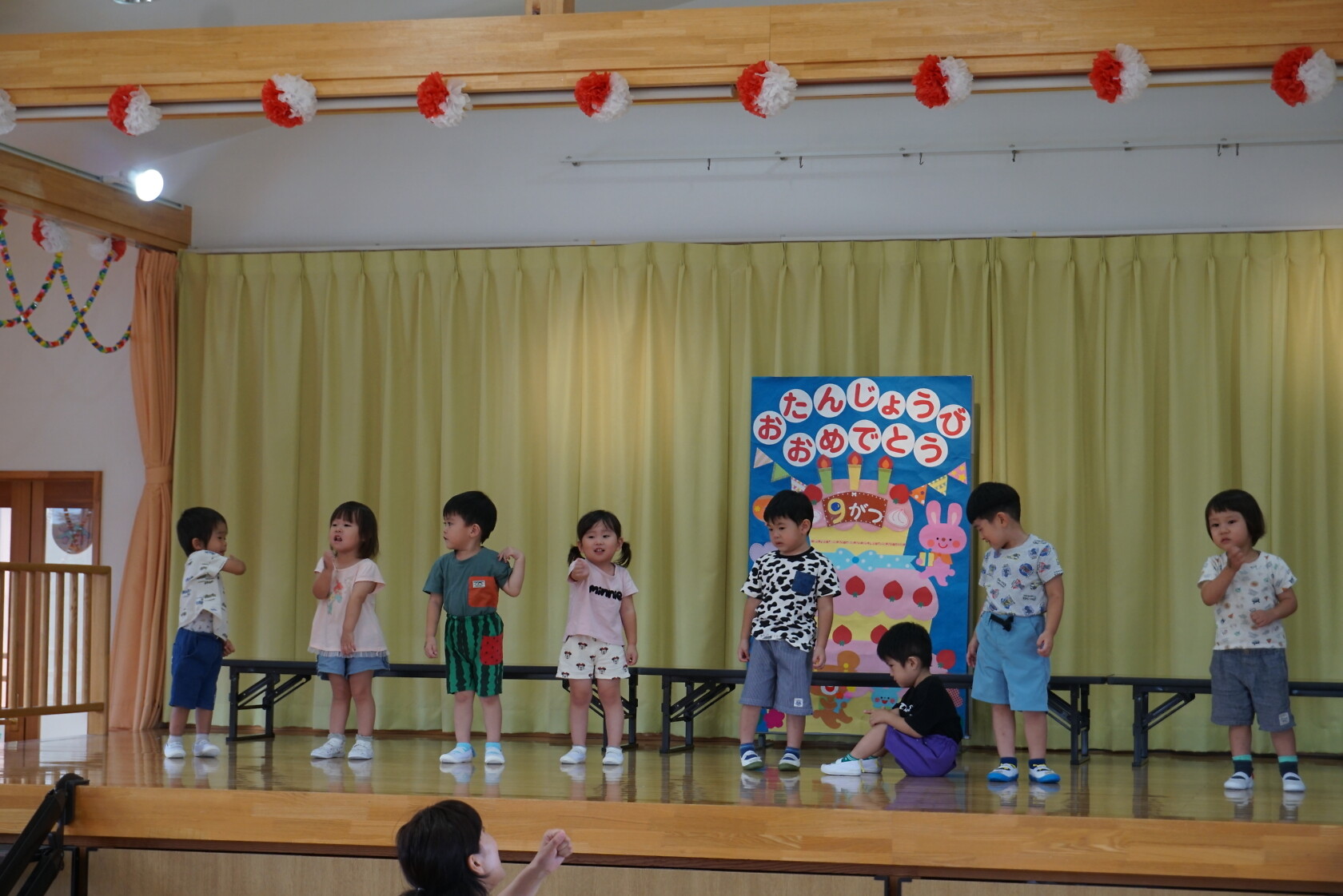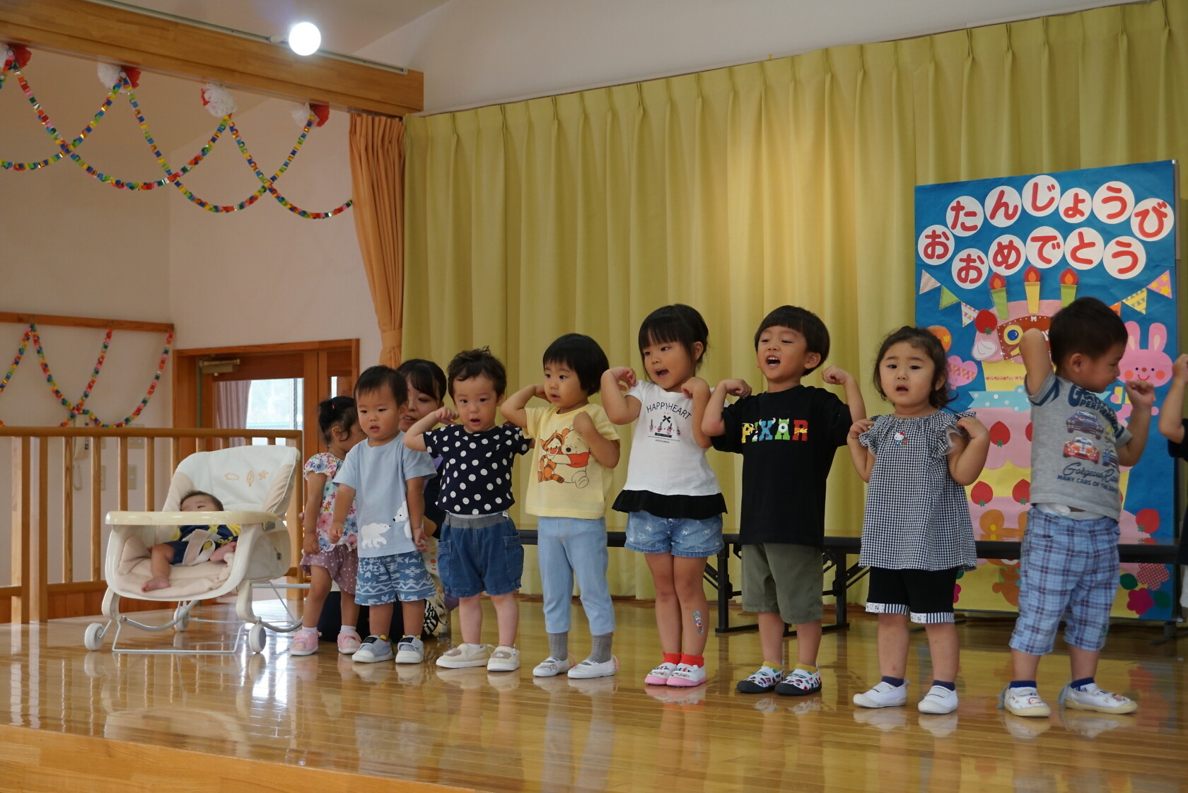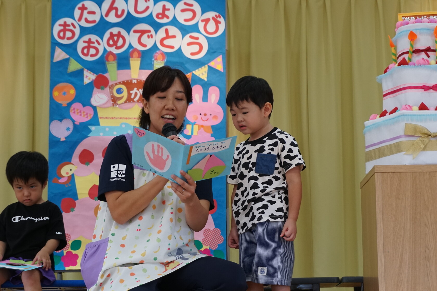 お誕生会(未満児) 公開済み: 2023年9月20日更新: 2023年9月20日 今日は、9月生まれのお誕生会でした🎂 未満児は、ちゅうりっぷ組から2名のお友達が舞台に上がりました😃 いつもと違う環境の中で、練習通りにはいかなかったようですが、時々、笑顔が見られましたね🎵 歌のプレゼントでは、小規模ちゅうりっぷ・さくら組「かたたたき」「大きな栗の木の下で」 さくら組「かたたたき」「いもほりのうた」 ちゅうりっぷ組「かたたたき」「おへそ」を、歌ってくれました🎼 令和5年度が始まり、半年がたちました🙂 4月当初に比べ、みんなが笑顔で舞台に立つことができ、とても成長を感じています😊 これからも、楽しみです✨ 9月生まれのお友達、おめでとうございます👏