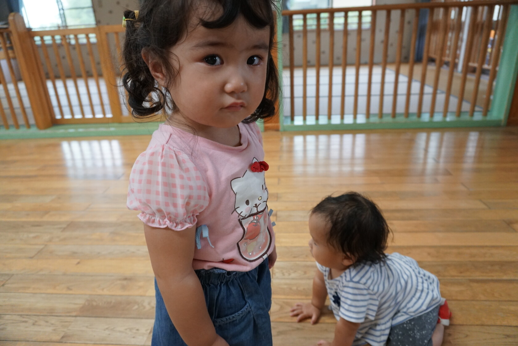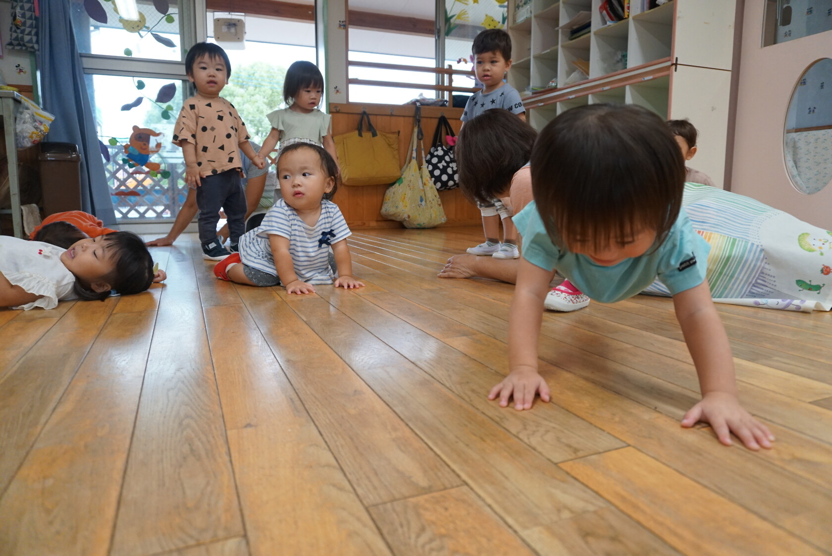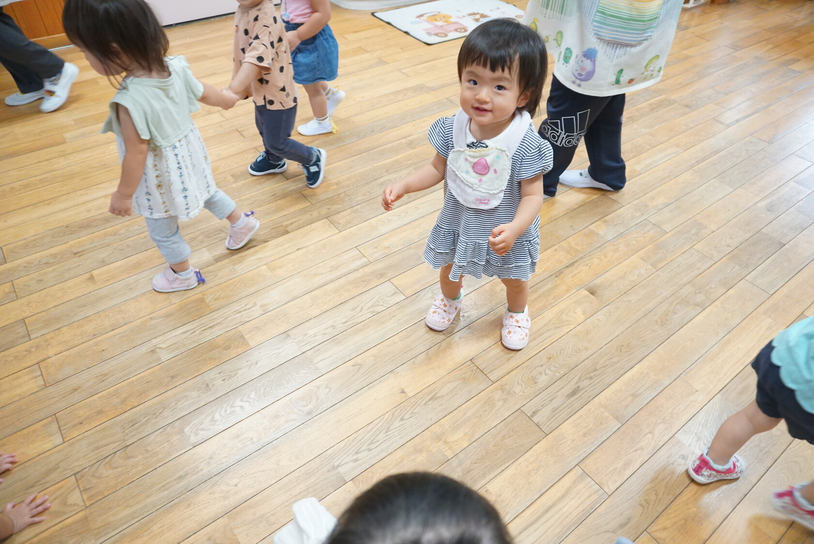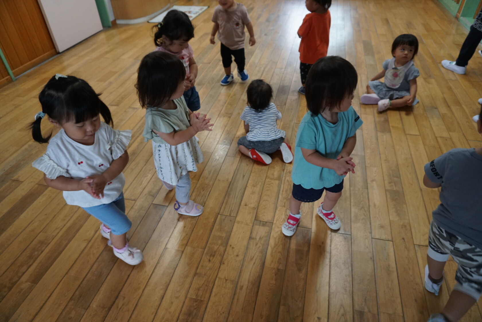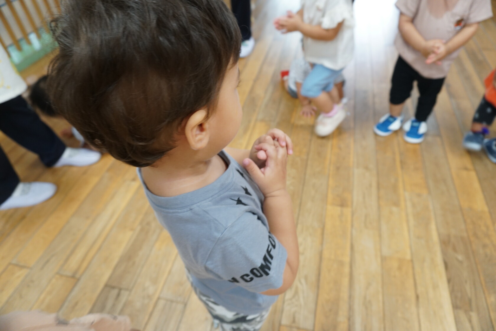 今日は久しぶりに気温が下がり、いつもより過ごしやすい気候となりました☁ 外では、以上さんが体育指導で運動会の練習をしていたので、さくら組さんは外の様子を見て応援したり、おもちゃで遊んだり、リトミックを楽しみました🎵 以前よりも動きが上手になり、ピアノの音が変わると、違う動きができるようになってきました👍 今は、歩く・うさぎ・馬・汽車・メダカ・金魚と簡単な動きですが、少しずつ色々な動きを増やしていけるようにしていきたいと思います😊