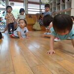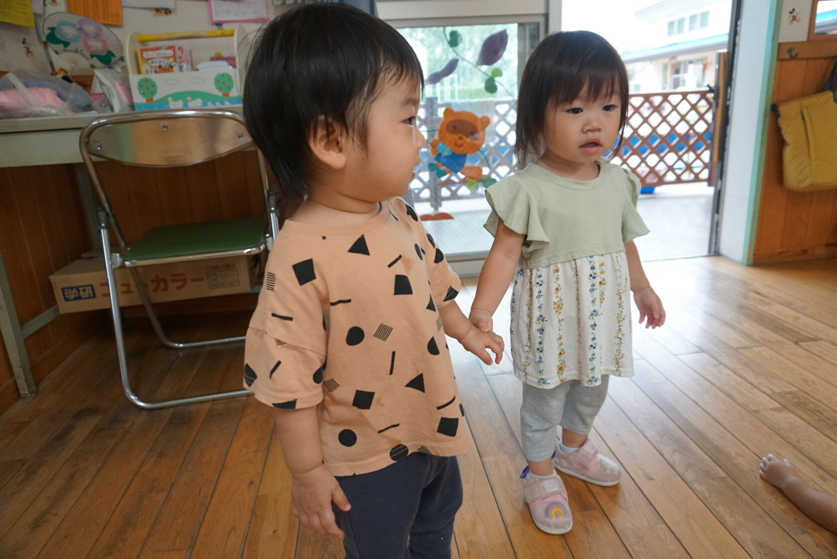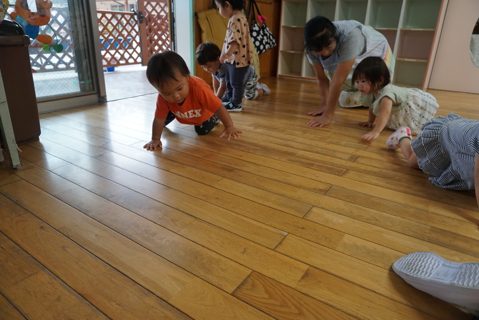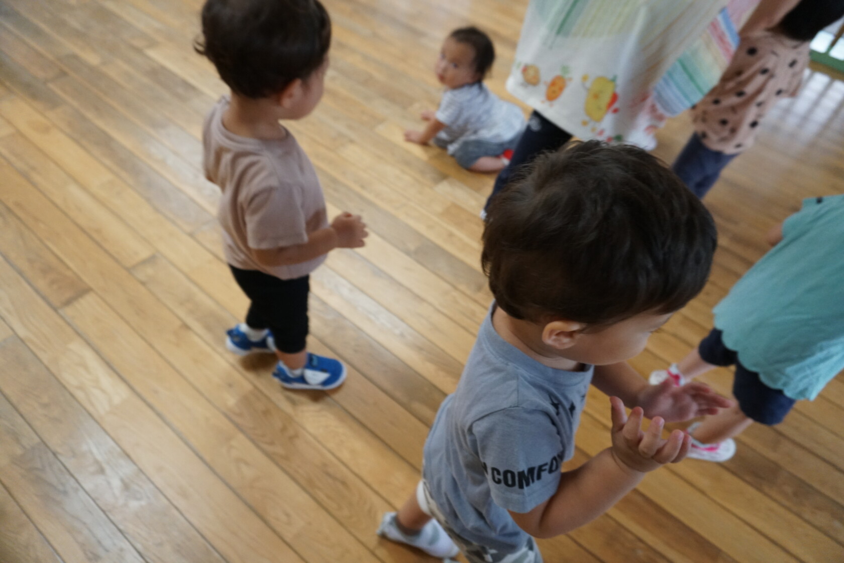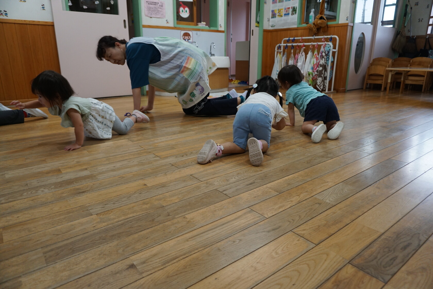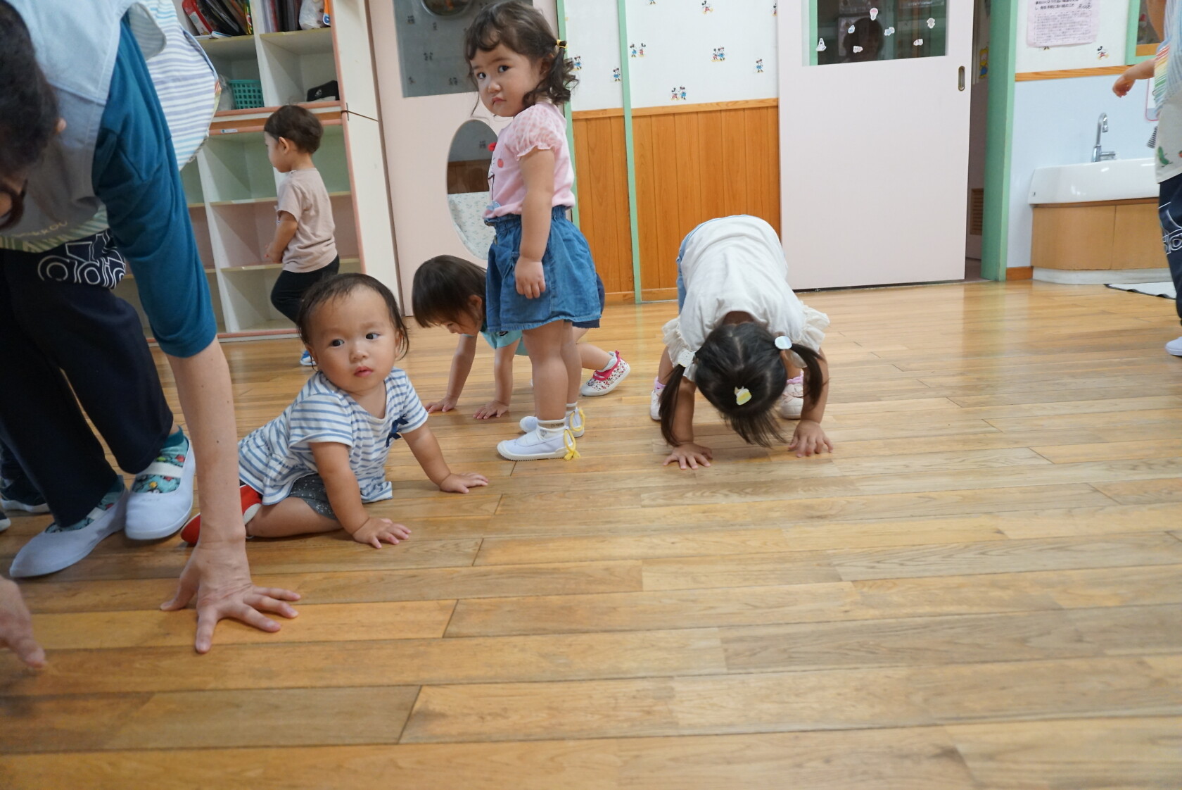 今日は久しぶりに気温が下がり、いつもより過ごしやすい気候となりました☁ 外では、以上さんが体育指導で運動会の練習をしていたので、さくら組さんは外の様子を見て応援したり、おもちゃで遊んだり、リトミックを楽しみました🎵 以前よりも動きが上手になり、ピアノの音が変わると、違う動きができるようになってきました👍 今は、歩く・うさぎ・馬・汽車・メダカ・金魚と簡単な動きですが、少しずつ色々な動きを増やしていけるようにしていきたいと思います😊