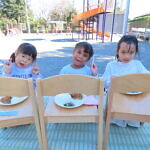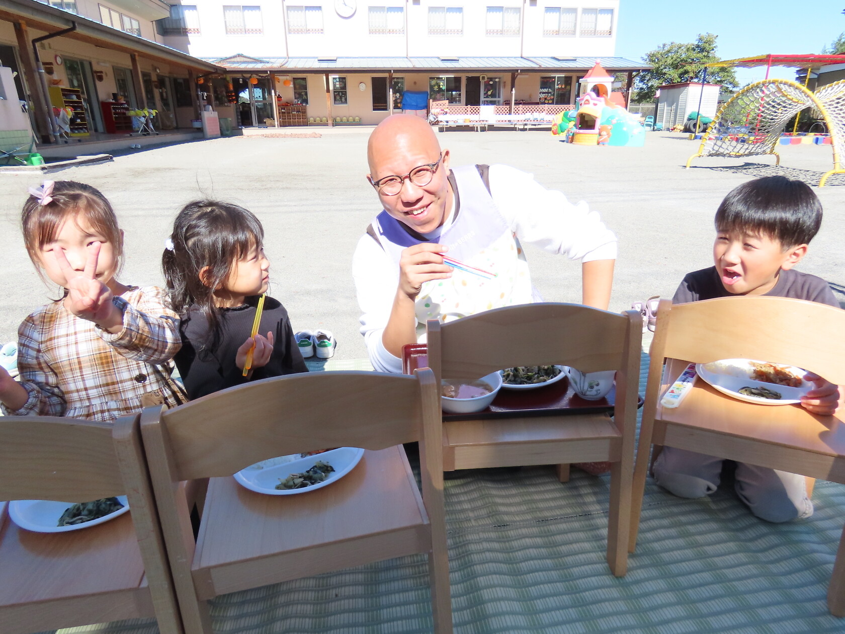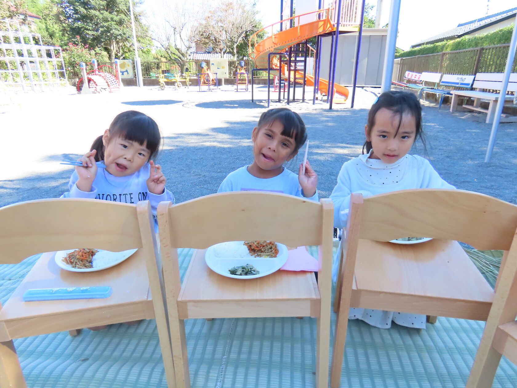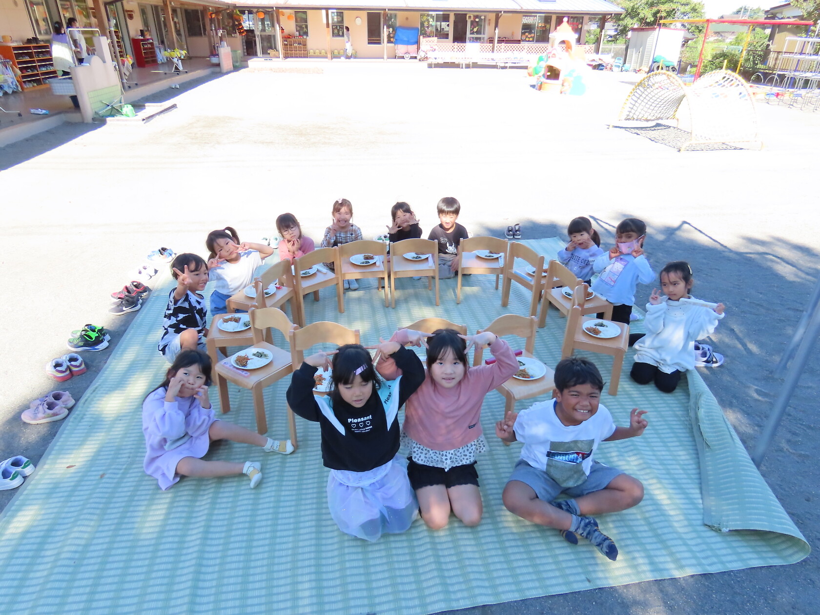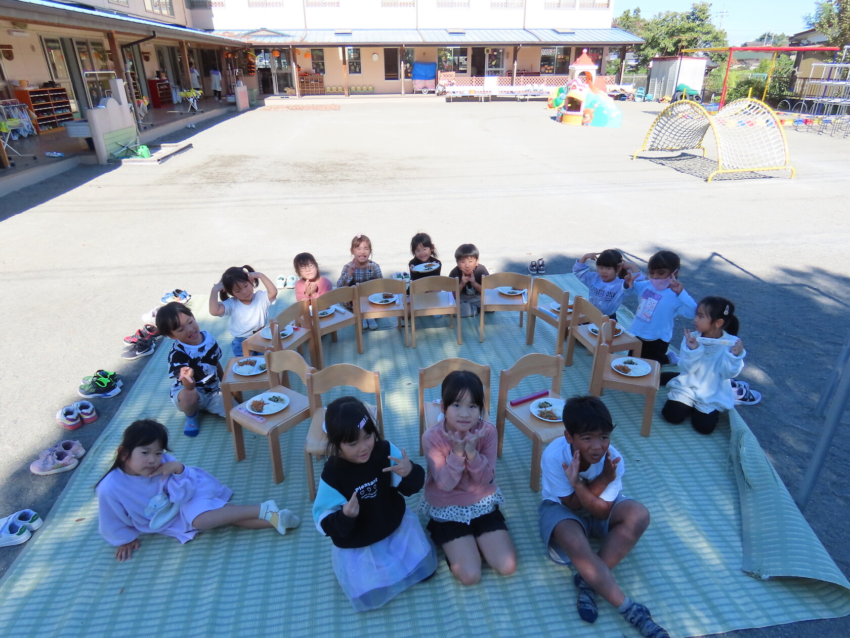 今日は秋晴れ☀のもと、園庭で給食を食べました✨