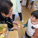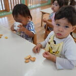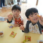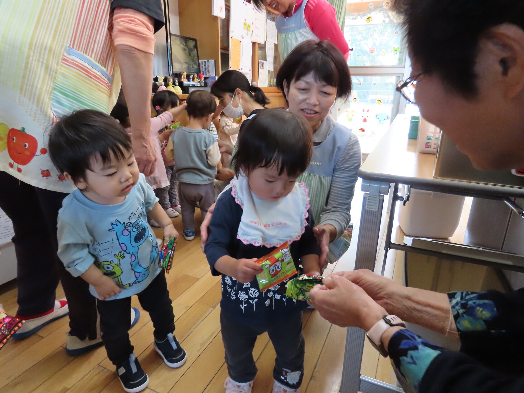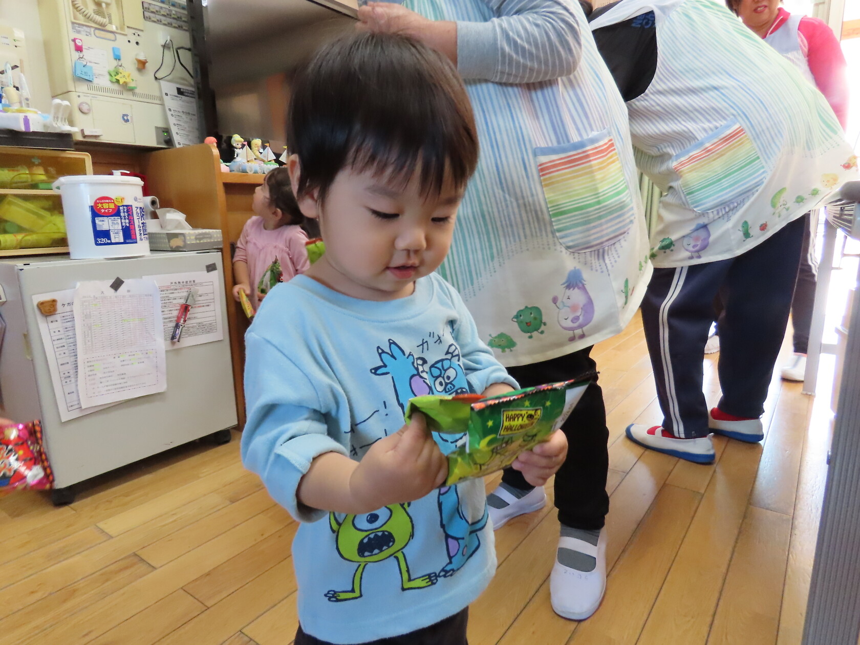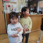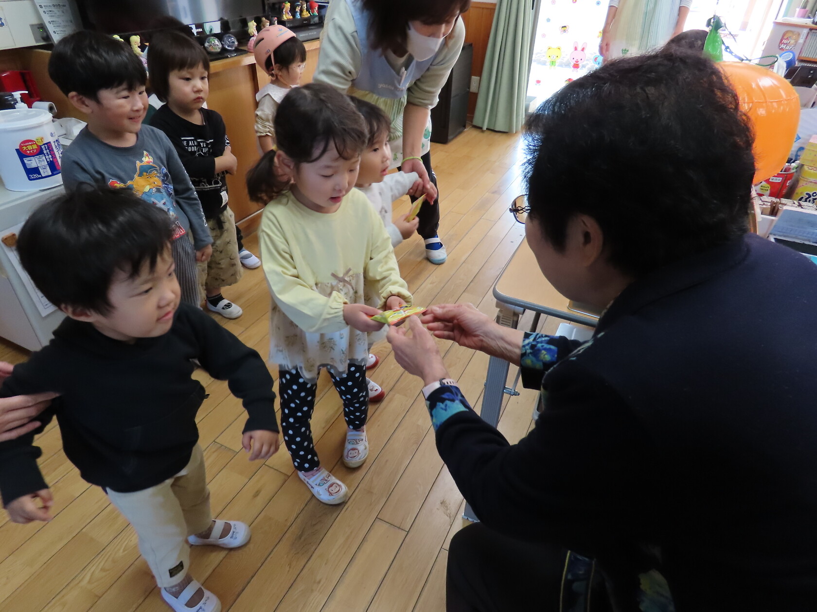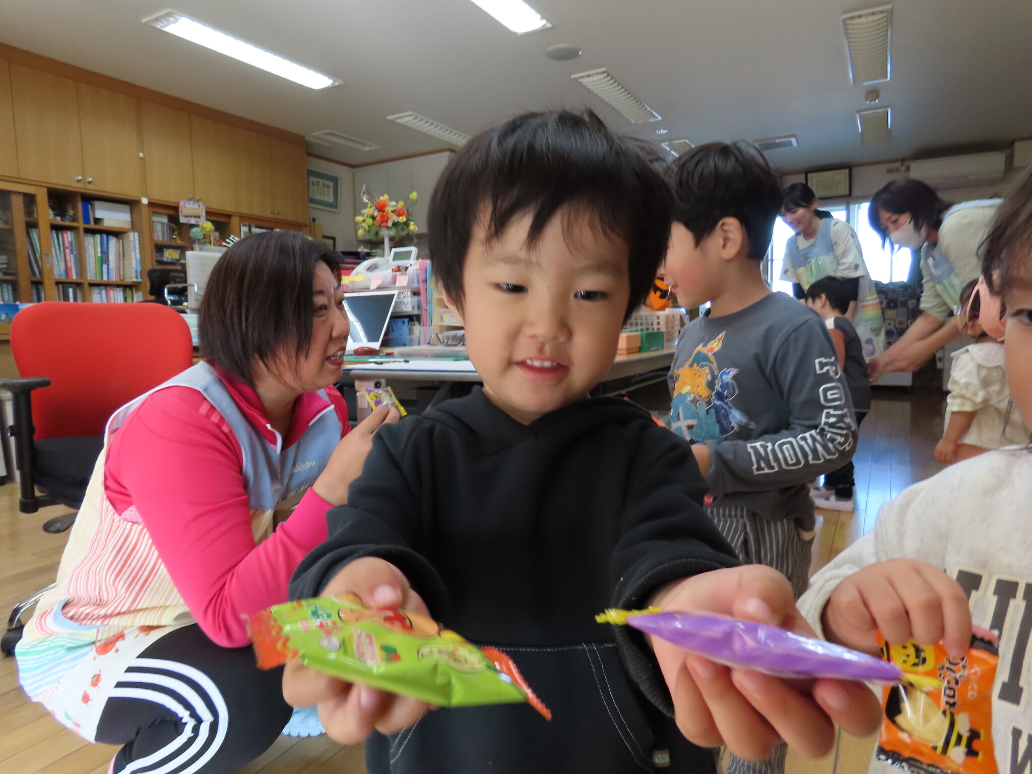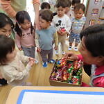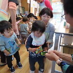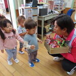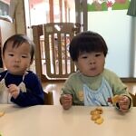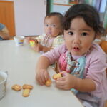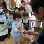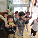 ハロウィン(未満児) 公開済み: 2023年10月31日更新: 2023年10月31日 今日はハロウィンだったので事務所にお菓子をもらいにいきました😁 先生達からお菓子をもらって嬉しそうでした!! 午前中のおやつで美味しく食べました!!