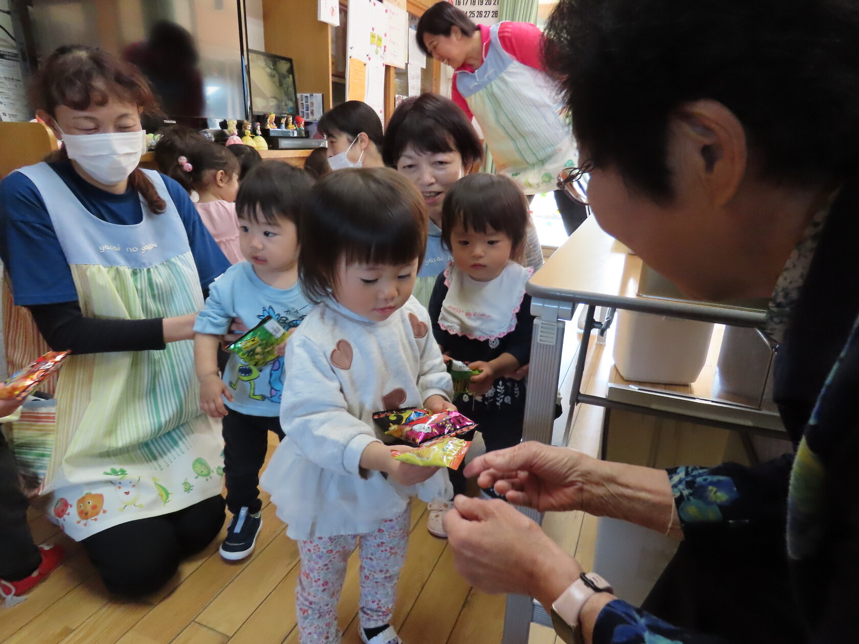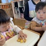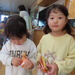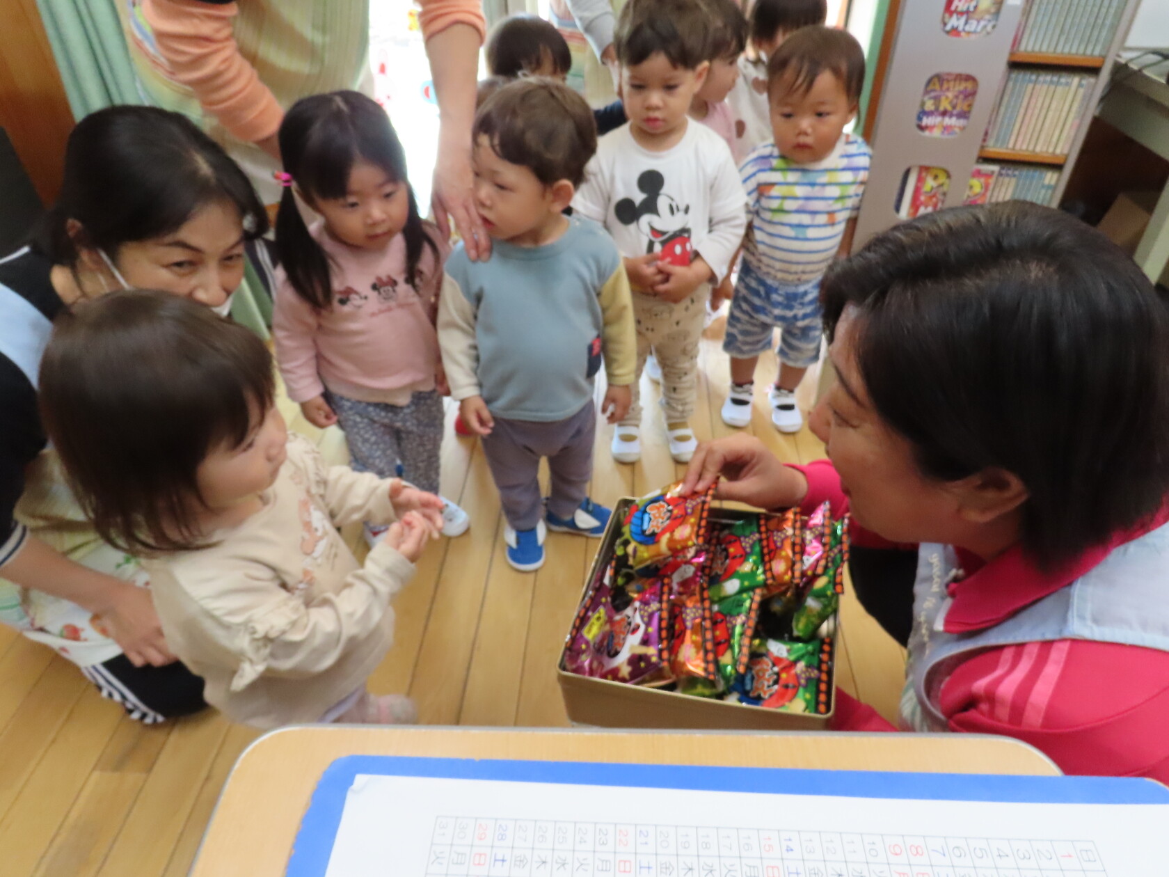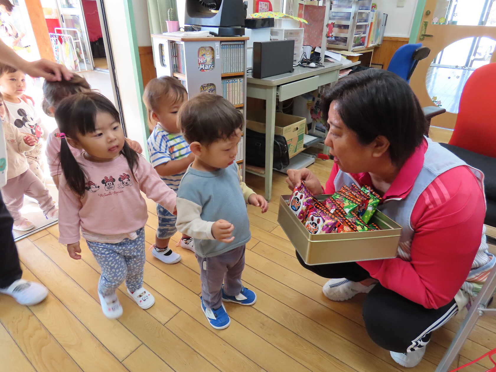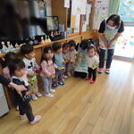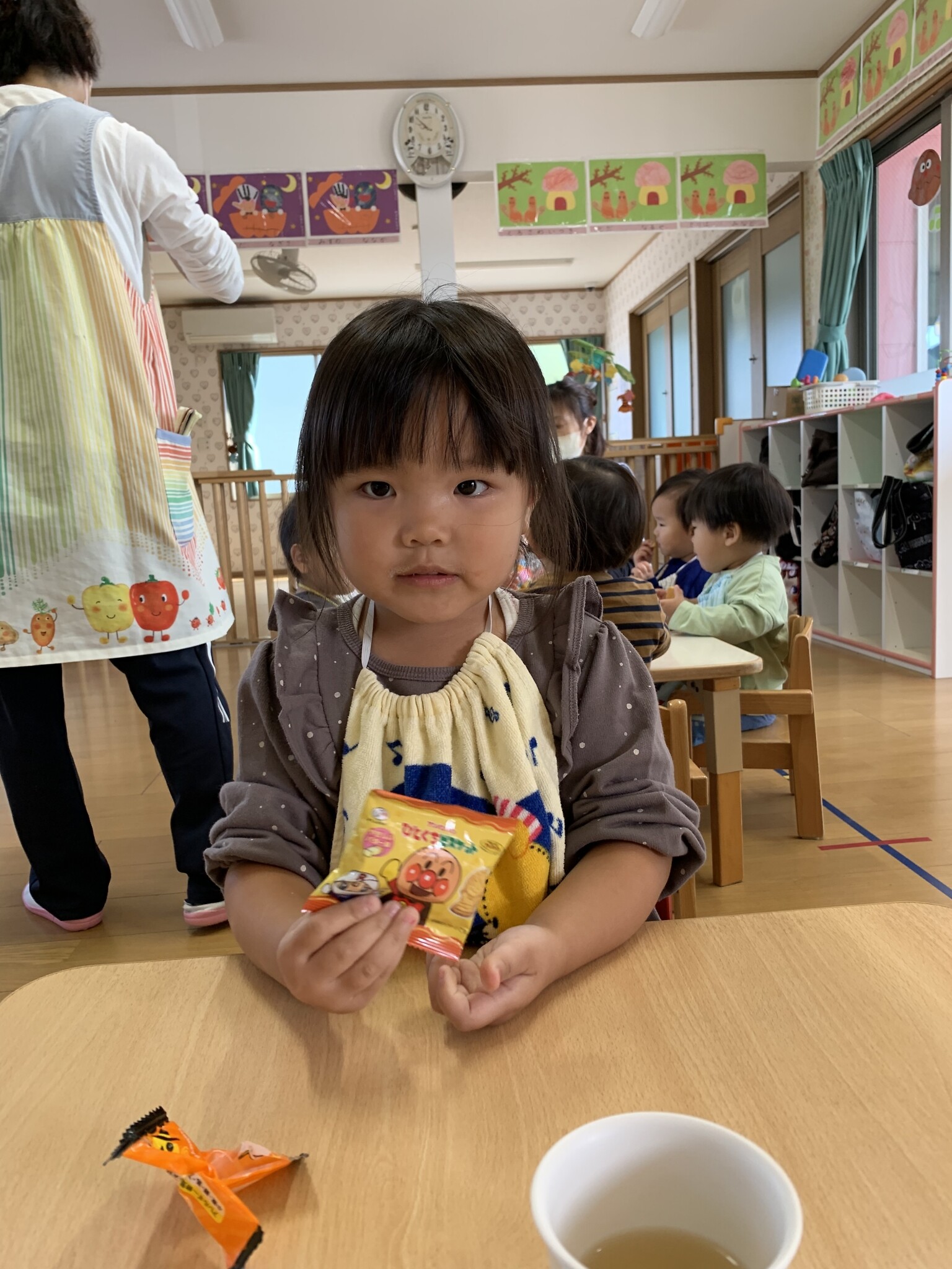 ハロウィン(未満児) 公開済み: 2023年10月31日更新: 2023年10月31日 今日はハロウィンだったので事務所にお菓子をもらいにいきました😁 先生達からお菓子をもらって嬉しそうでした!! 午前中のおやつで美味しく食べました!!