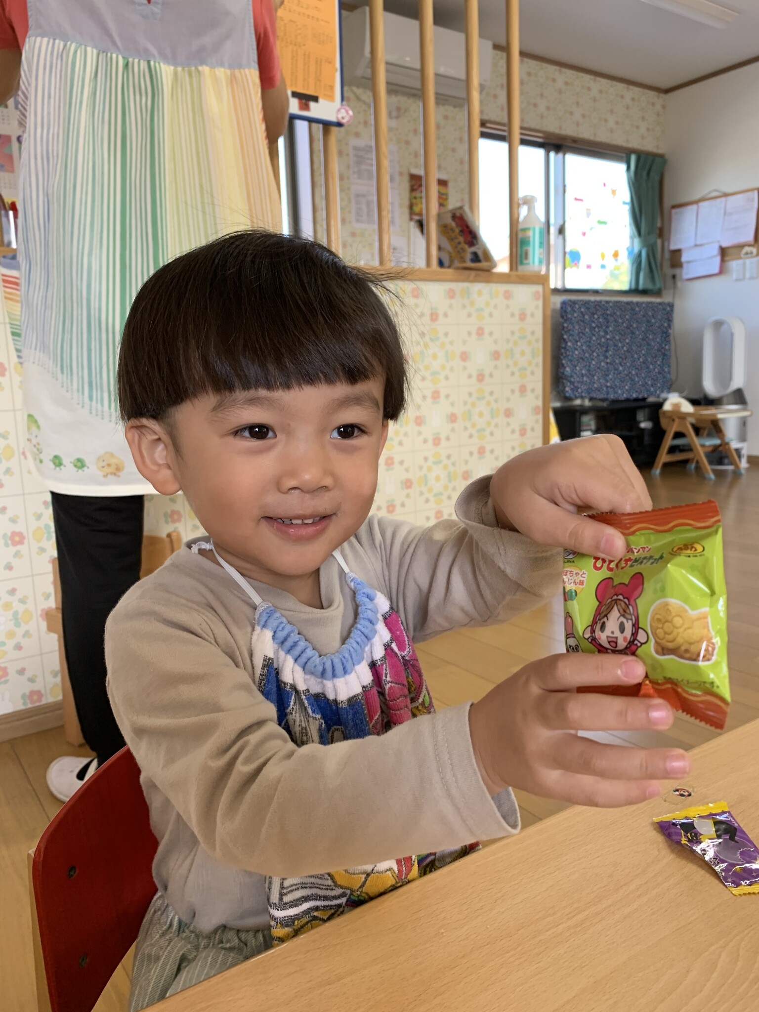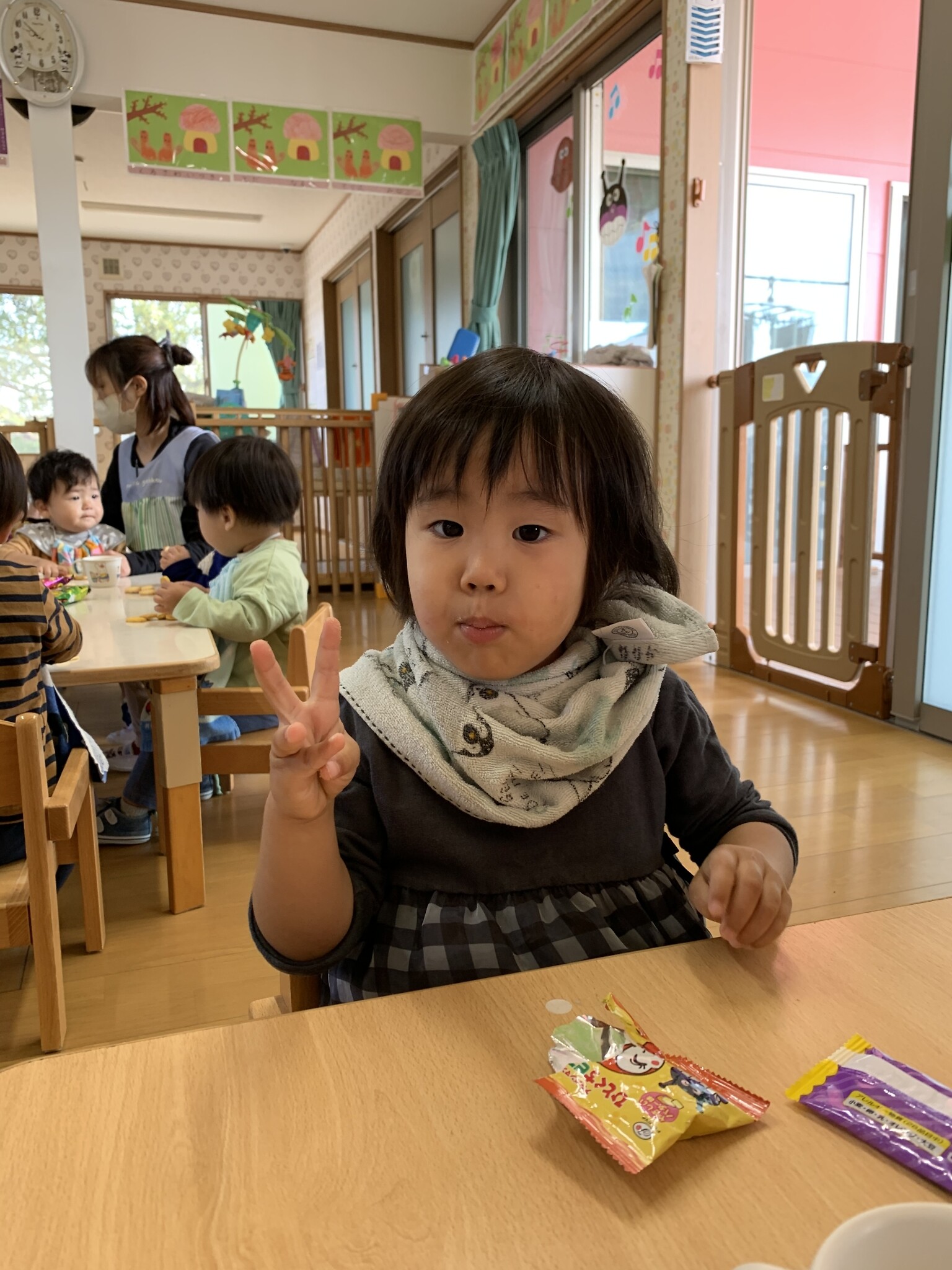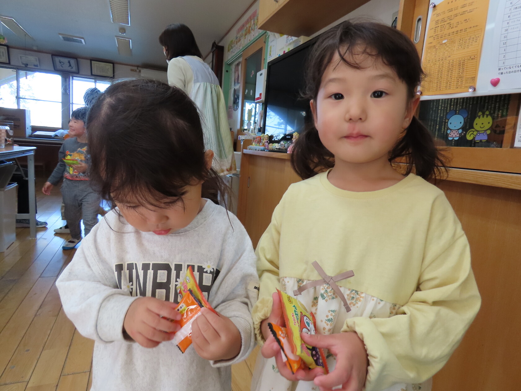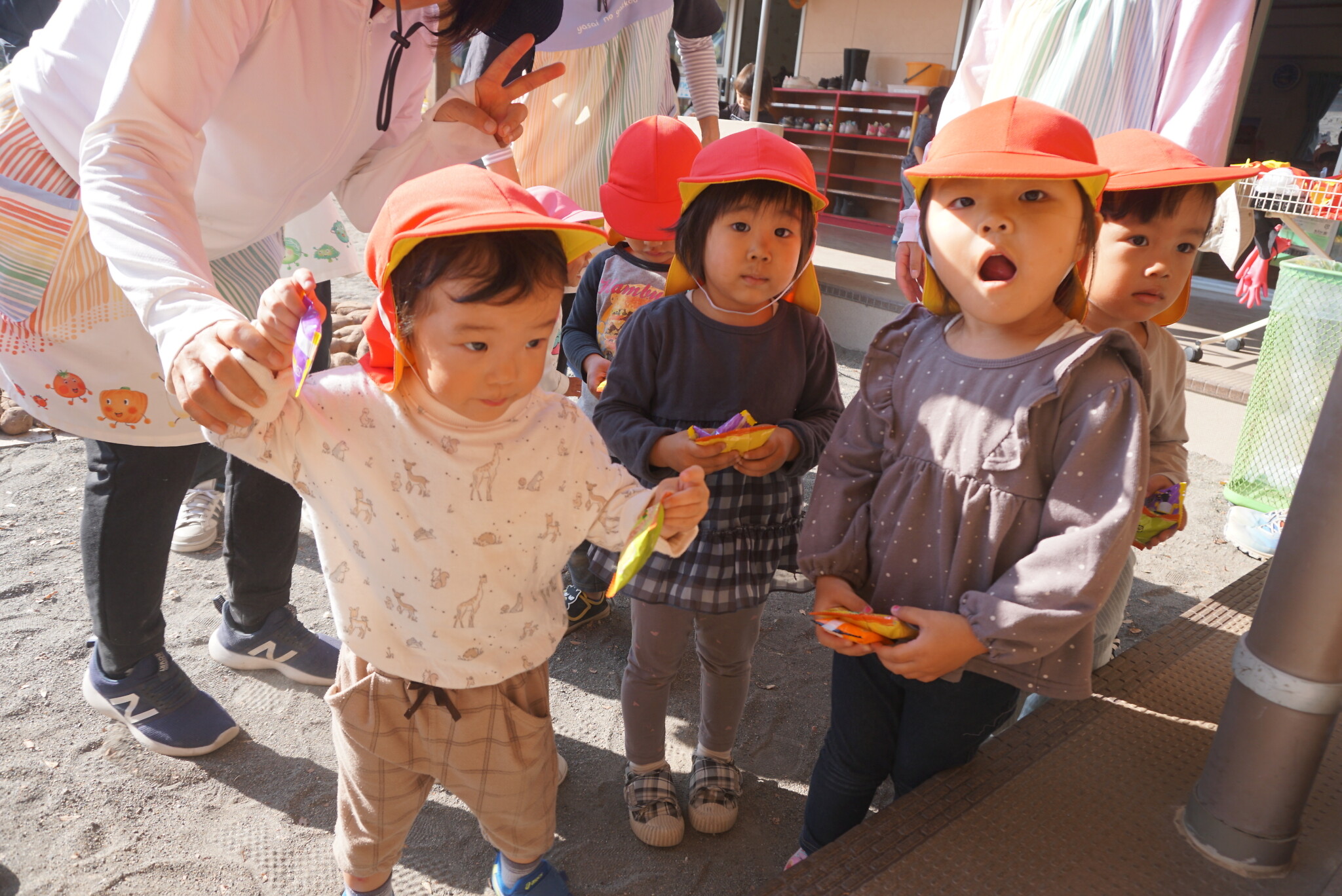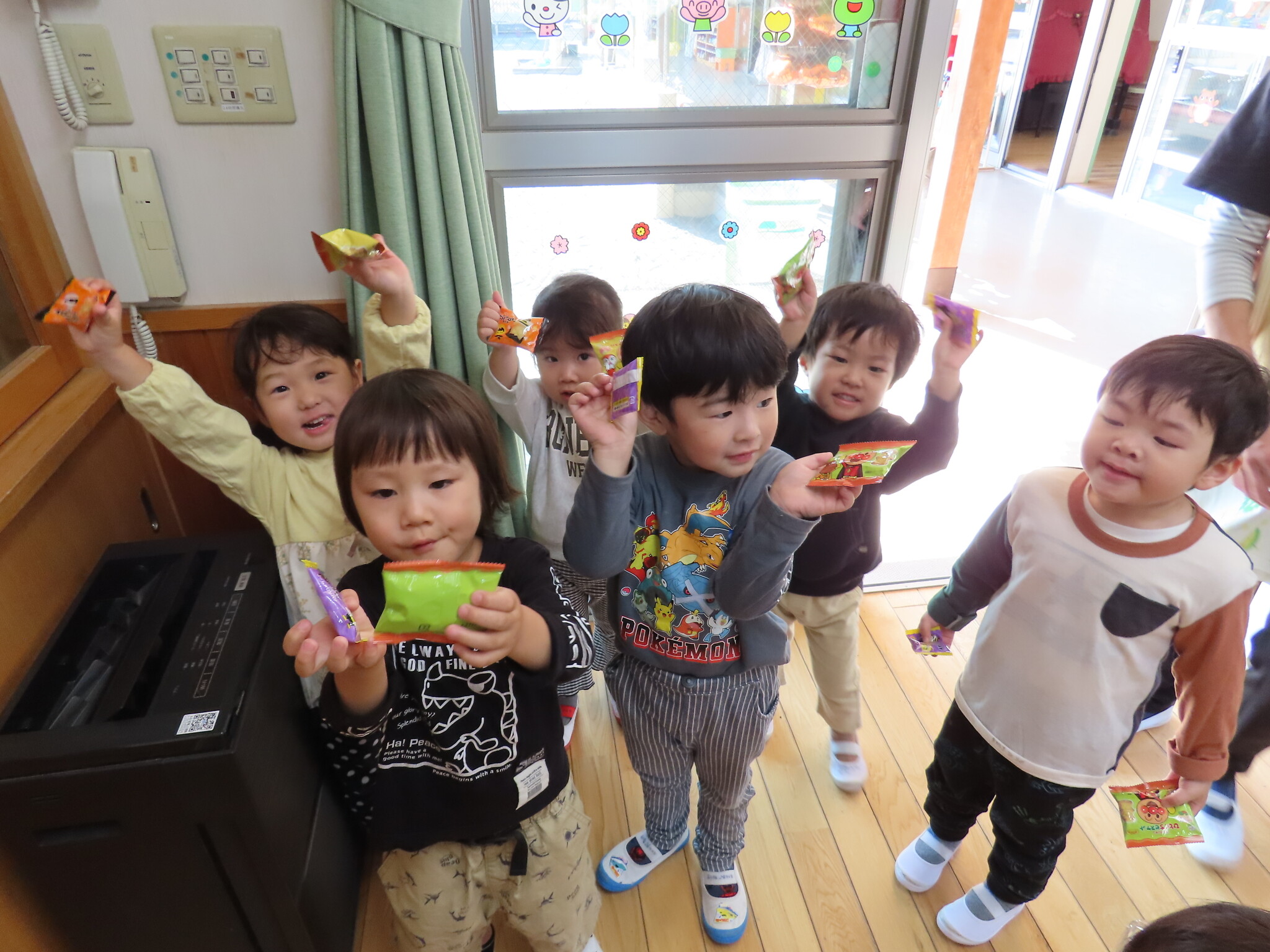 ハロウィン(未満児) 公開済み: 2023年10月31日更新: 2023年10月31日 今日はハロウィンだったので事務所にお菓子をもらいにいきました😁 先生達からお菓子をもらって嬉しそうでした!! 午前中のおやつで美味しく食べました!!