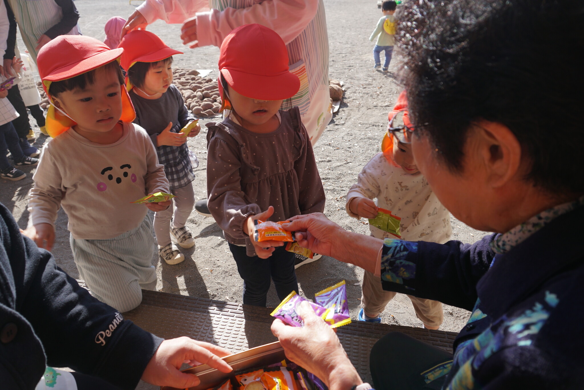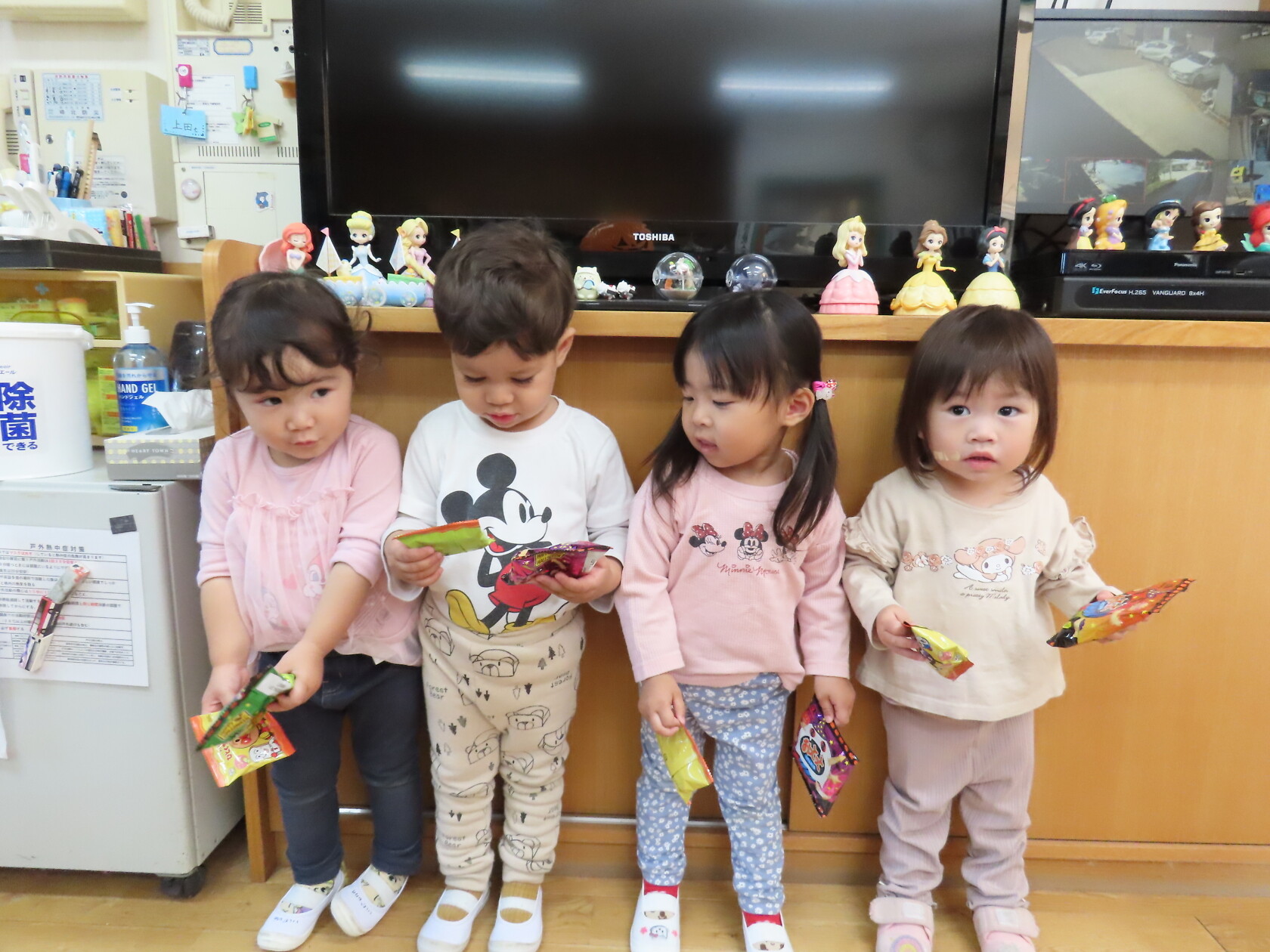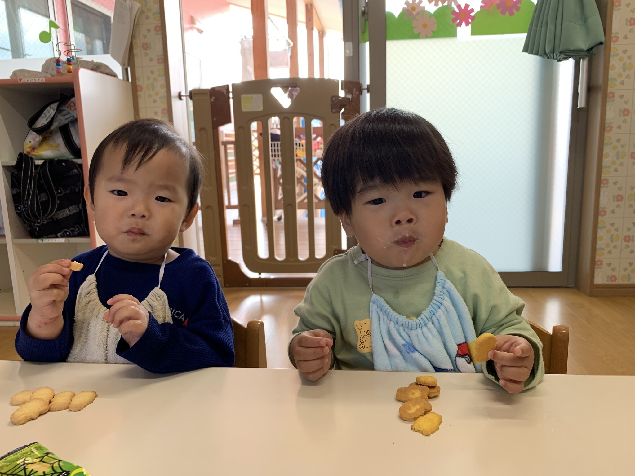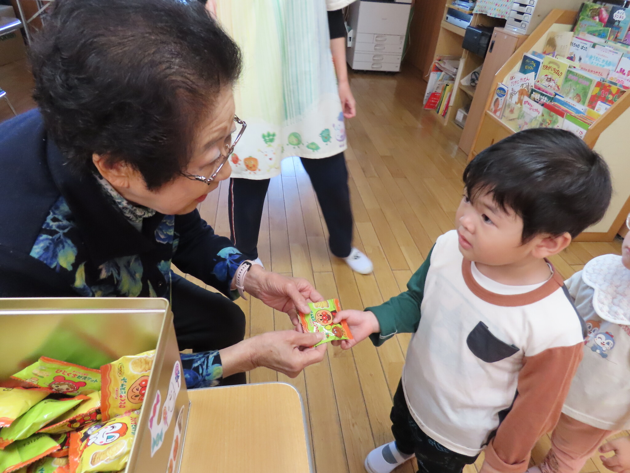 ハロウィン(未満児) 公開済み: 2023年10月31日更新: 2023年10月31日 今日はハロウィンだったので事務所にお菓子をもらいにいきました😁 先生達からお菓子をもらって嬉しそうでした!! 午前中のおやつで美味しく食べました!!