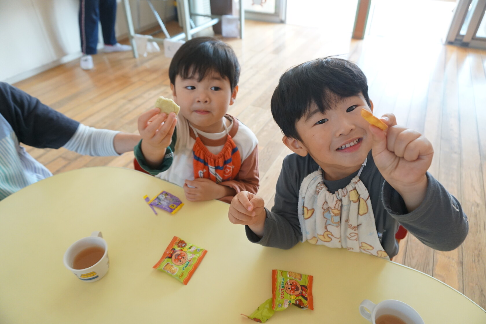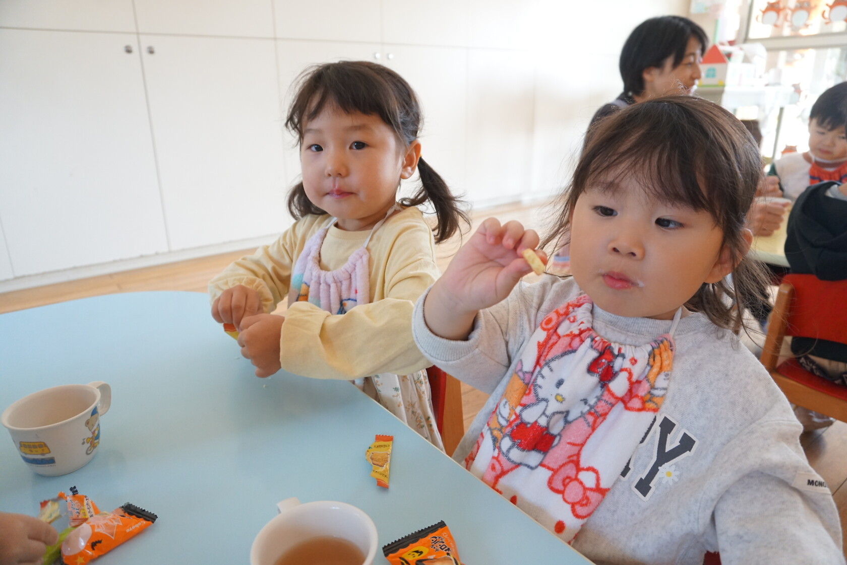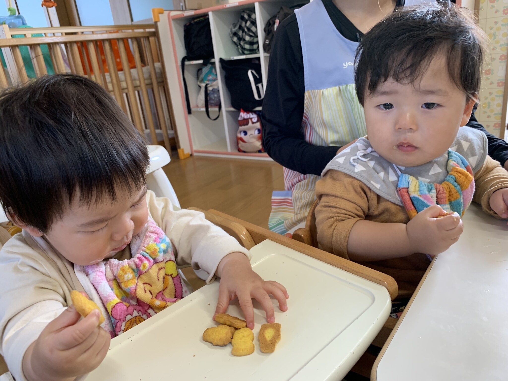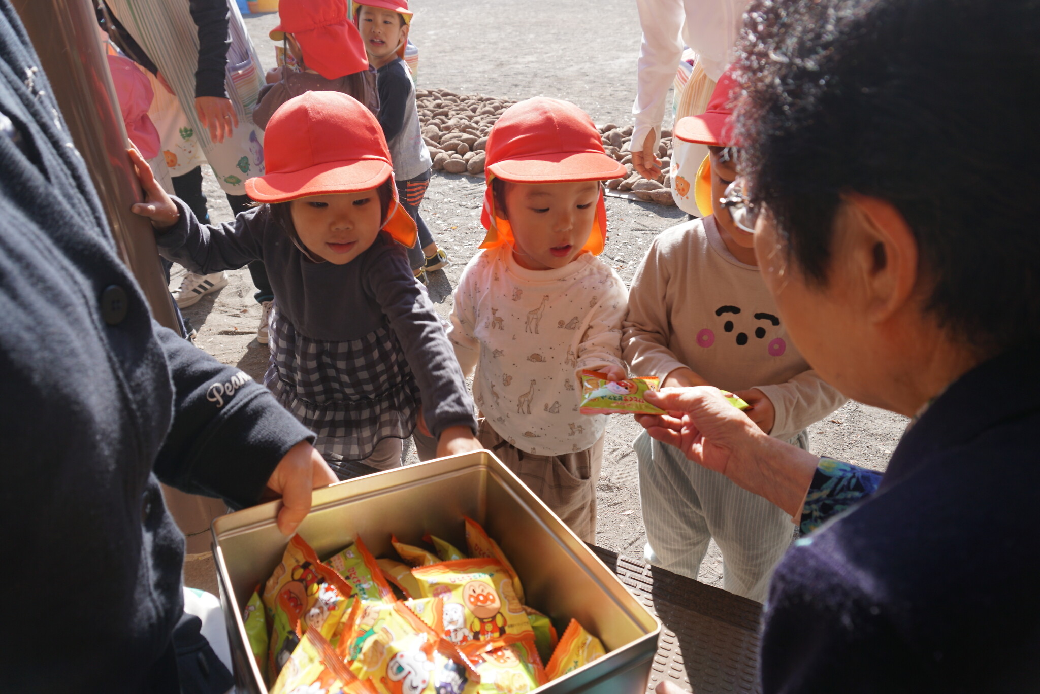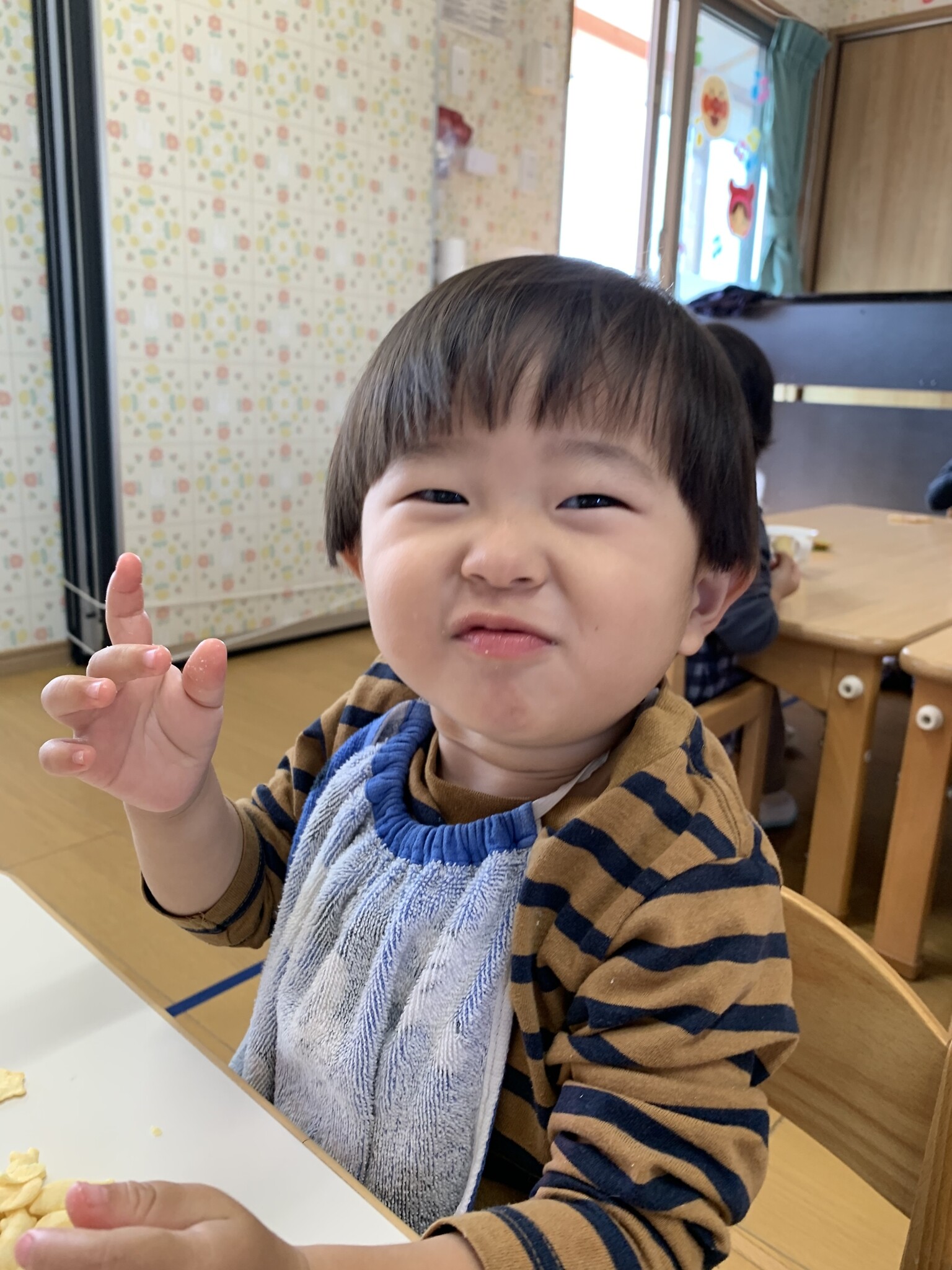 ハロウィン(未満児) 公開済み: 2023年10月31日更新: 2023年10月31日 今日はハロウィンだったので事務所にお菓子をもらいにいきました😁 先生達からお菓子をもらって嬉しそうでした!! 午前中のおやつで美味しく食べました!!