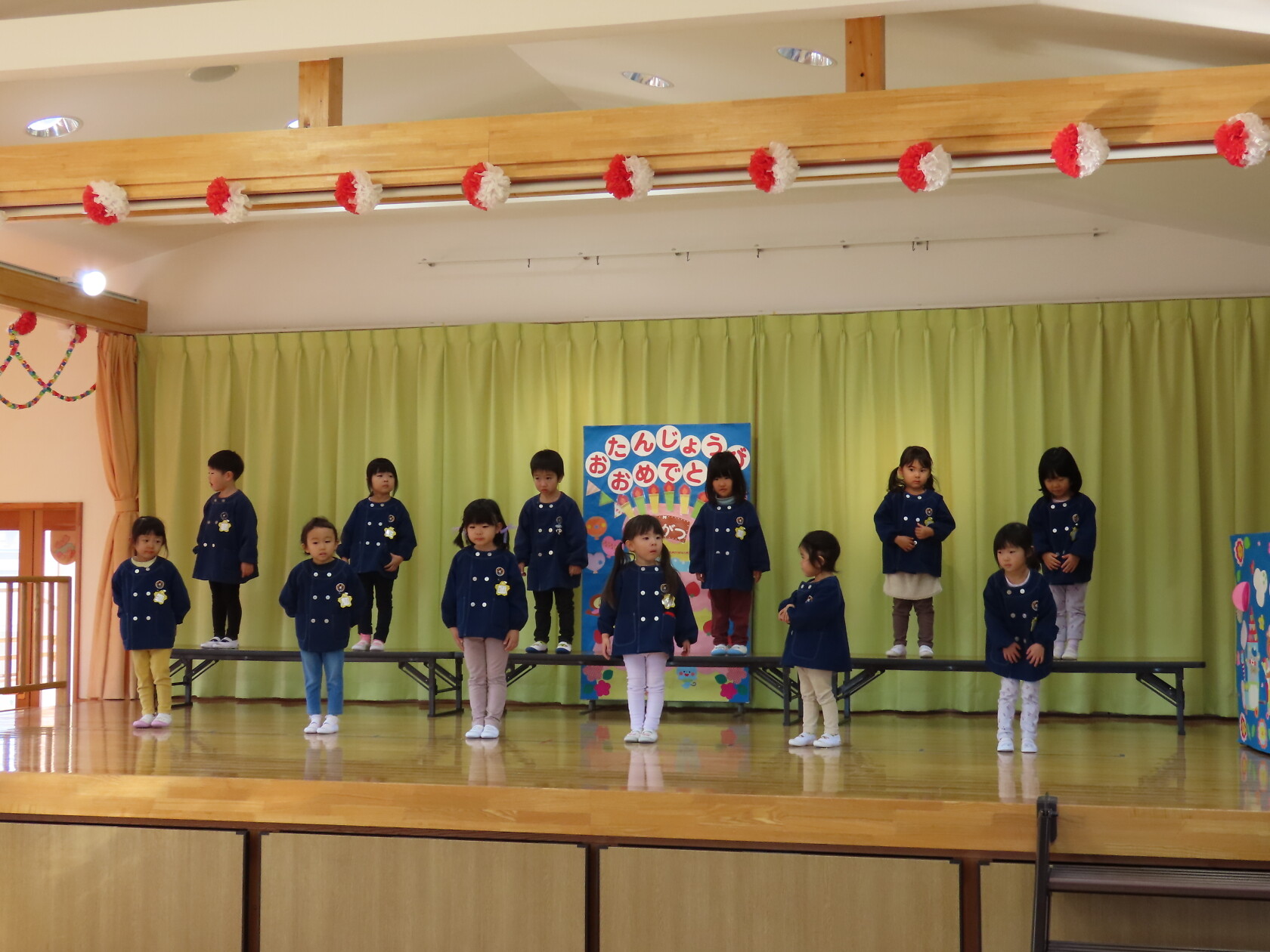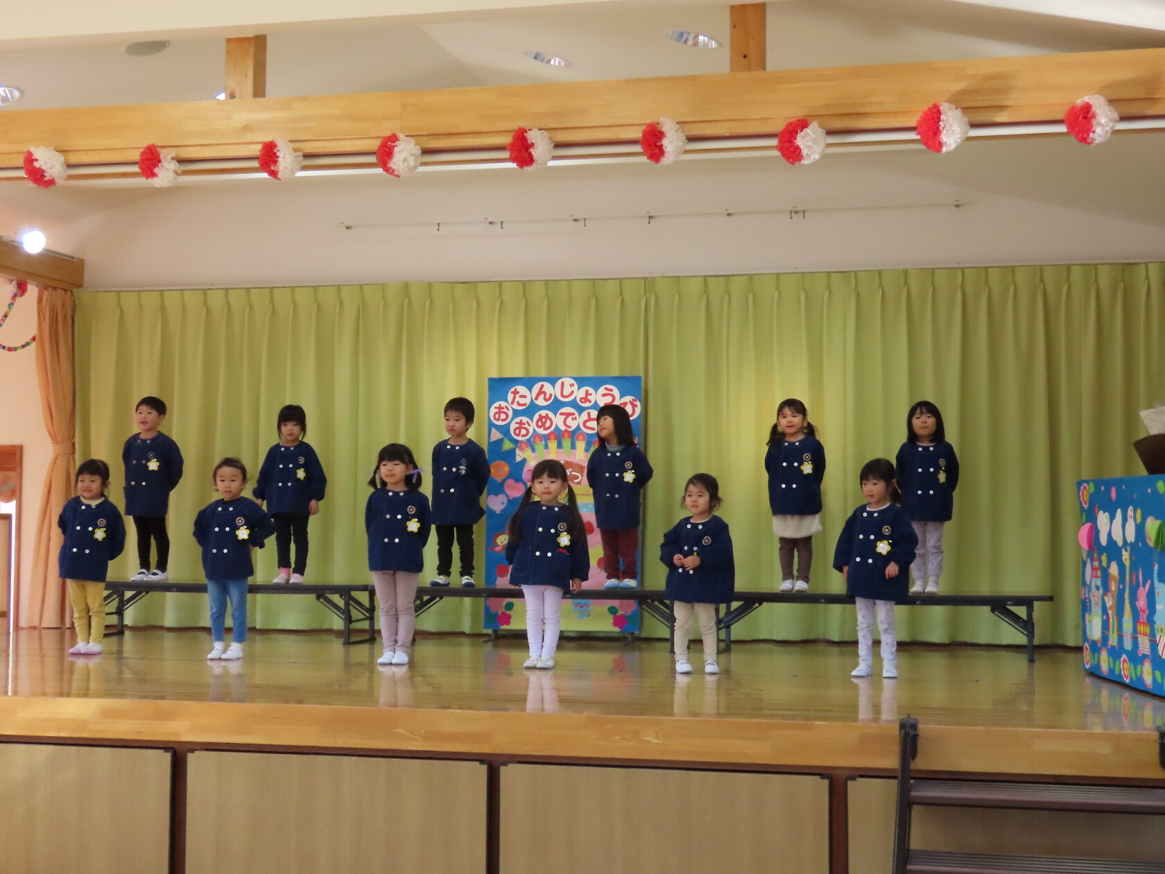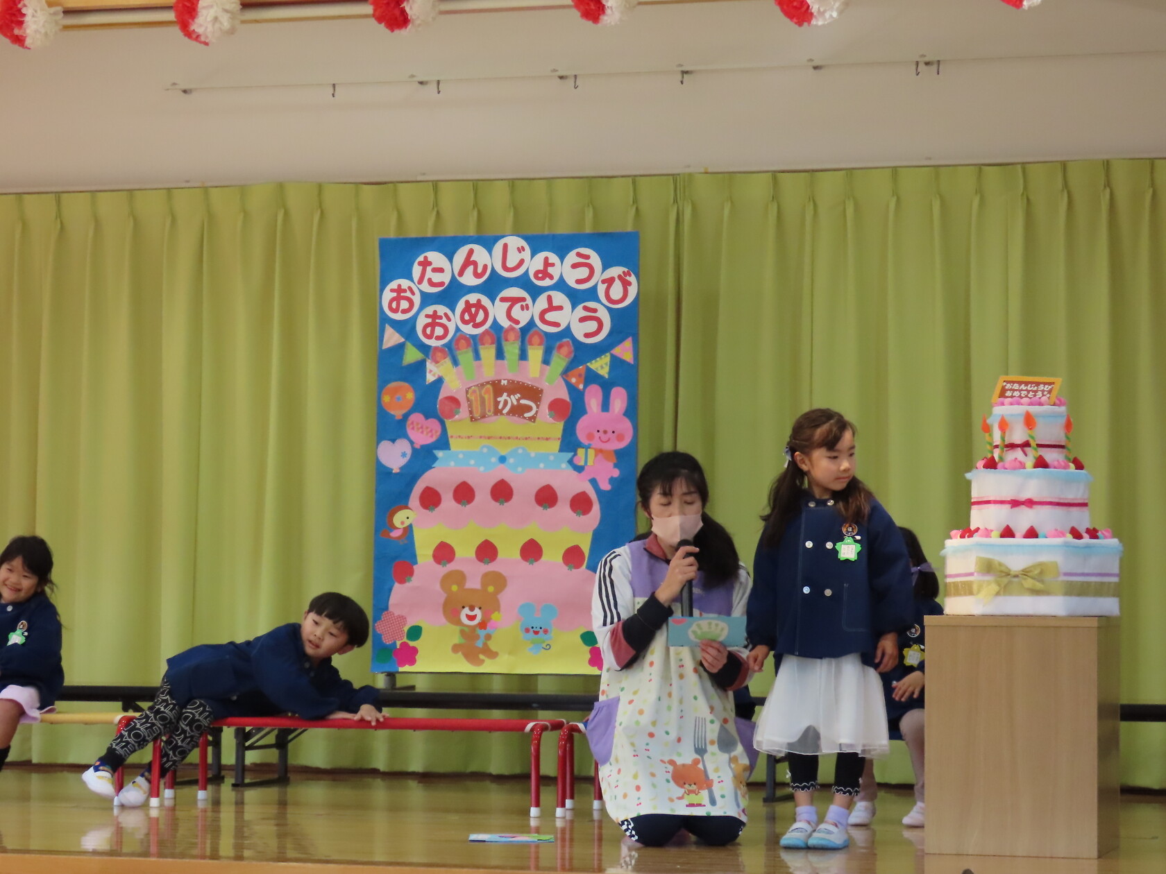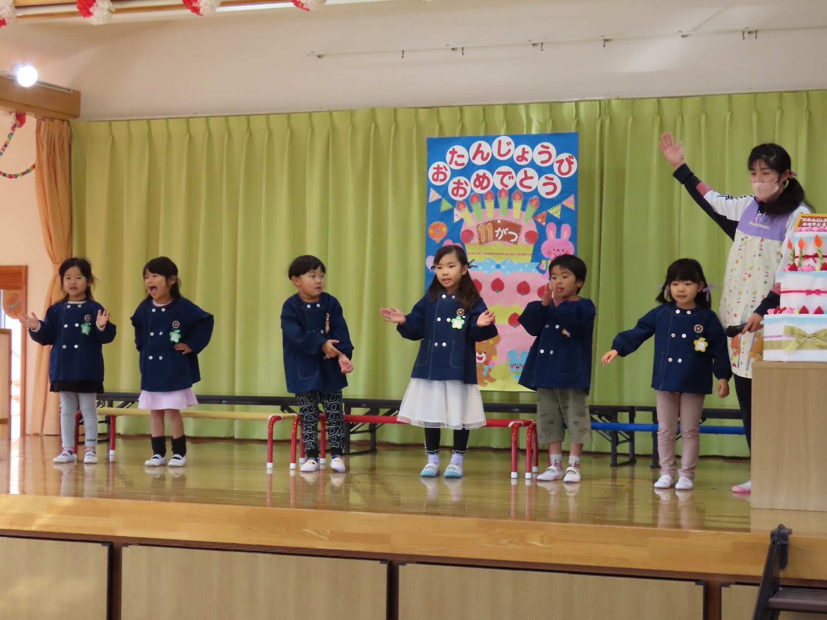 お誕生会(以上児) 公開済み: 2023年11月22日更新: 2023年11月22日 今日は11月うまれのお誕生会でした。 今月は6名のお誕生のお友だちでした。 ステージに上がり、上手にお誕生カードの発表が出来ました😊。 お歌のプレゼントは すみれ組 「秋の空」「すうじの歌」 ゆり組 「ホ!ホ!ホ!」「もみじ」 ひまわり組「ハローマイフレンズ」「はたけのポルカ」でした。 11月うまれのお友だち、お誕生日おめでとうございます✨。