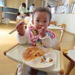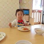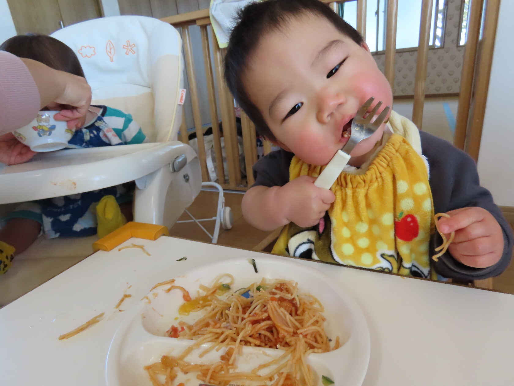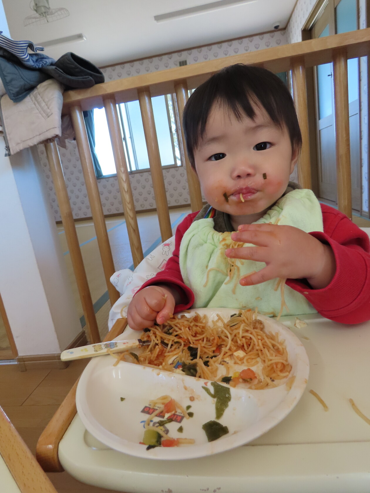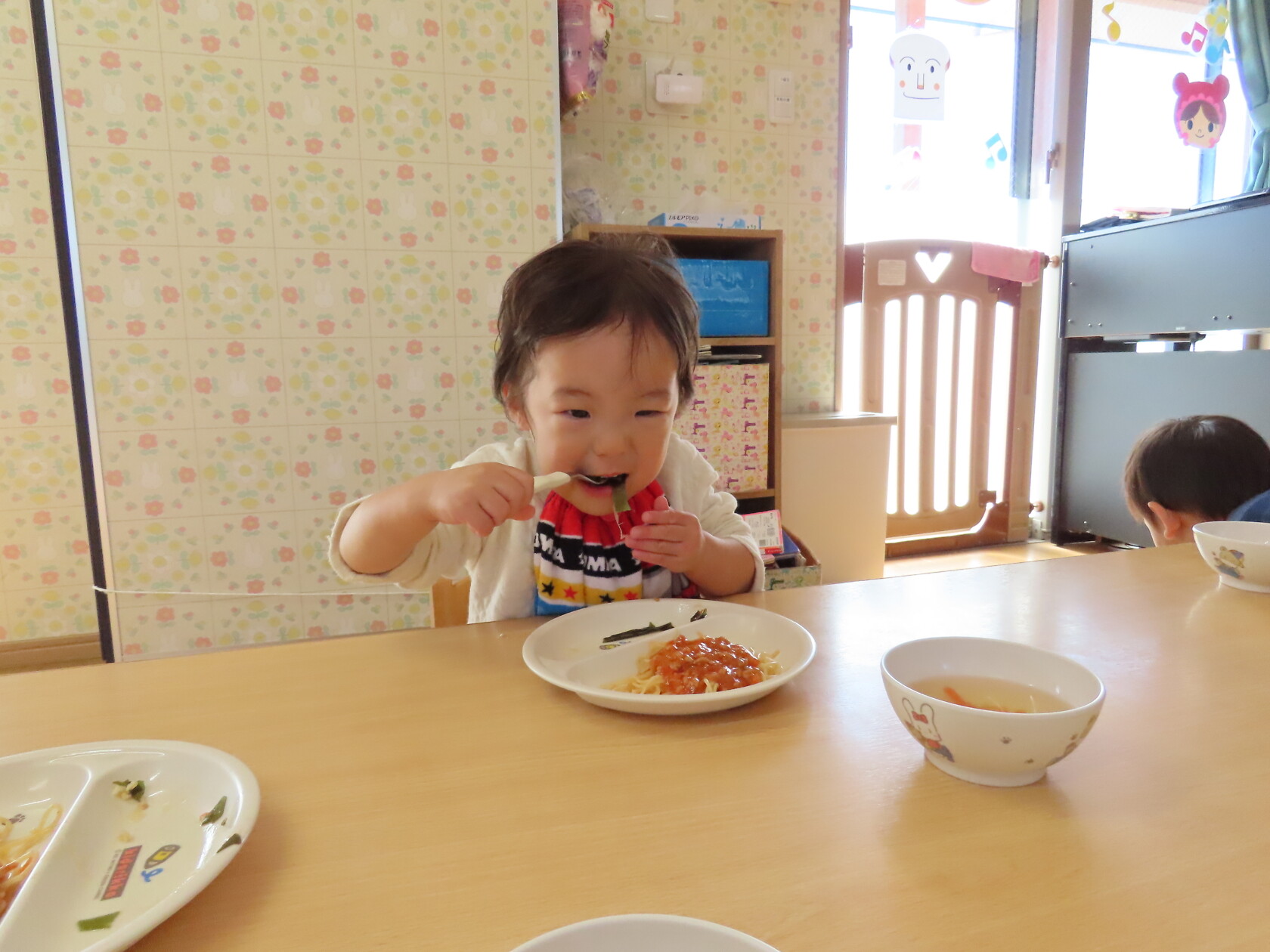 お皿やフォークを持って、口まで運び、口の周りや、ナプキンを汚しながらもくもくおいしくたべていました😋