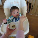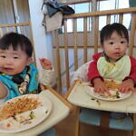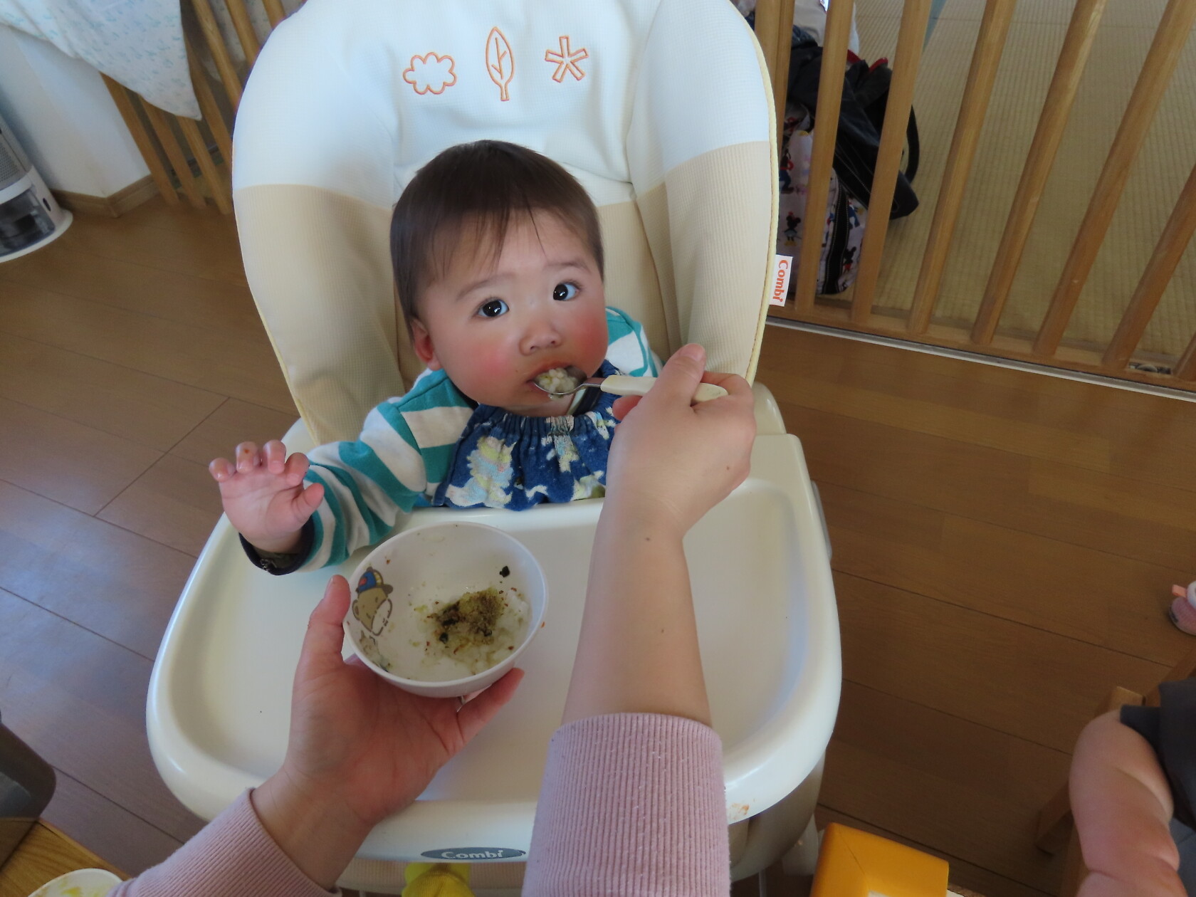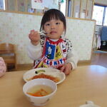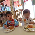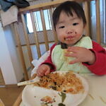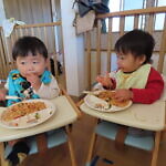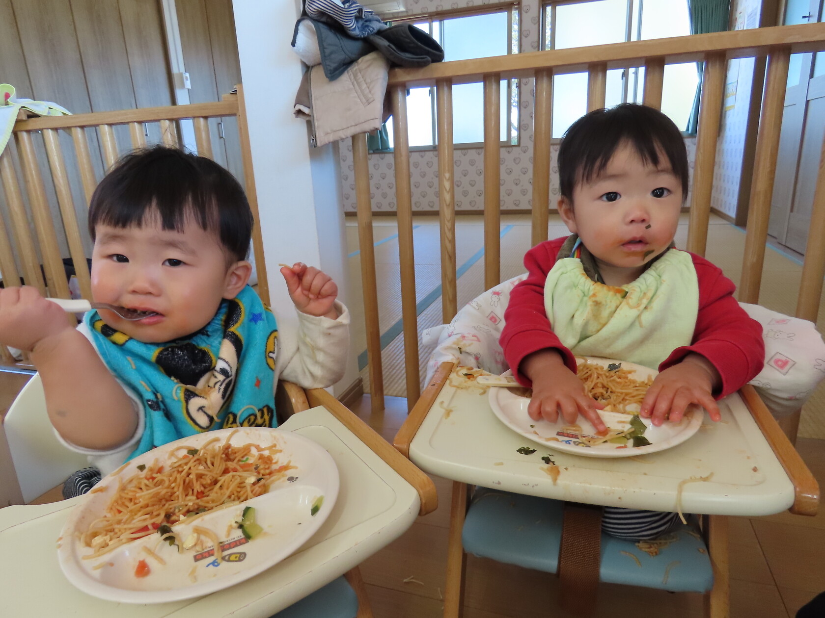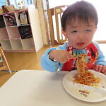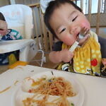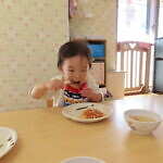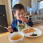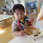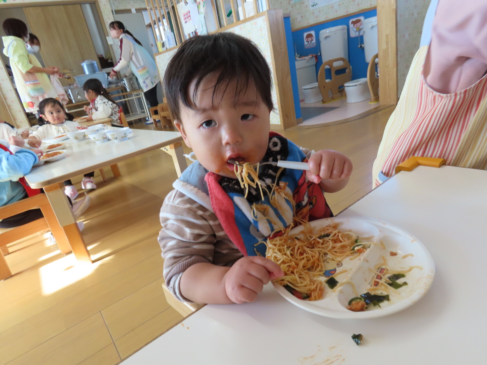お皿やフォークを持って、口まで運び、口の周りや、ナプキンを汚しながらもくもくおいしくたべていました😋