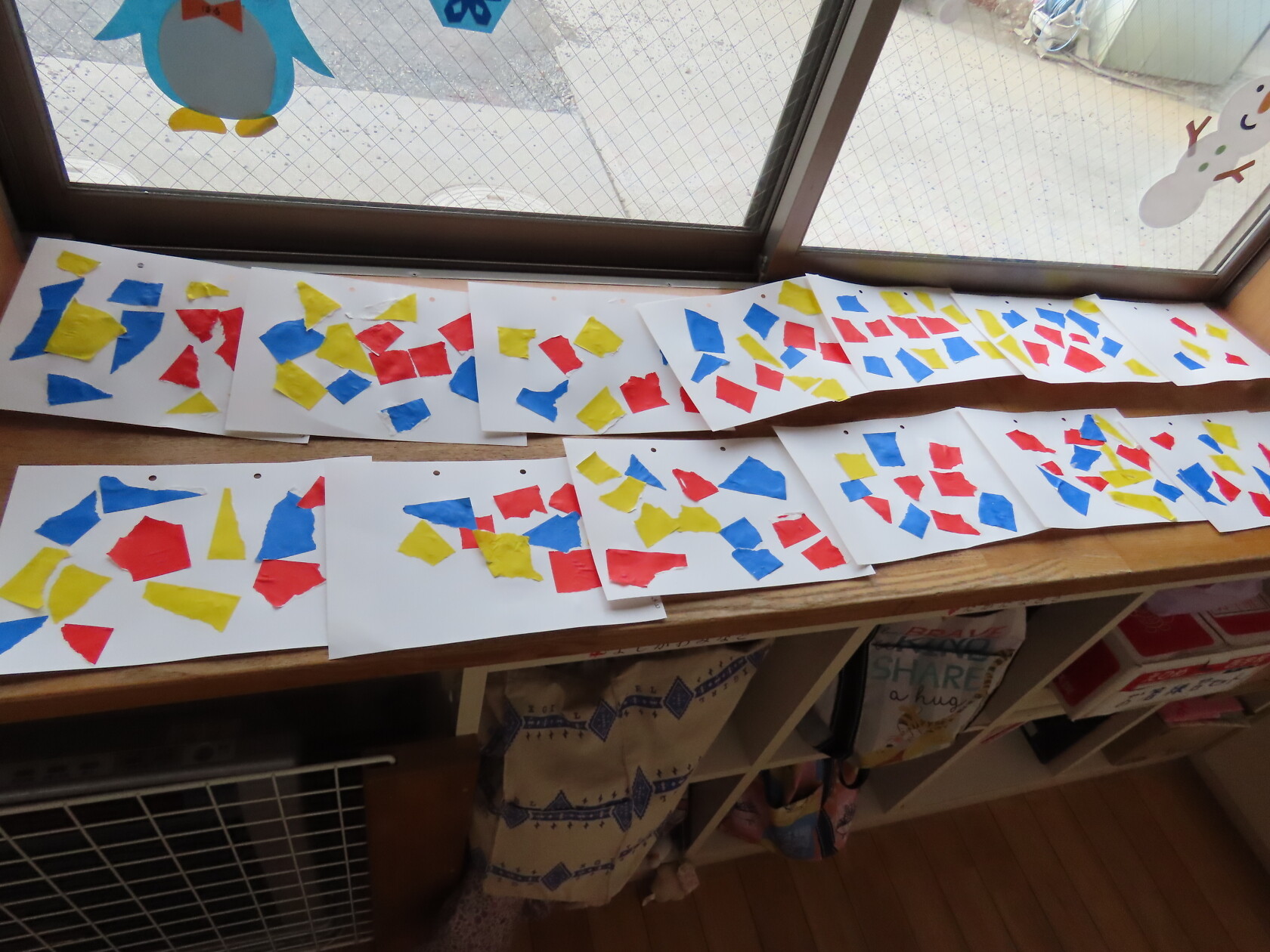 折り紙を4つにちぎり、のりを人差し指につけて、まわりに塗りました。