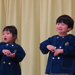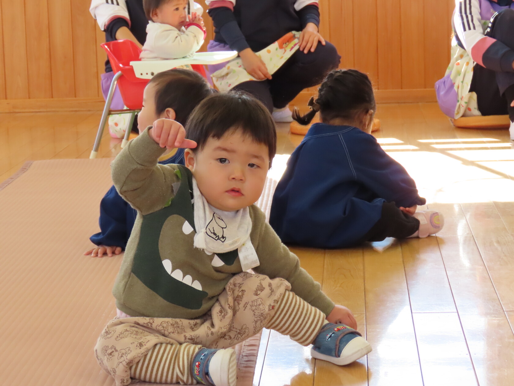 2歳児のお友達は自分の名前を言うことができ、1歳児のお友達は手をあげてお返事をすることができました✋