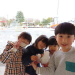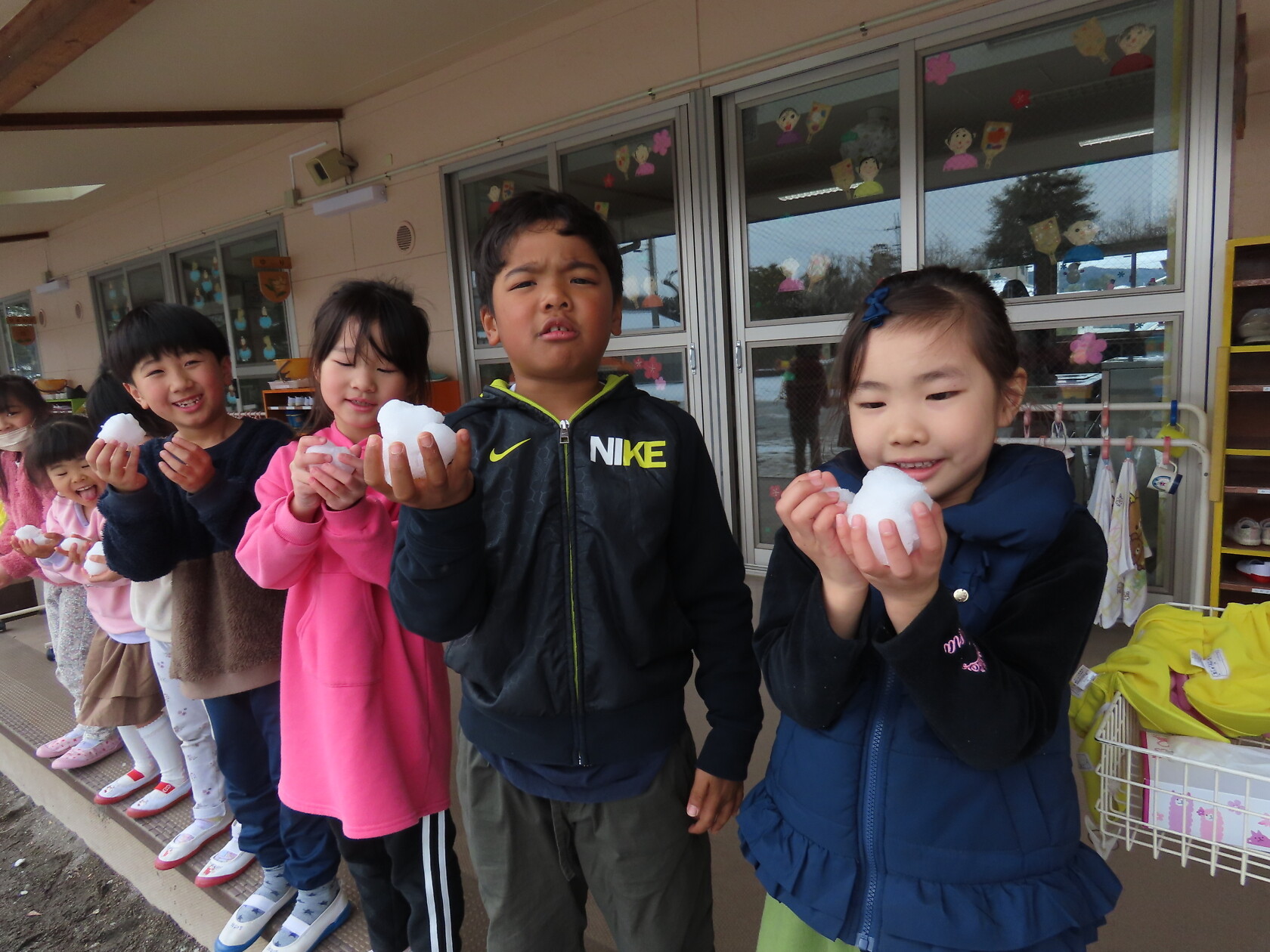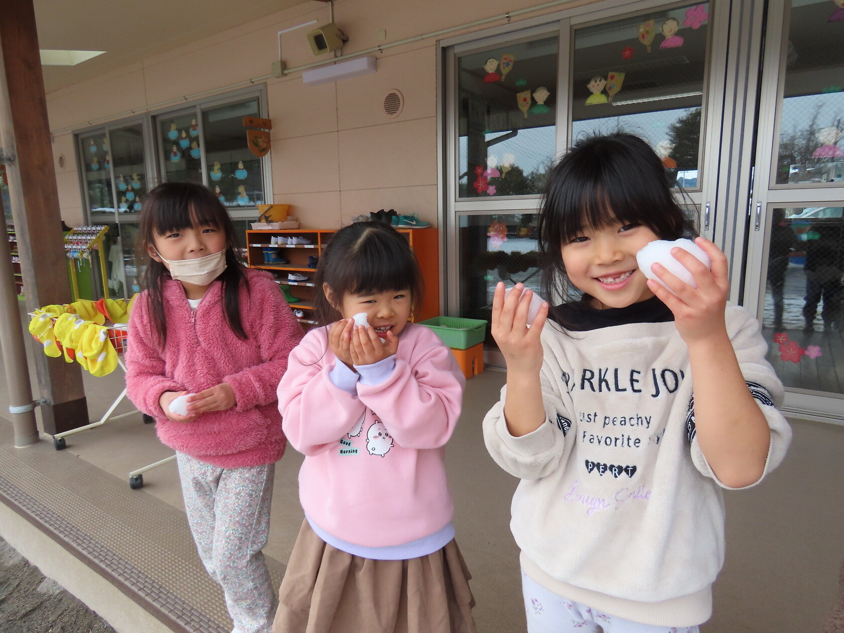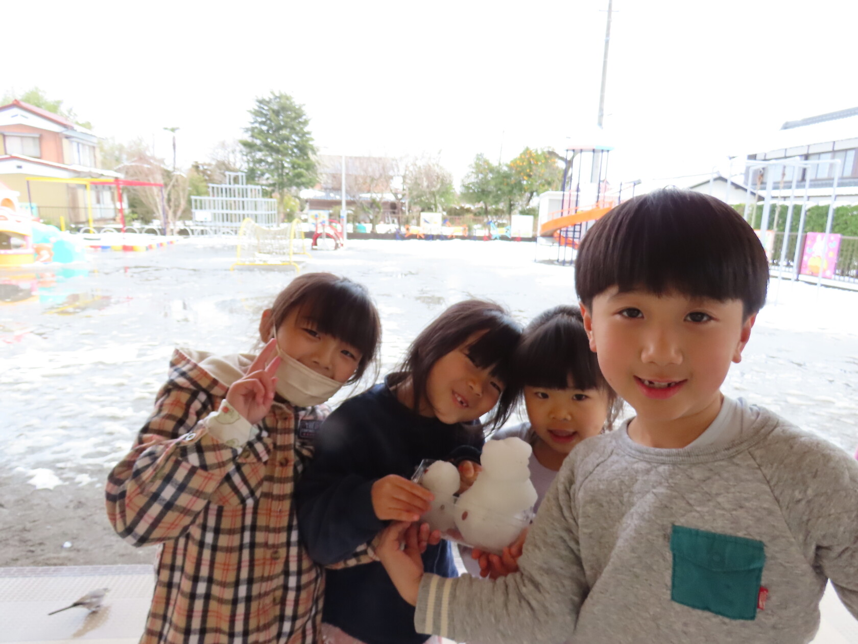 昨日から降り続いた雪で今朝は、園庭が一面雪景色となり、、、。少し雪をさわったり、小さな雪だるま⛄も作りました😆。