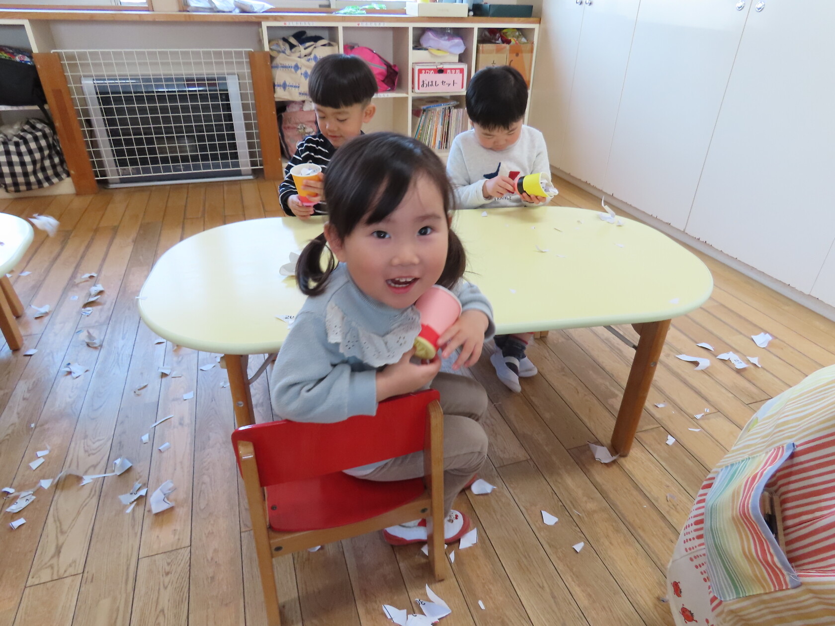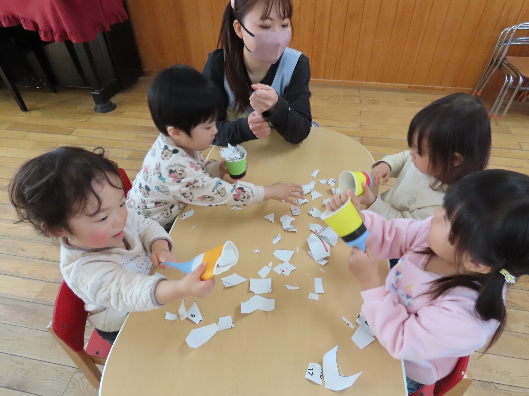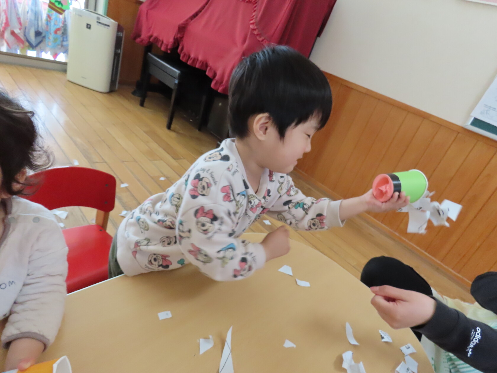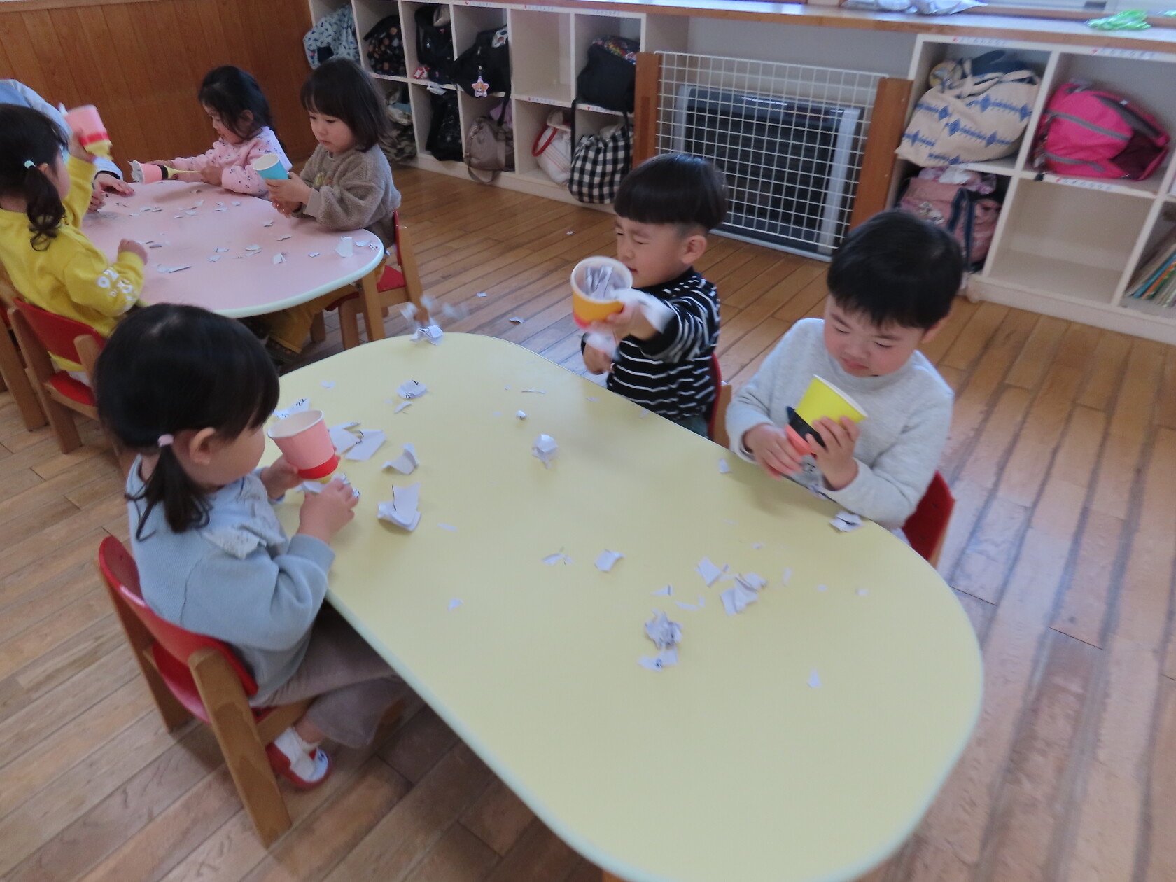 今日のできごと(ちゅうりっぷ) 公開済み: 2024年2月20日更新: 2024年2月20日 毎日、はさみの練習に励んでいるちゅうりっぷぐみ🌷 今日は山型に挑戦し、紙を動かして切る練習をしました。 練習を重ね、はさみの開閉が出来るようになり、線の上を切ることが楽しいようです😁 同時に、危険のないように気をつけながら、お約束を守って行っています⚠ 今日は練習の最後に、使った紙を細かく切って、先生お手製のクラッカーに入れて「パーン」と飛ばして遊びました💕 又、進級に向けてお便り帳や帽子の名前を見て、見つける練習を頑張っています👍 お家でも、色々なお話しを聞いてみて下さいね🎵