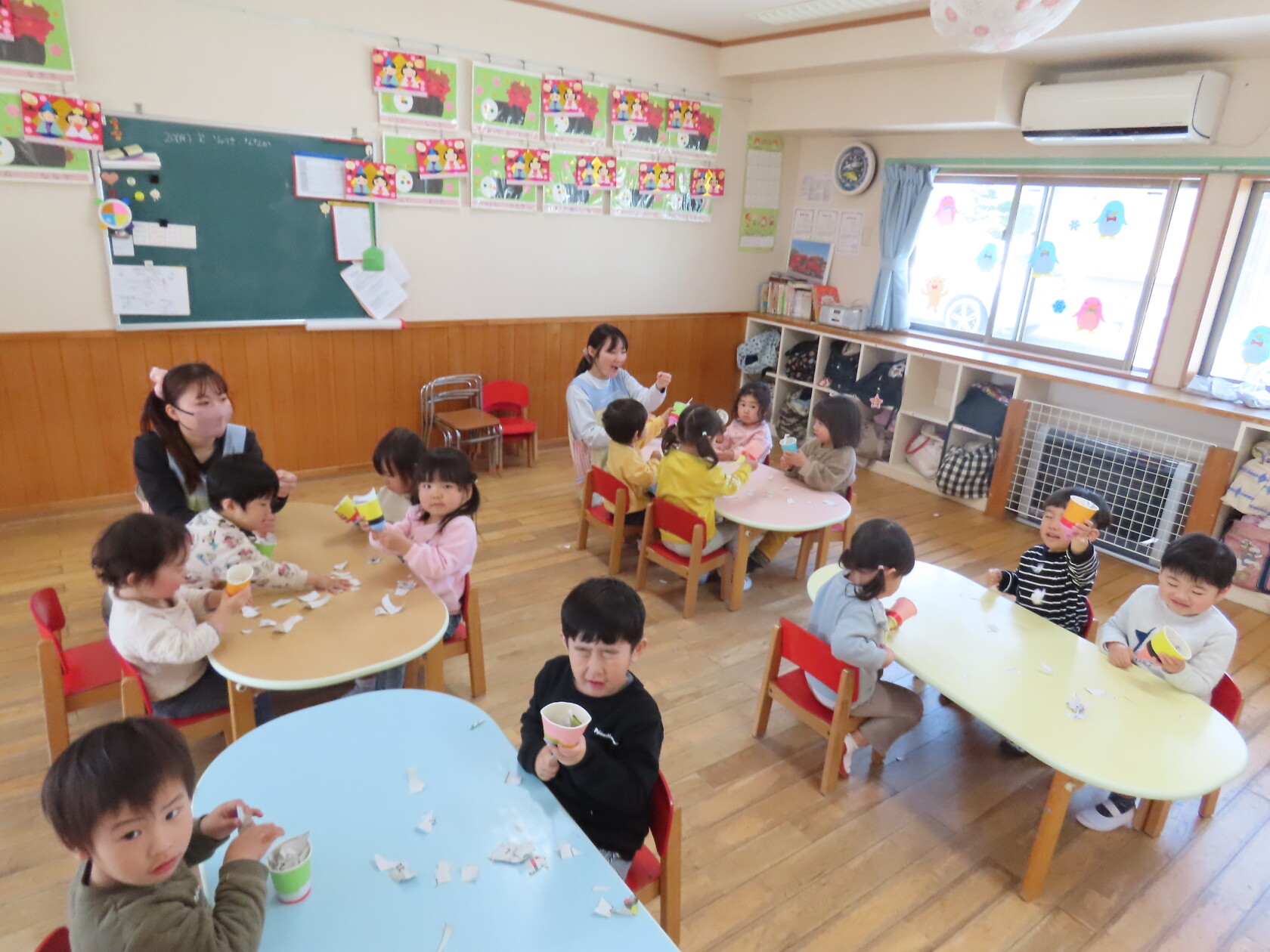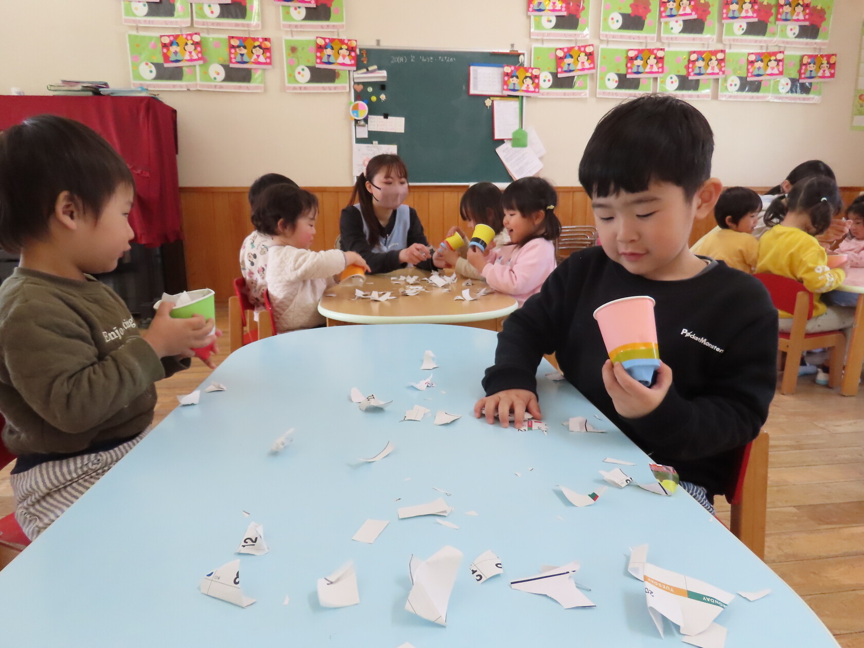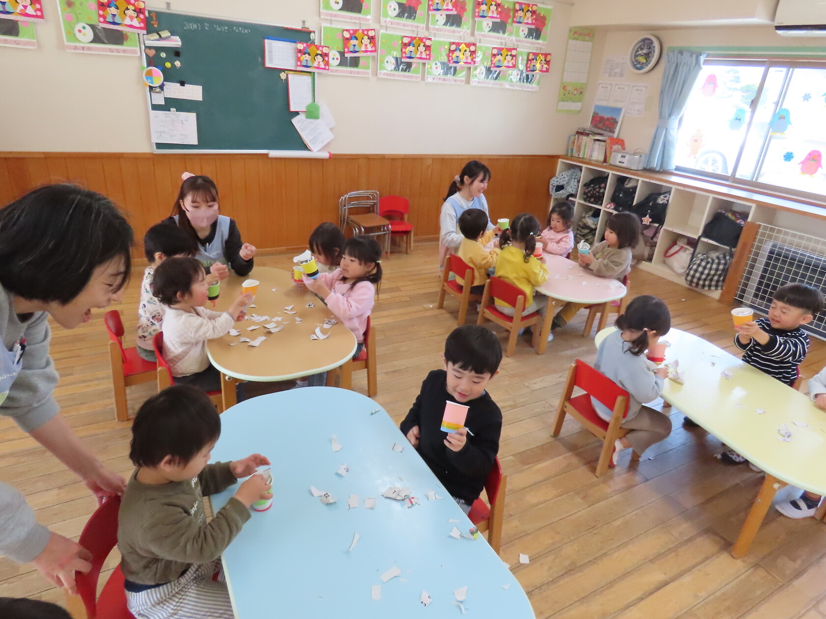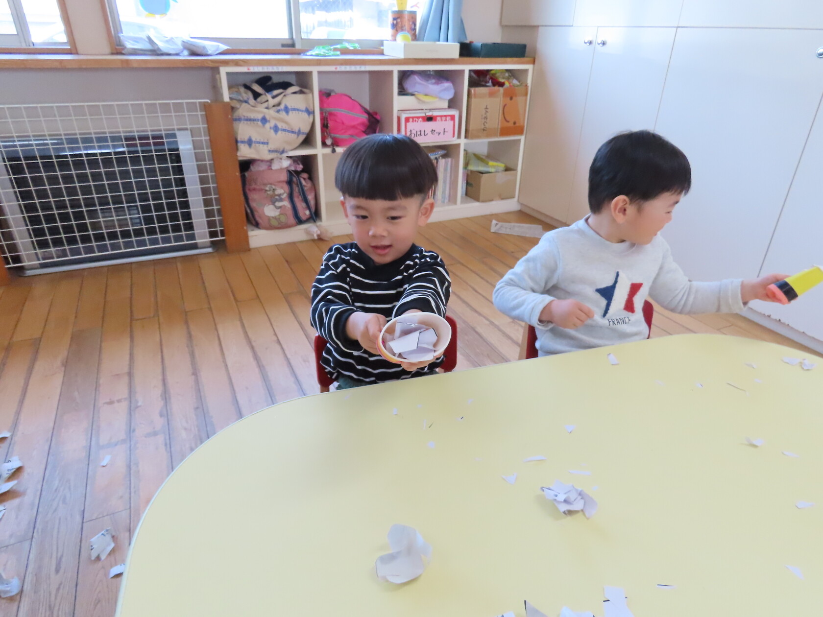 今日のできごと(ちゅうりっぷ) 公開済み: 2024年2月20日更新: 2024年2月20日 毎日、はさみの練習に励んでいるちゅうりっぷぐみ🌷 今日は山型に挑戦し、紙を動かして切る練習をしました。 練習を重ね、はさみの開閉が出来るようになり、線の上を切ることが楽しいようです😁 同時に、危険のないように気をつけながら、お約束を守って行っています⚠ 今日は練習の最後に、使った紙を細かく切って、先生お手製のクラッカーに入れて「パーン」と飛ばして遊びました💕 又、進級に向けてお便り帳や帽子の名前を見て、見つける練習を頑張っています👍 お家でも、色々なお話しを聞いてみて下さいね🎵