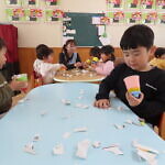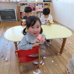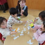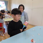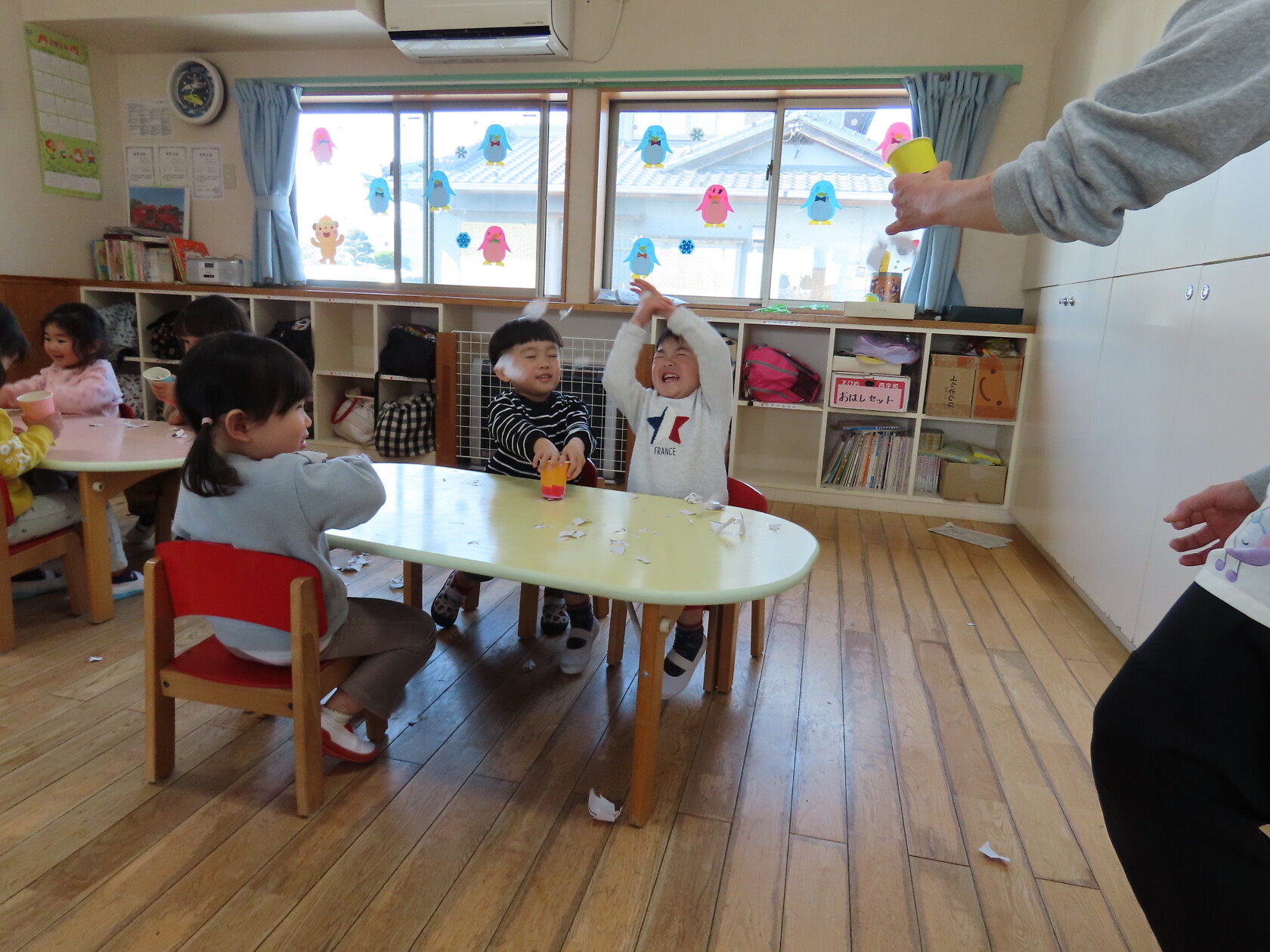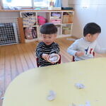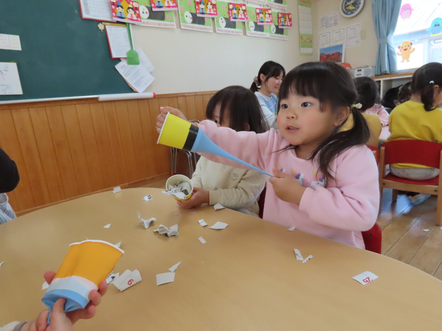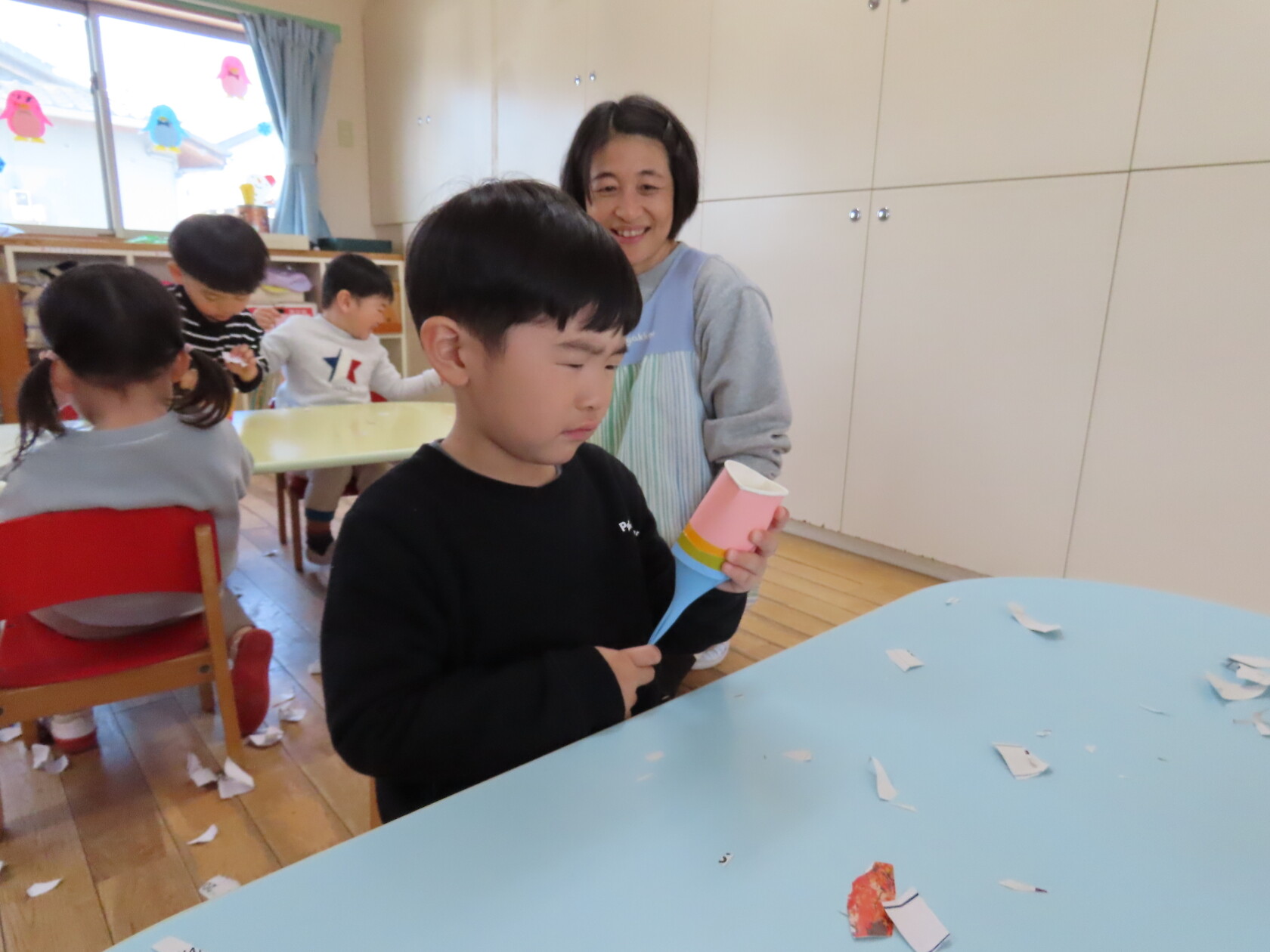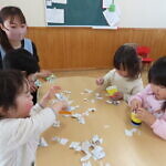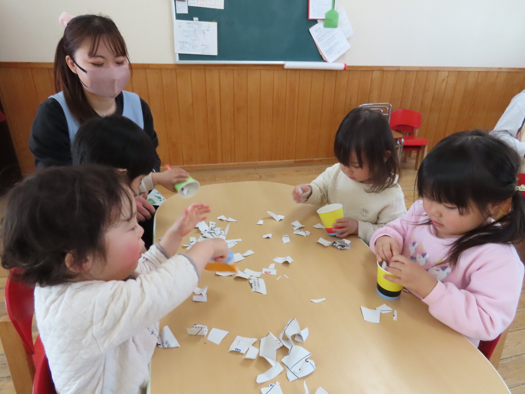 今日のできごと(ちゅうりっぷ) 公開済み: 2024年2月20日更新: 2024年2月20日 毎日、はさみの練習に励んでいるちゅうりっぷぐみ🌷 今日は山型に挑戦し、紙を動かして切る練習をしました。 練習を重ね、はさみの開閉が出来るようになり、線の上を切ることが楽しいようです😁 同時に、危険のないように気をつけながら、お約束を守って行っています⚠ 今日は練習の最後に、使った紙を細かく切って、先生お手製のクラッカーに入れて「パーン」と飛ばして遊びました💕 又、進級に向けてお便り帳や帽子の名前を見て、見つける練習を頑張っています👍 お家でも、色々なお話しを聞いてみて下さいね🎵