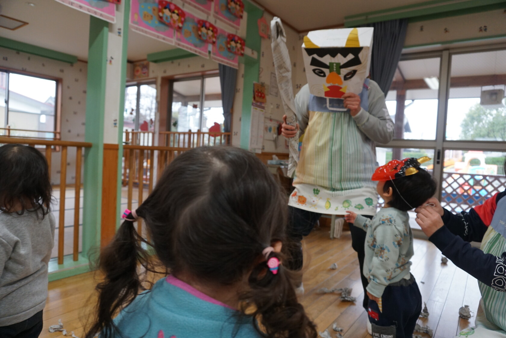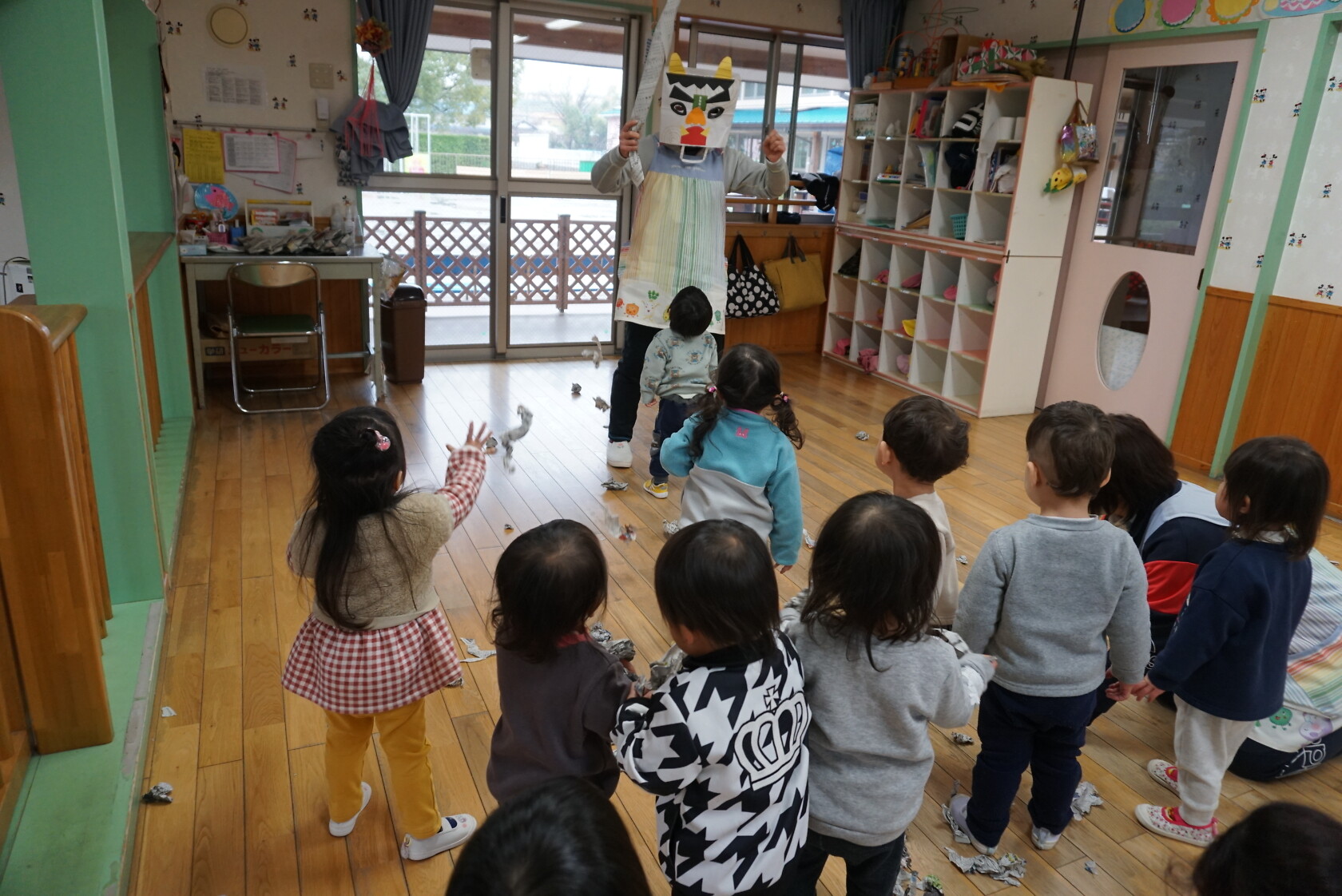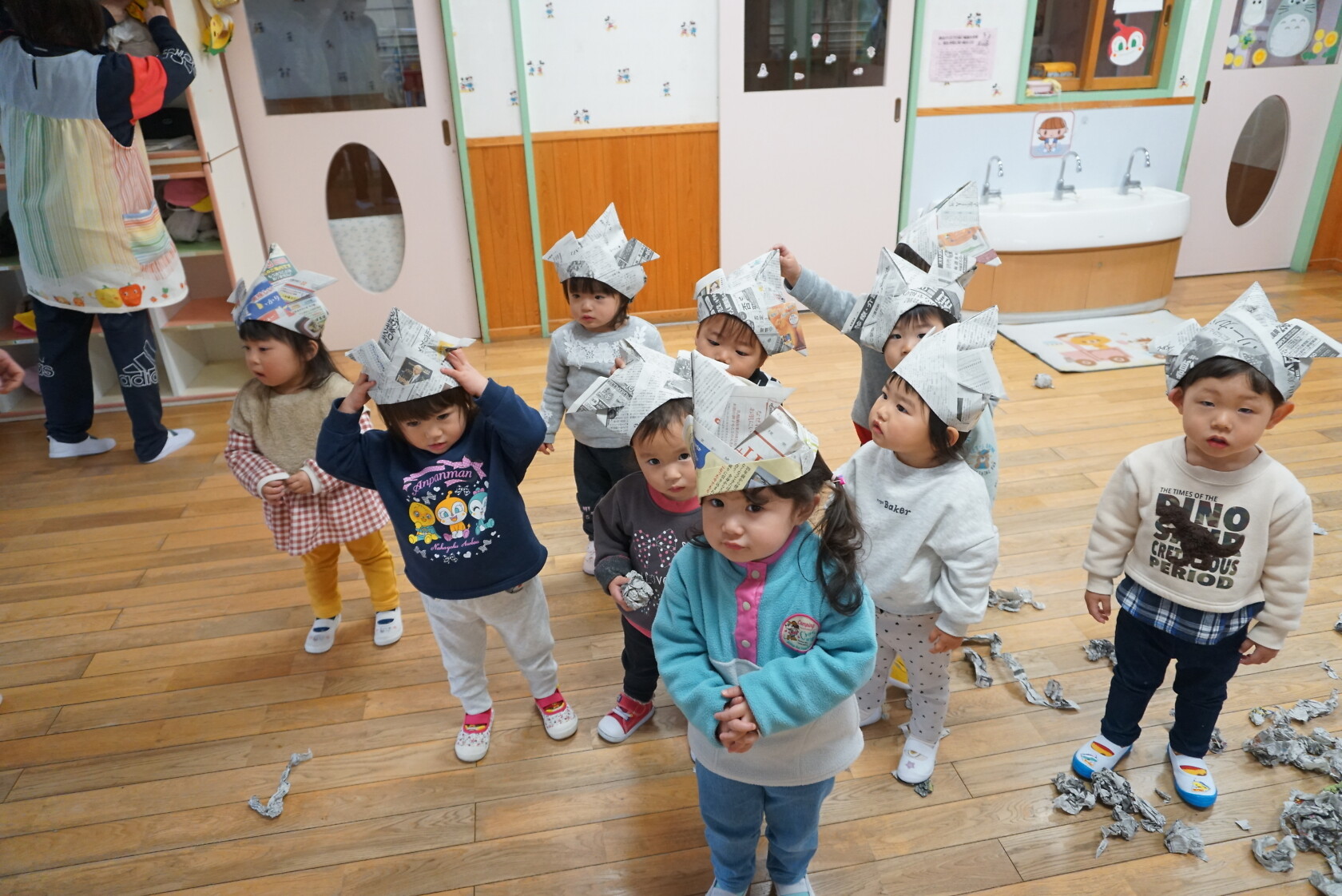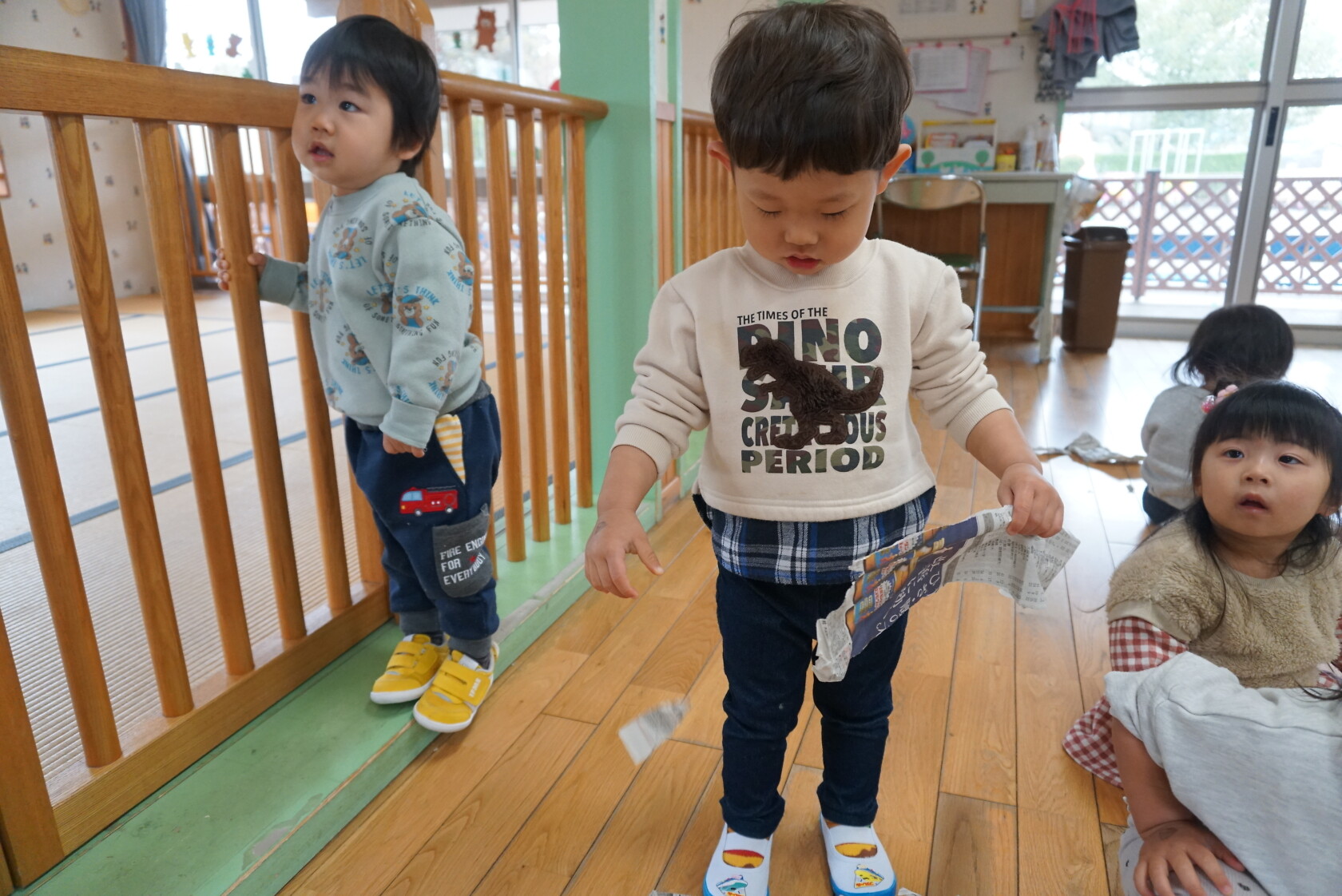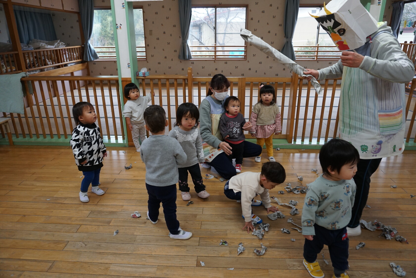 今日のできごと(さくら) 公開済み: 2024年2月22日更新: 2024年2月22日 今日はみんなで新聞紙あそびをしました。 ちぎる、丸める、折る、みんな器用に楽しんでやっている姿が見られました✨ そして~、またまた登場しました!先生鬼!! 二度目の登場で少し慣れたかな⁉丸めた新聞紙を一生懸命投げる子が増えました👏 先生鬼と一緒に子鬼さんも登場し、楽しい時間を過ごしました😊