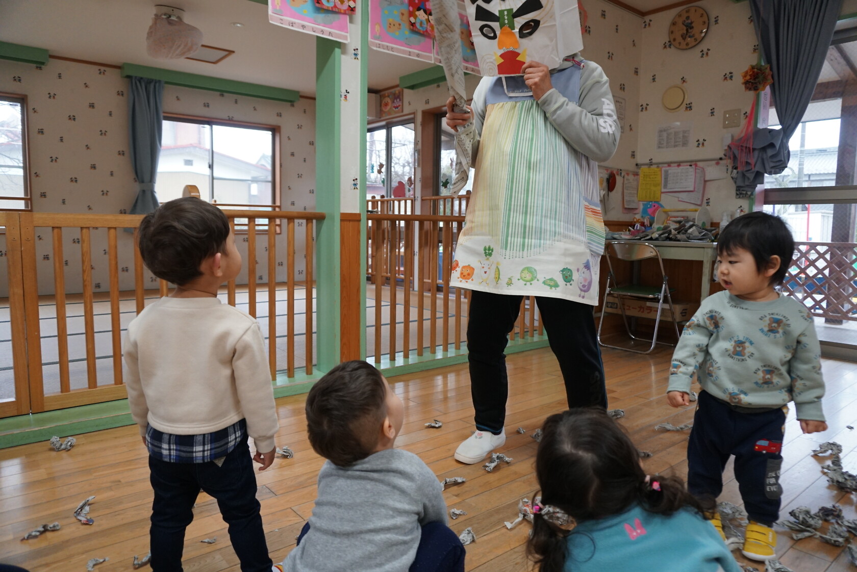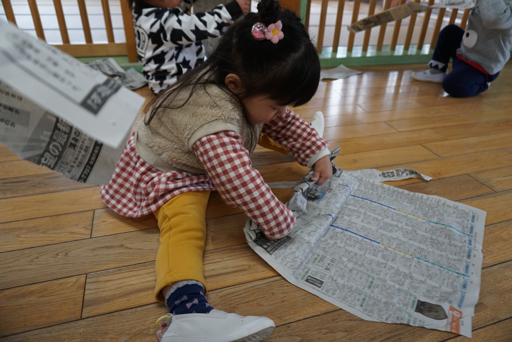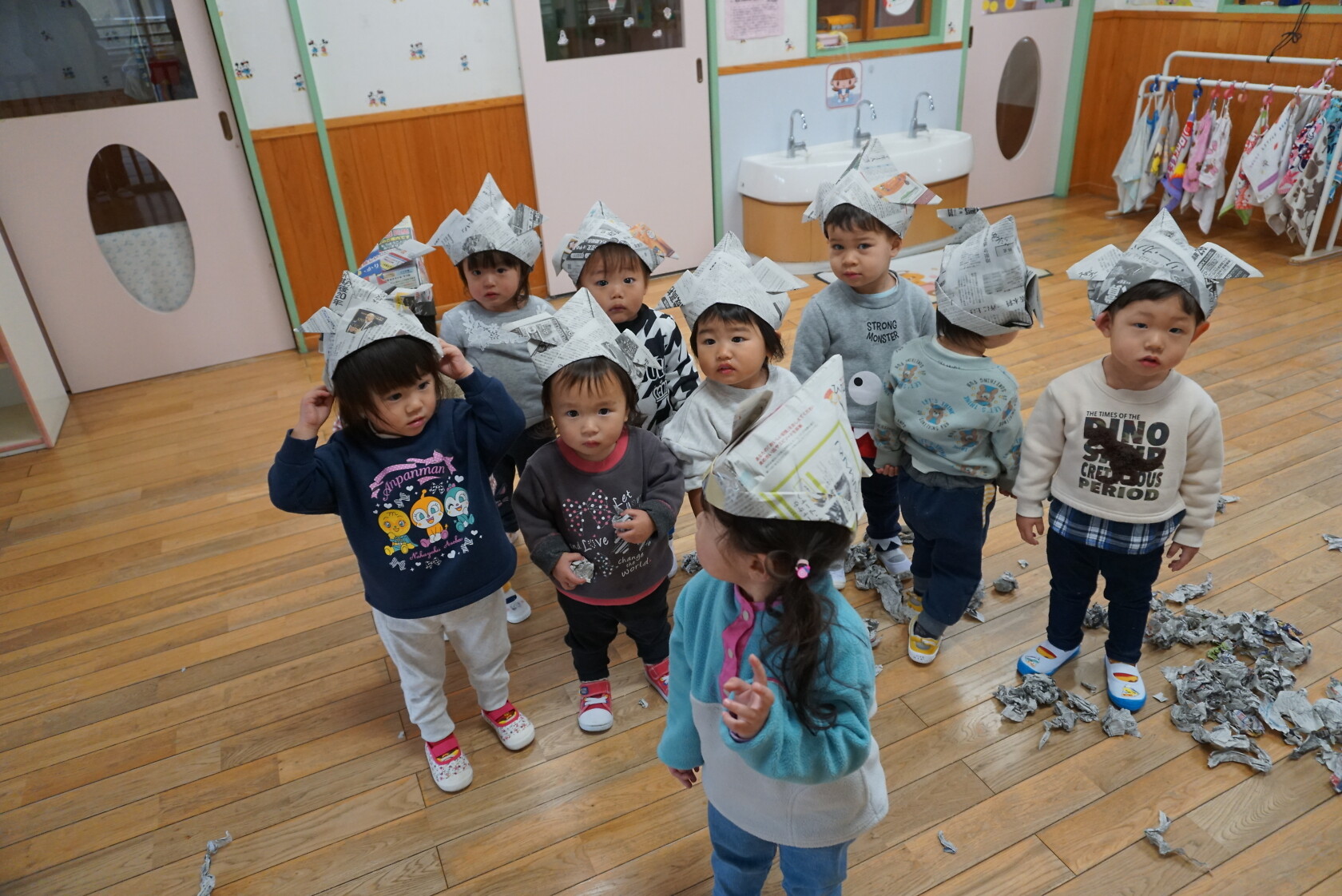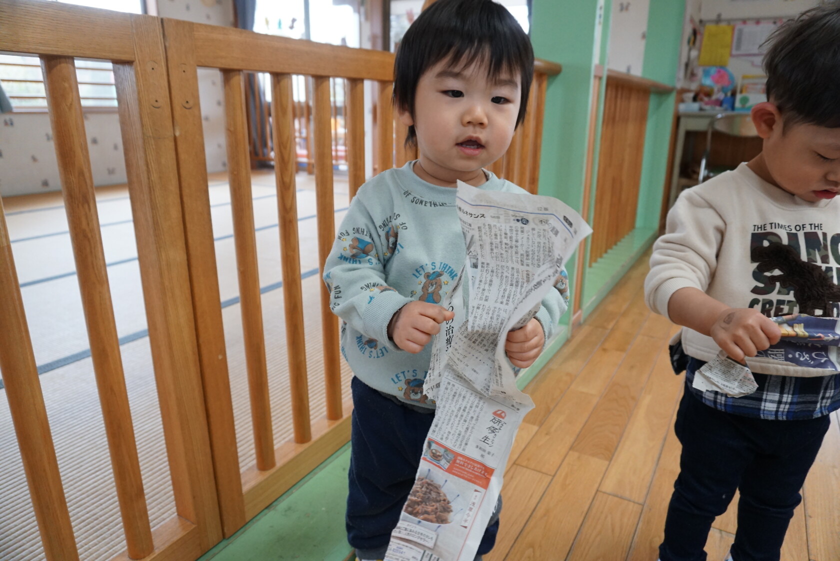 今日のできごと(さくら) 公開済み: 2024年2月22日更新: 2024年2月22日 今日はみんなで新聞紙あそびをしました。 ちぎる、丸める、折る、みんな器用に楽しんでやっている姿が見られました✨ そして~、またまた登場しました!先生鬼!! 二度目の登場で少し慣れたかな⁉丸めた新聞紙を一生懸命投げる子が増えました👏 先生鬼と一緒に子鬼さんも登場し、楽しい時間を過ごしました😊
