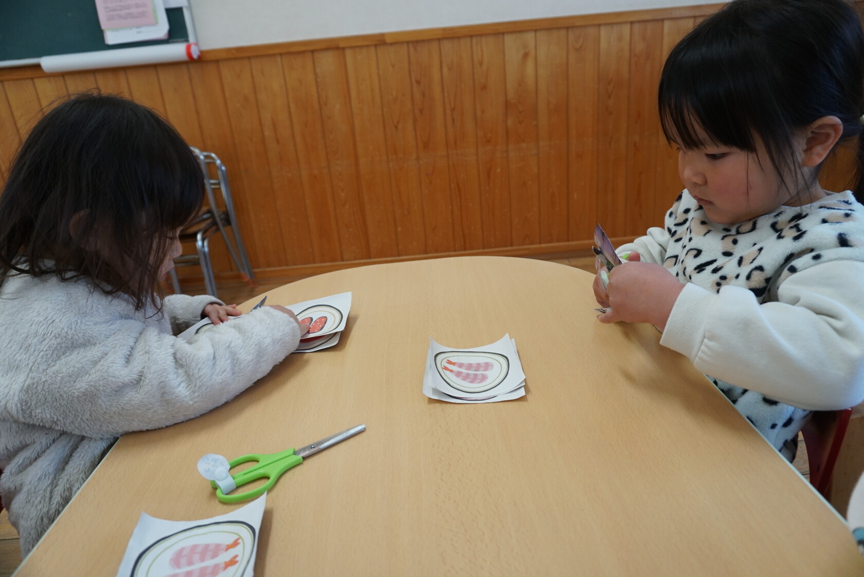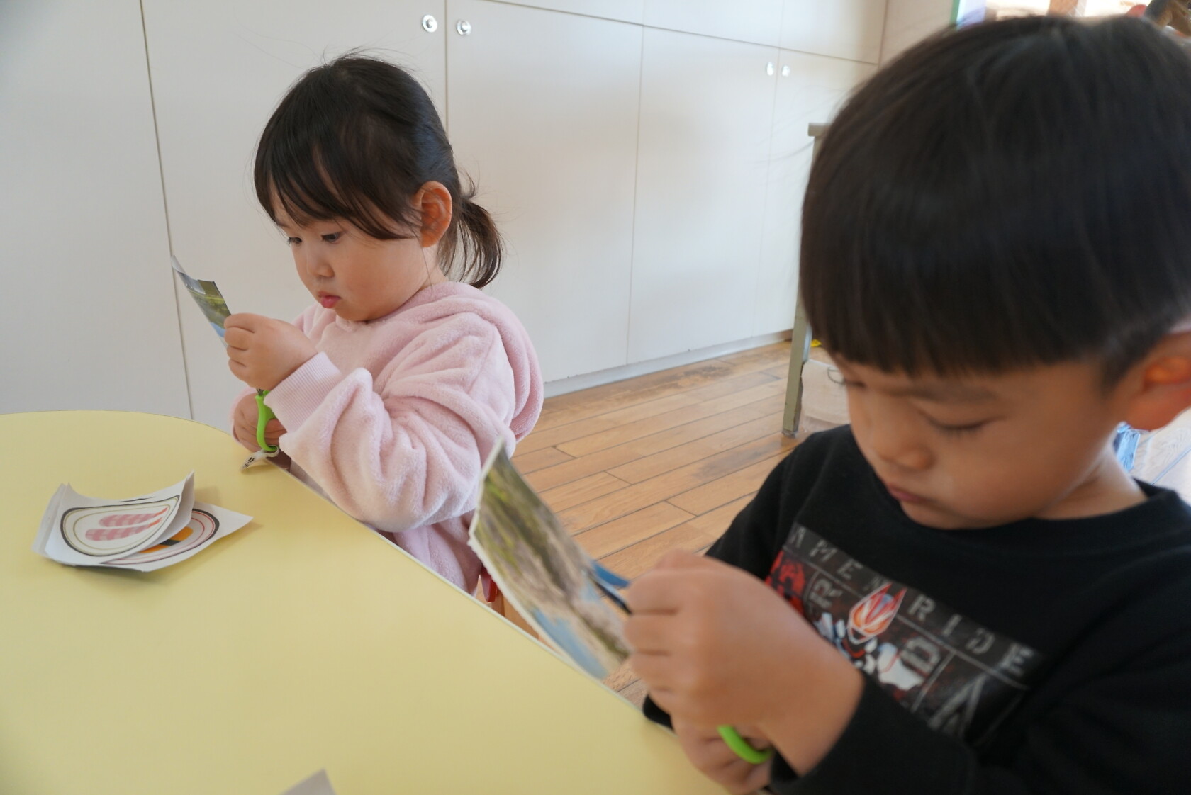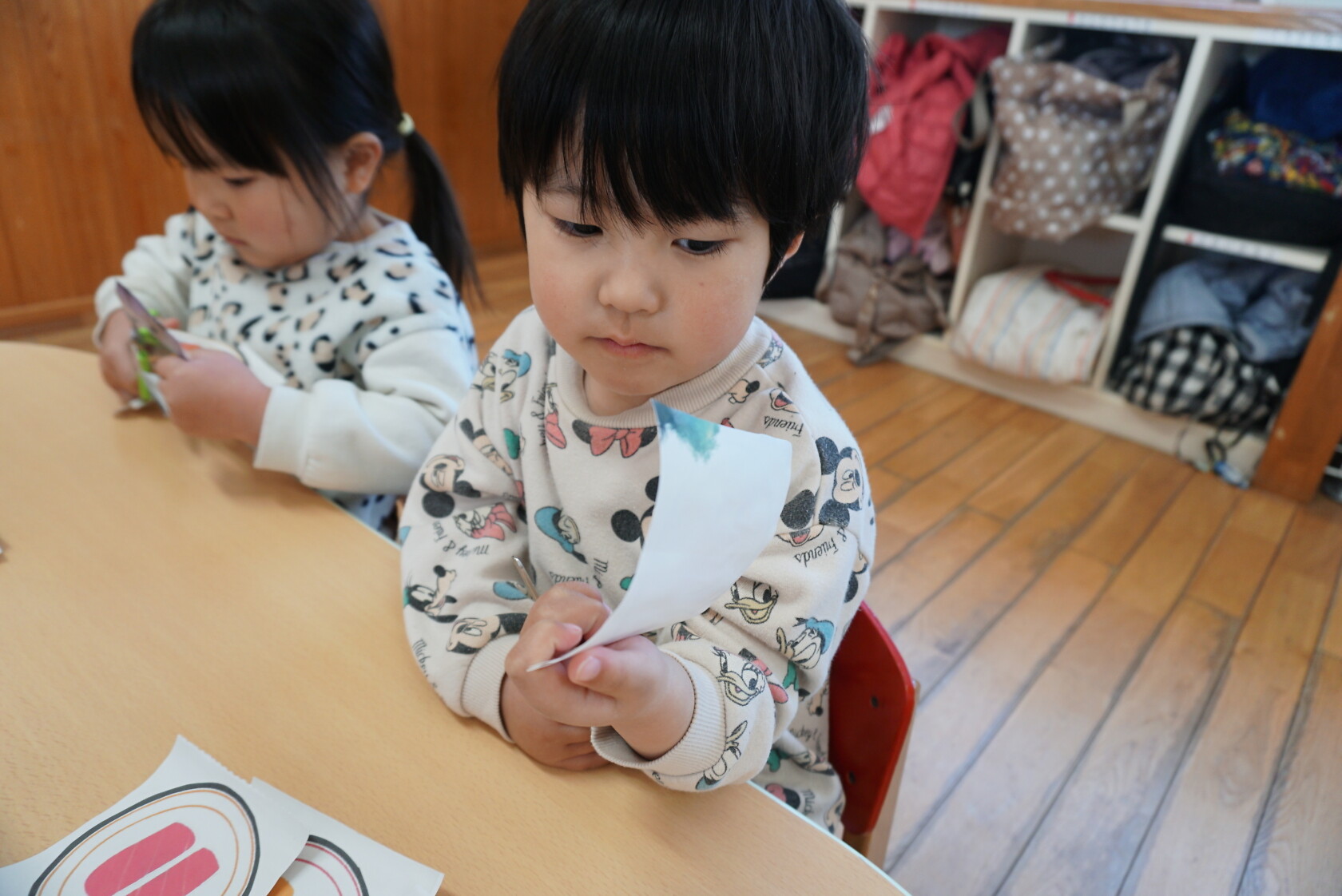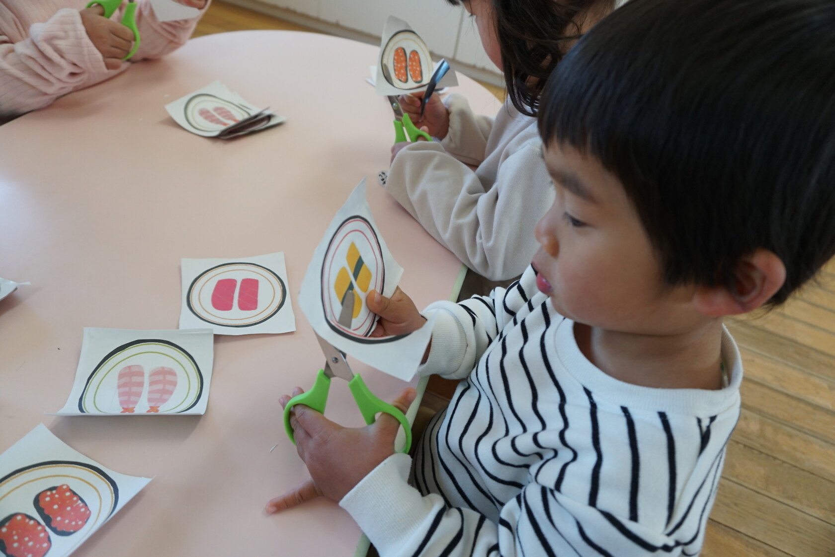 今日のできごと(さくら・ちゅうりっぷ・小規模ちゅうりっぷ) 公開済み: 2024年3月18日更新: 2024年3月18日 進級に向け、はさみの練習を頑張っているちゅうりっぷ組🌷 今日は、お寿司のお皿(丸型)を切る練習をしました。 お寿司がこぼれないようにと、真剣にハサミを使う子ども達は職人の目です🍣 丁度切り終わる頃、さくら組さんが遊びに来てくれたので、みんなで一緒にお寿司を食べることにしたのですが、自分の分をさくら組さんや先生に分けてあげたりと、お兄さん・お姉さんらしい表情を見せてくれました😊✨ さくら組さんも「もうすぐ、ちゅうりっぷ組さんになるの?」と聞くと、頷きながらお片づけまで上手にしてくれました👏