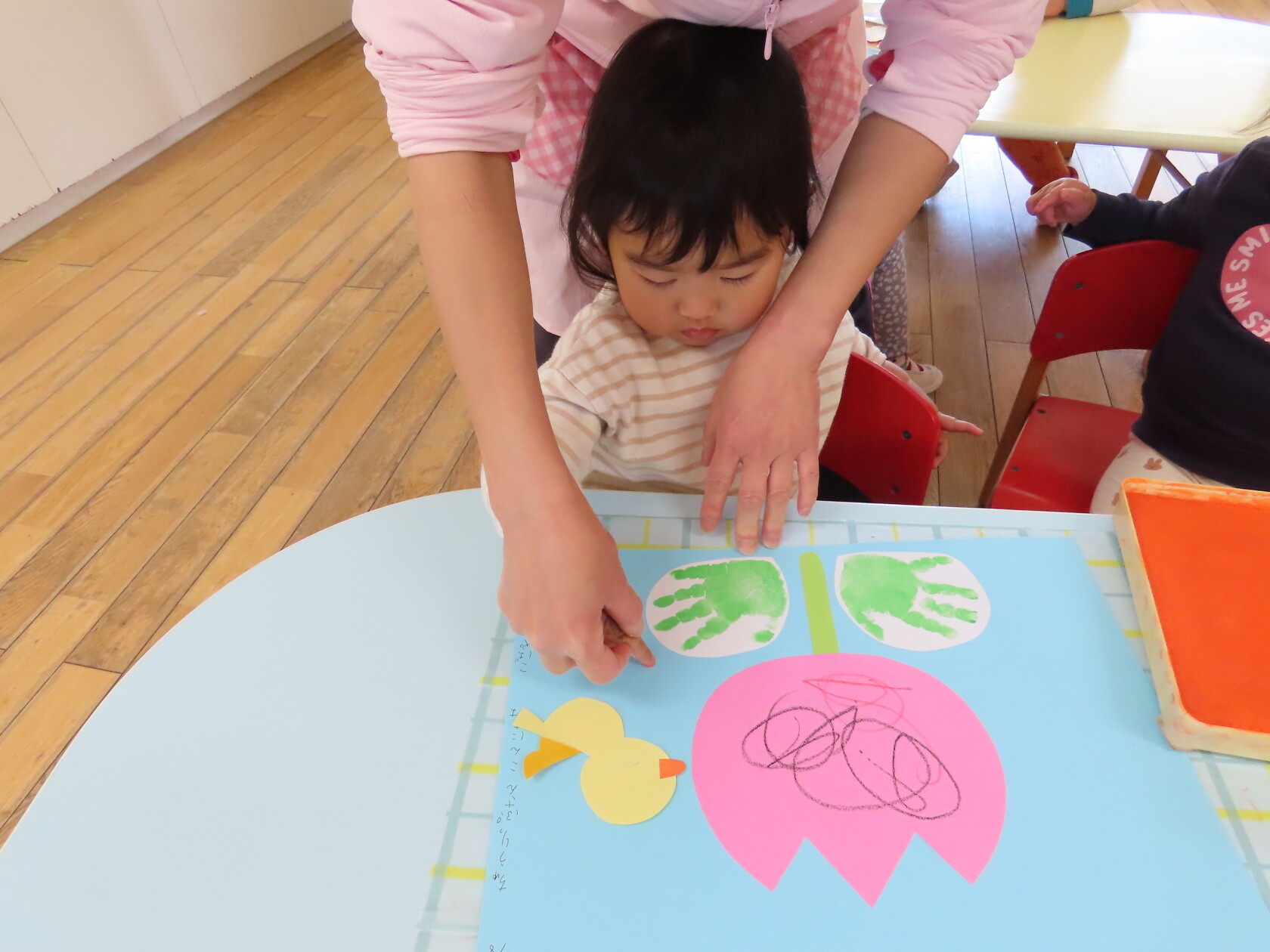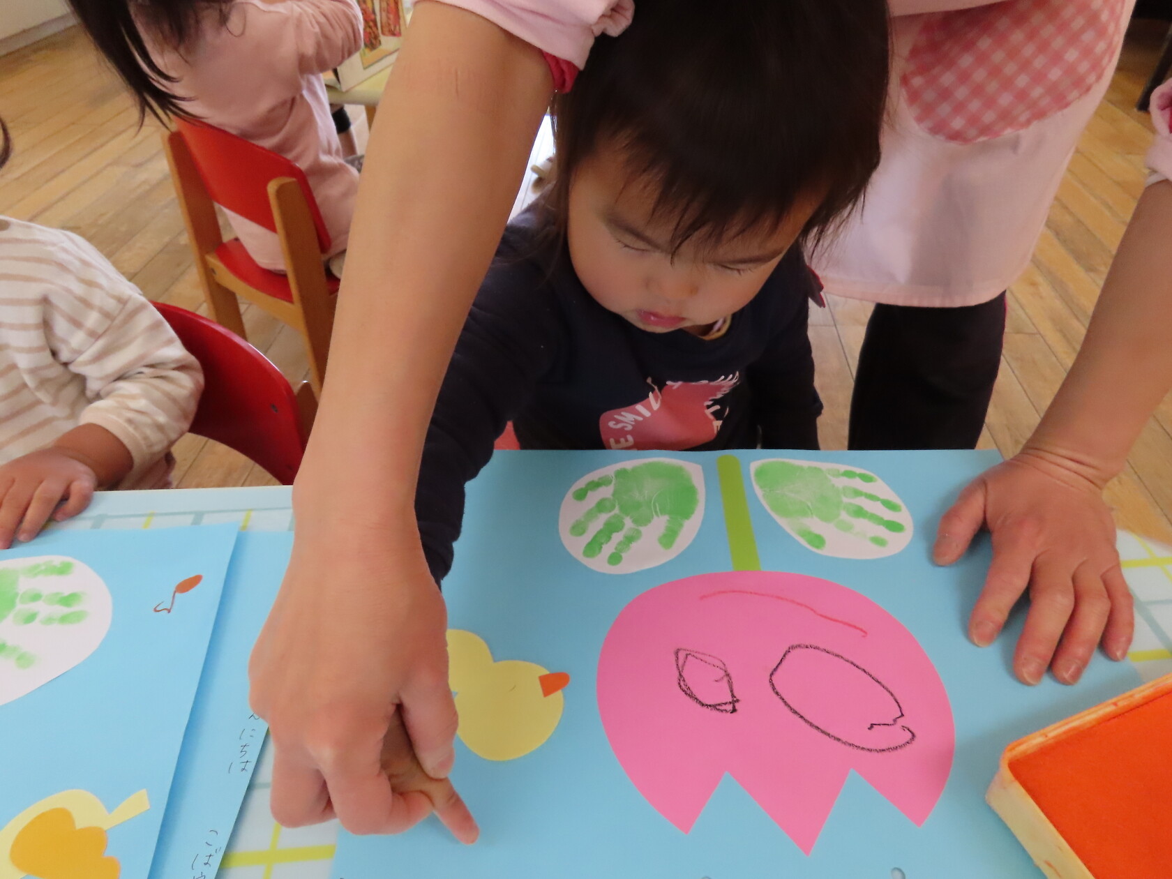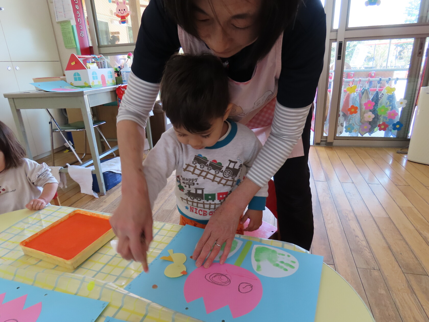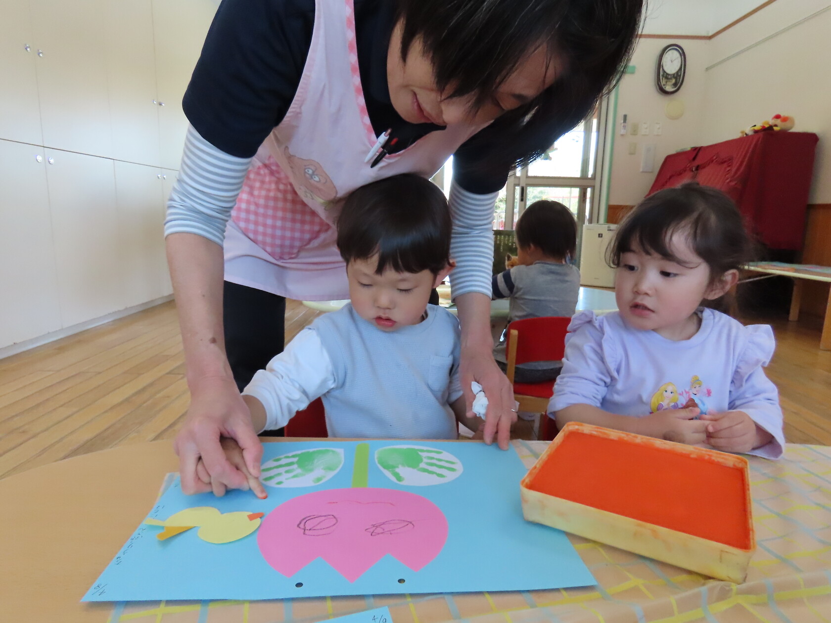 今日のできごと(ちゅうりっぷ) 公開済み: 2024年4月10日更新: 2024年4月10日 入園、進級して早10日が経ちました。 子ども達も新しい環境になれ、ロッカーや下駄箱など 自分の場所を覚えてきました👏 今日は、4月の製作の指押しスタンプをしました。 できあがりが楽しみです!😊✨