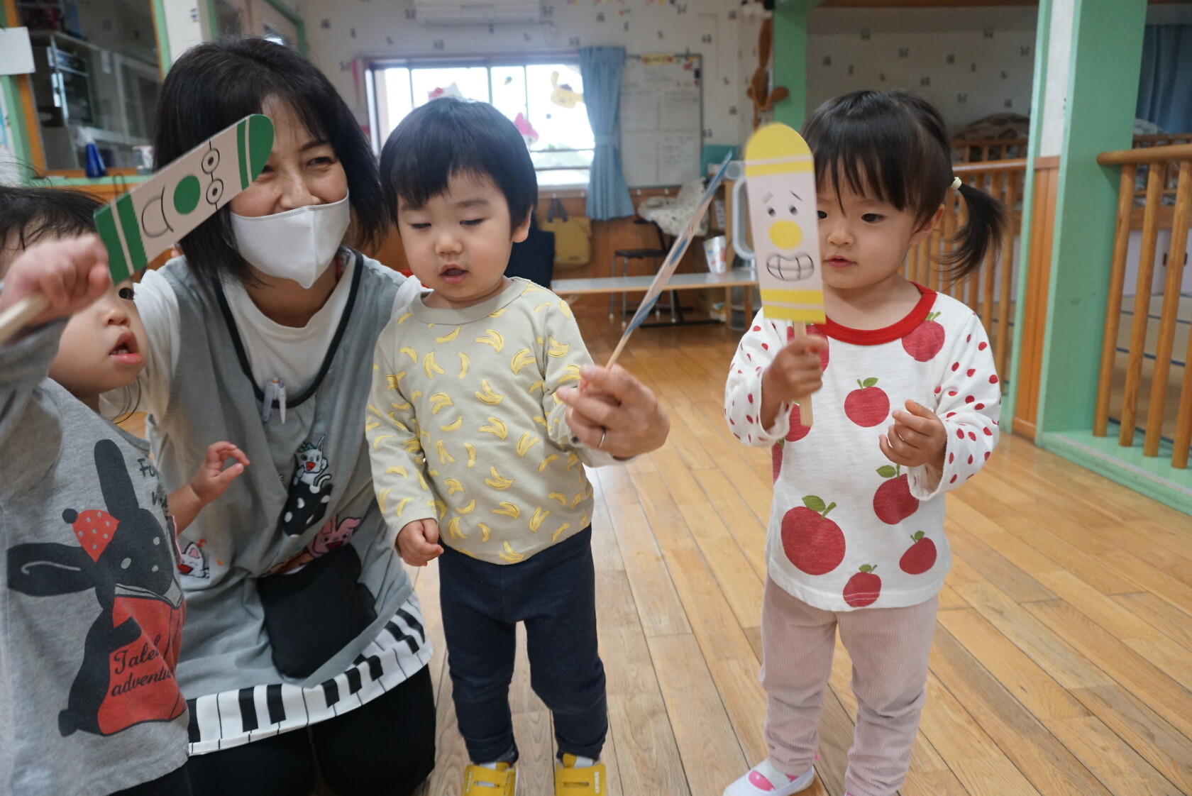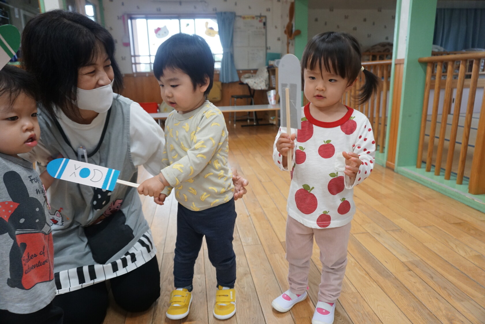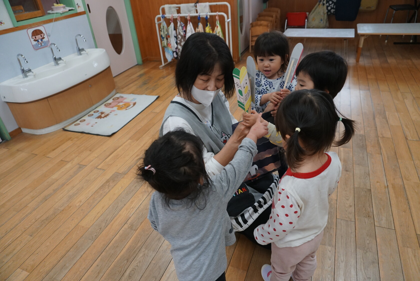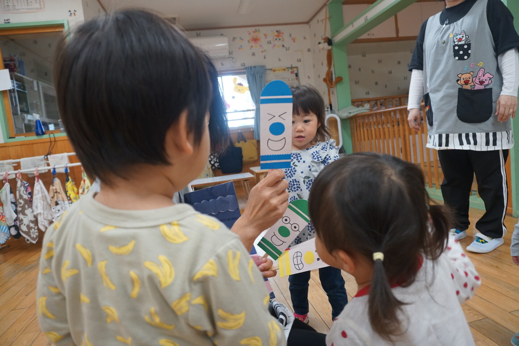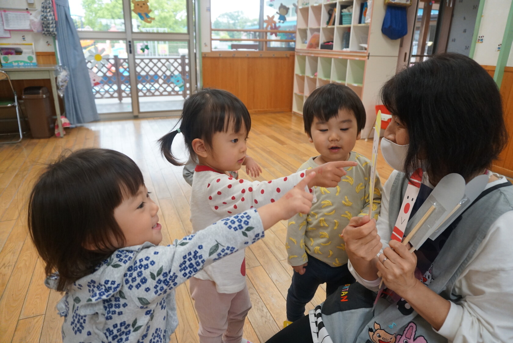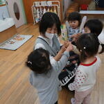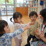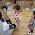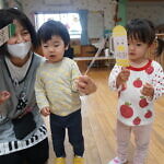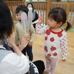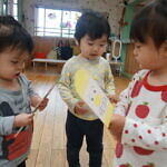 今日のできごと(さくら) 公開済み: 2024年5月7日更新: 2024年5月7日 ゴールデンウィークが明け、今日はみんなのニコニコ笑顔が見られホッとしています。お休み中は、ご家族でゆっくり過ごせたようですね😊 今日はお部屋での様子をパシャリッ📸「どんな色がすき」の曲に合わせてみんなでペープサートをしました!!曲に合わせてふってみたり、色を覚えることもできるので一緒に口にだして言いながら楽しむことが出来ました。 0歳児さんも、畳の部屋を自由に動いて遊び、呼びかけにニコニコ笑顔をふりまいてくれるようになりました!!