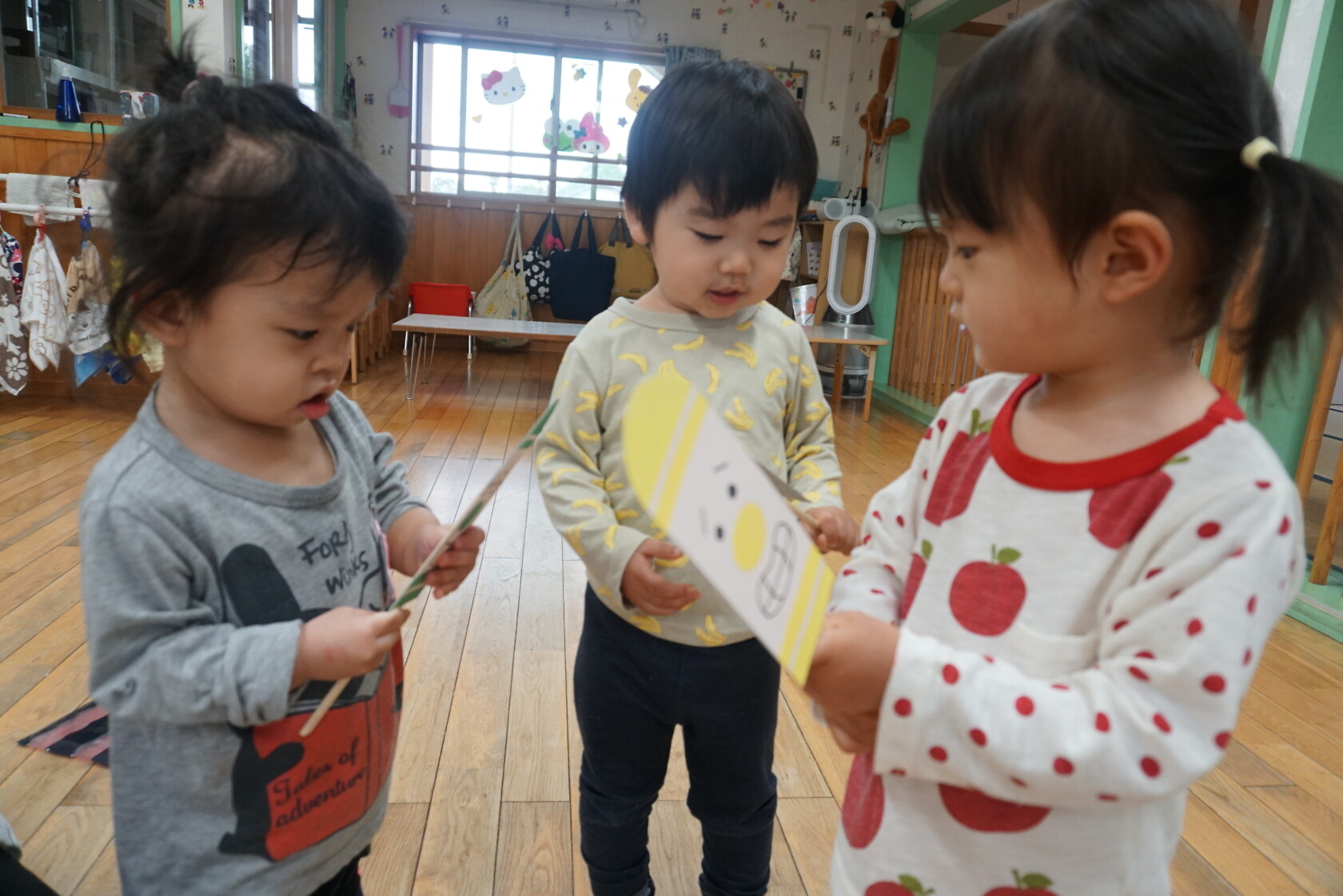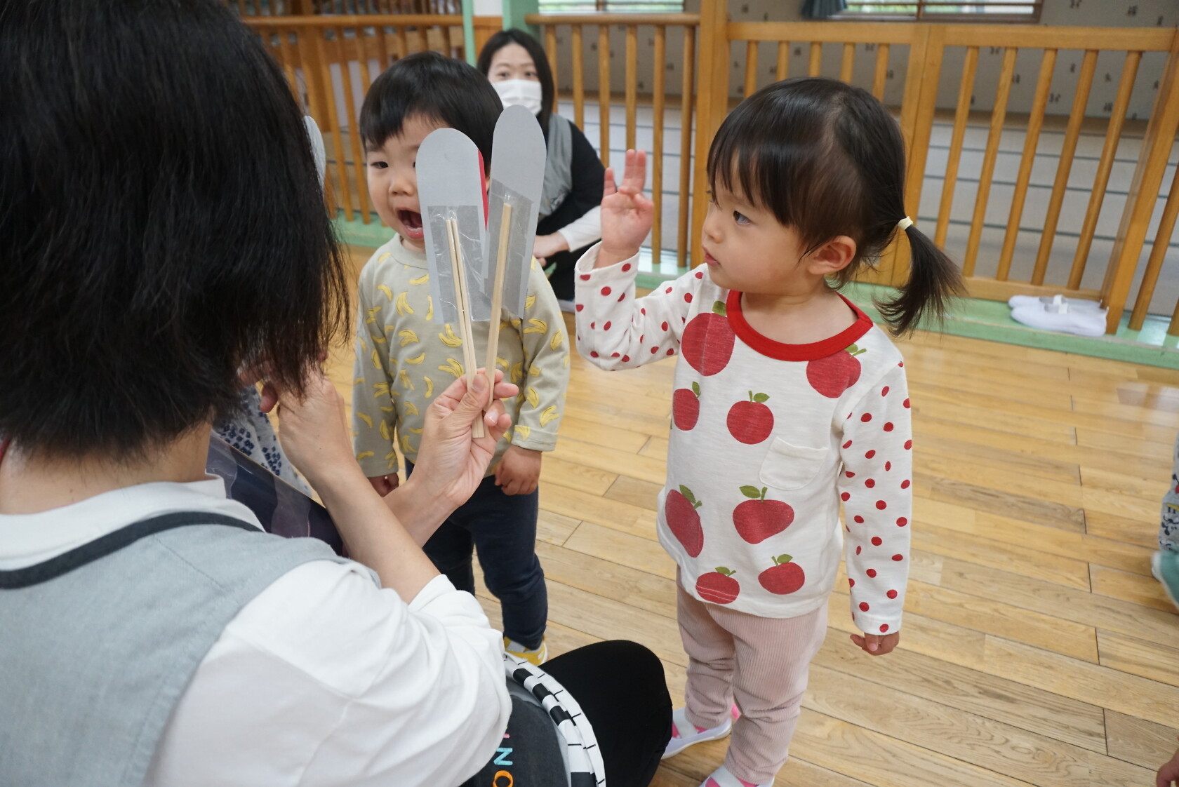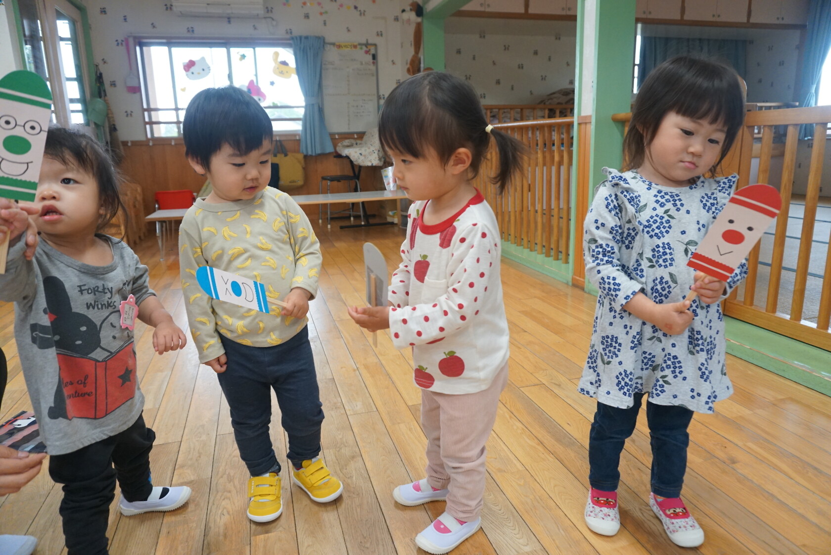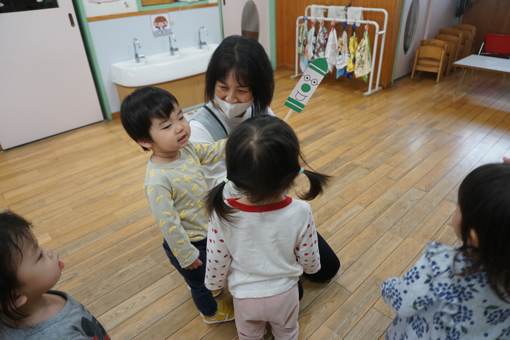 今日のできごと(さくら) 公開済み: 2024年5月7日更新: 2024年5月7日 ゴールデンウィークが明け、今日はみんなのニコニコ笑顔が見られホッとしています。お休み中は、ご家族でゆっくり過ごせたようですね😊 今日はお部屋での様子をパシャリッ📸「どんな色がすき」の曲に合わせてみんなでペープサートをしました!!曲に合わせてふってみたり、色を覚えることもできるので一緒に口にだして言いながら楽しむことが出来ました。 0歳児さんも、畳の部屋を自由に動いて遊び、呼びかけにニコニコ笑顔をふりまいてくれるようになりました!!